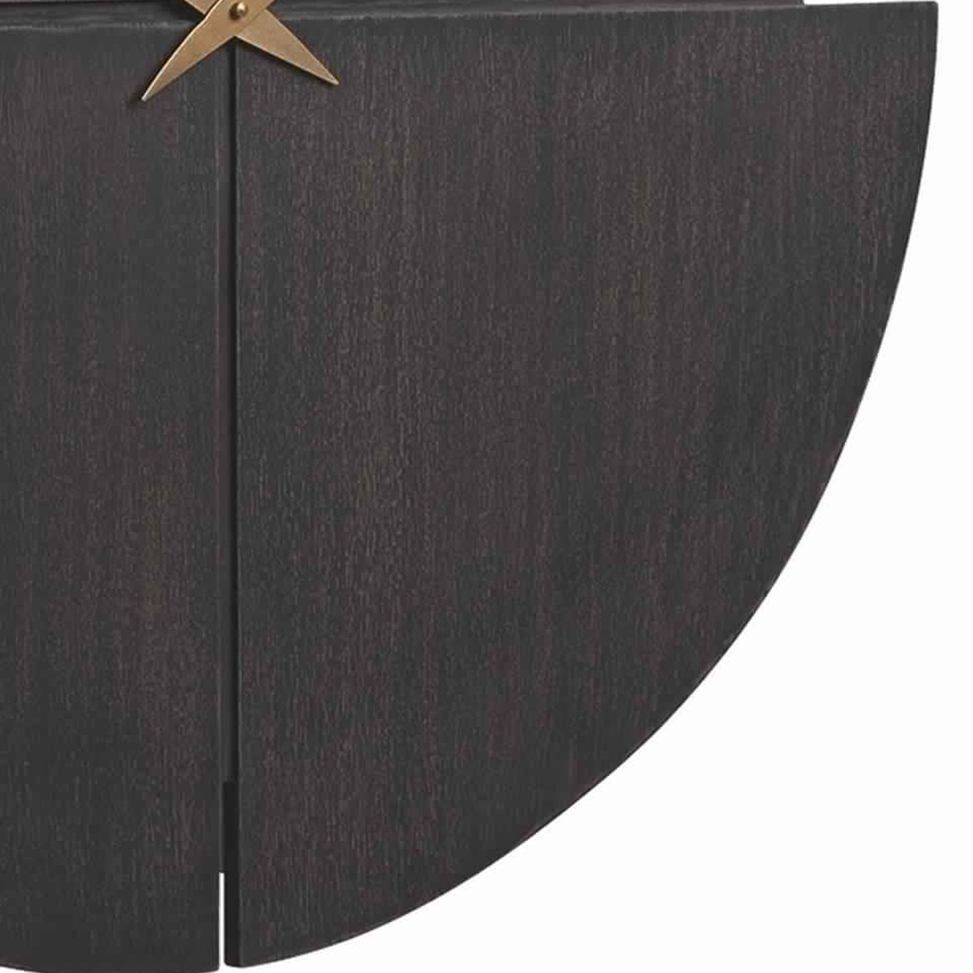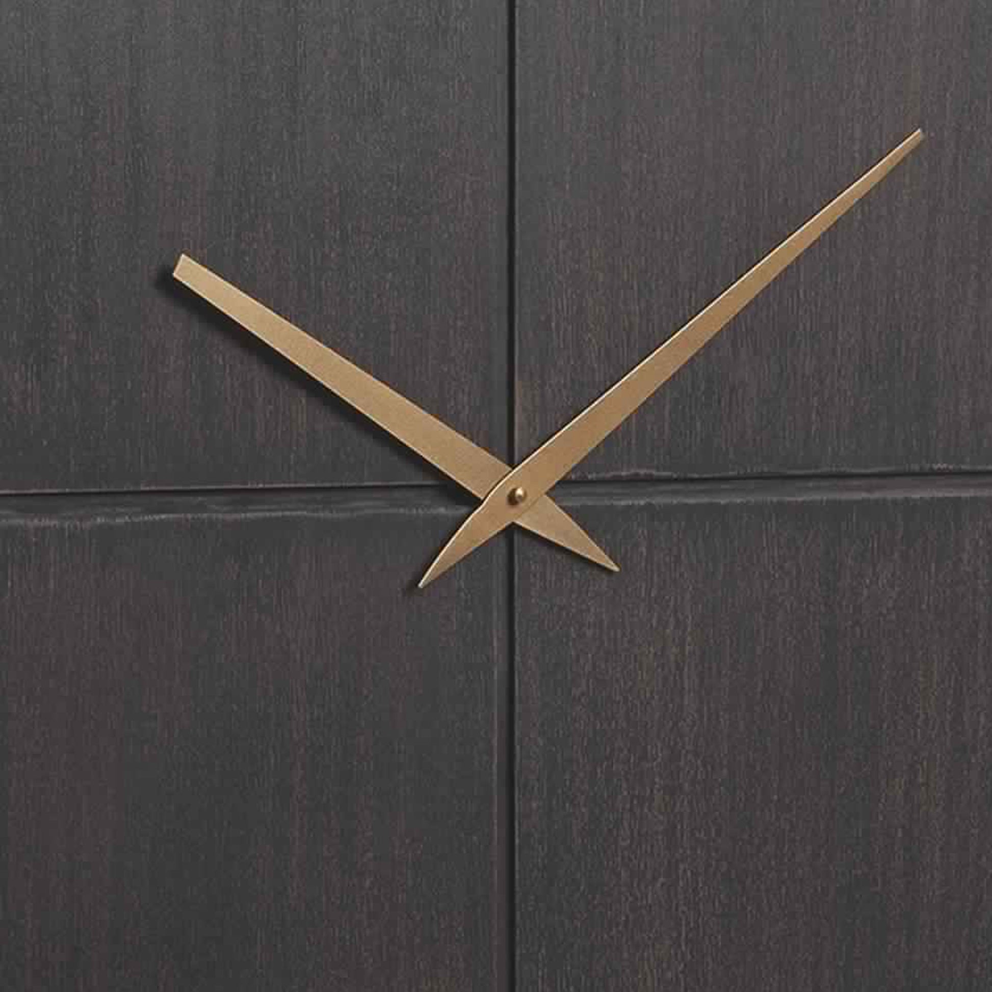 Create a contemporary focal point in your living room with the addition of this Wall Clock in space. It features a round wooden panel design backing with the small cut outs depicting small cardinal position while the gold polished metal hands add a dash of stylish flair. The quartz movement keeps this piece on time, this analog clock makes timekeeping simple.