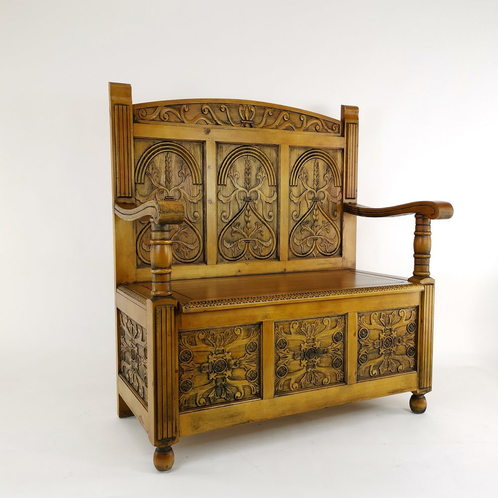 Welcome additional storage space to your mudroom, entryway or hall by adding this Royal Bench as dual functional piece of furniture. This storage bench has a wonderful carving that sits on beautiful turned bun feet. The seat on this wooden bench lifts to hid or hold blanket, sweaters, shoes or bags anything that needs to be near a front door or living room.
