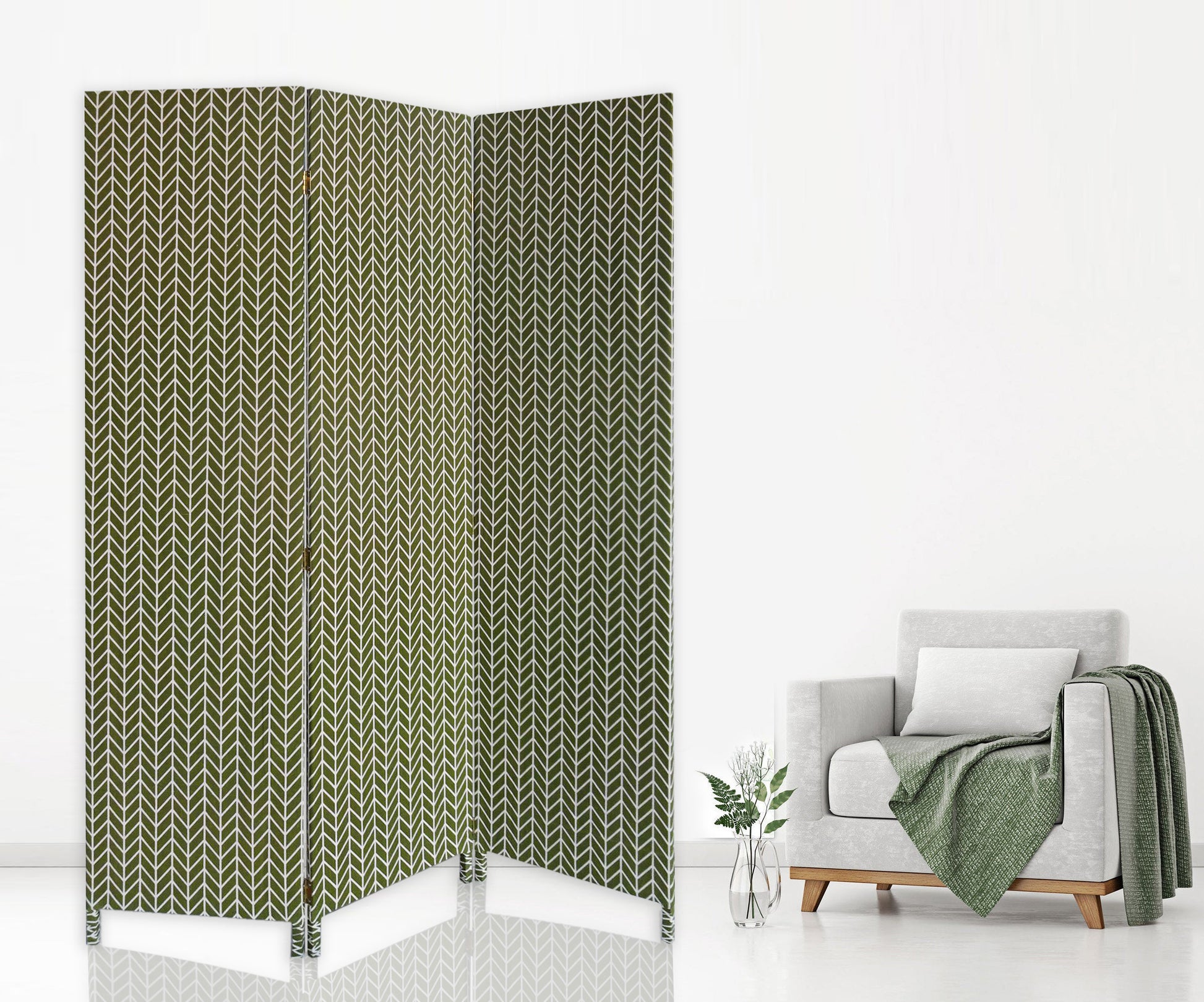 Screen Gems 3 Panel Fabric Oliver Screen, this room divider is great for sectioning off any space in any room and serves as a beautiful accent. Constructed from solid wood panels with a soft fabric finish. The soft fabric features an olive green chevron pattern that creates an attractive contemporary design. This room divider is an excellent item to have in your home or any place, it is transitional, very light-weight and easy to store.