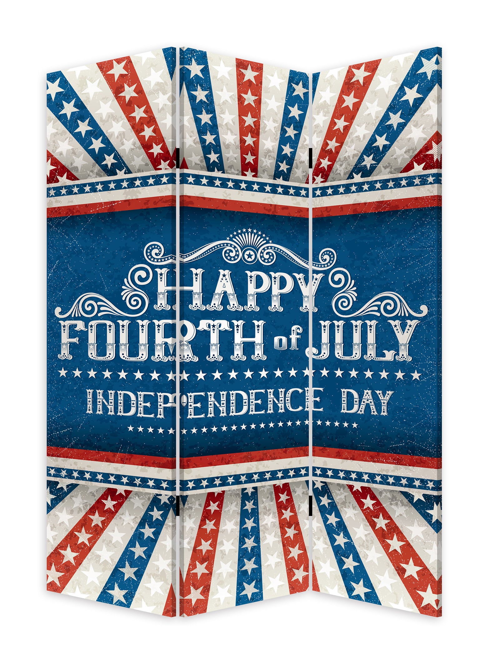 Screen Gems 4th of July Screen SG-396, bringing on the holiday cheer! Independence Day themed room divider is screen printed on canvas, featuring cheerful 4th of July inspired designs. The screen is two sided with different and complementary images on each side. It is light weight and very easy to move. Can also serve as a unique wall art or headboard. One price gets two different finishes, Switch sides to get a fresh look because each side finishs with different scenery