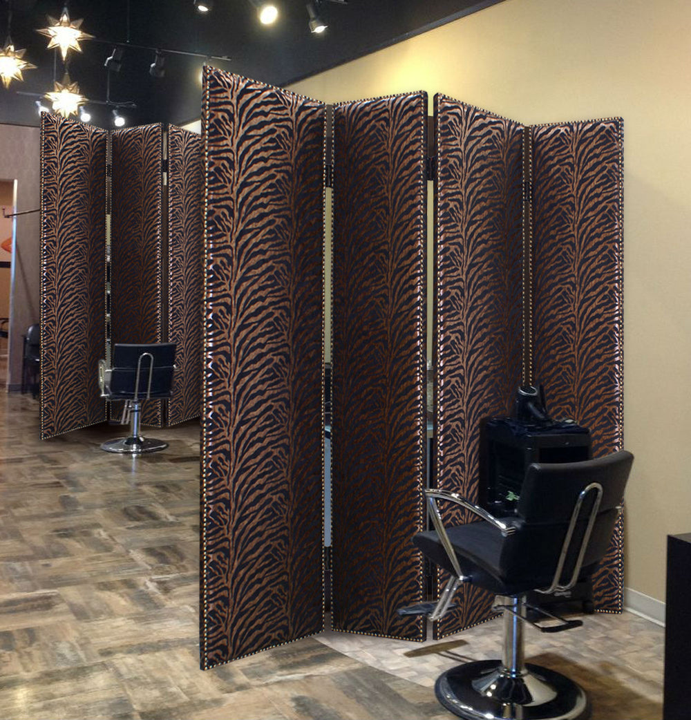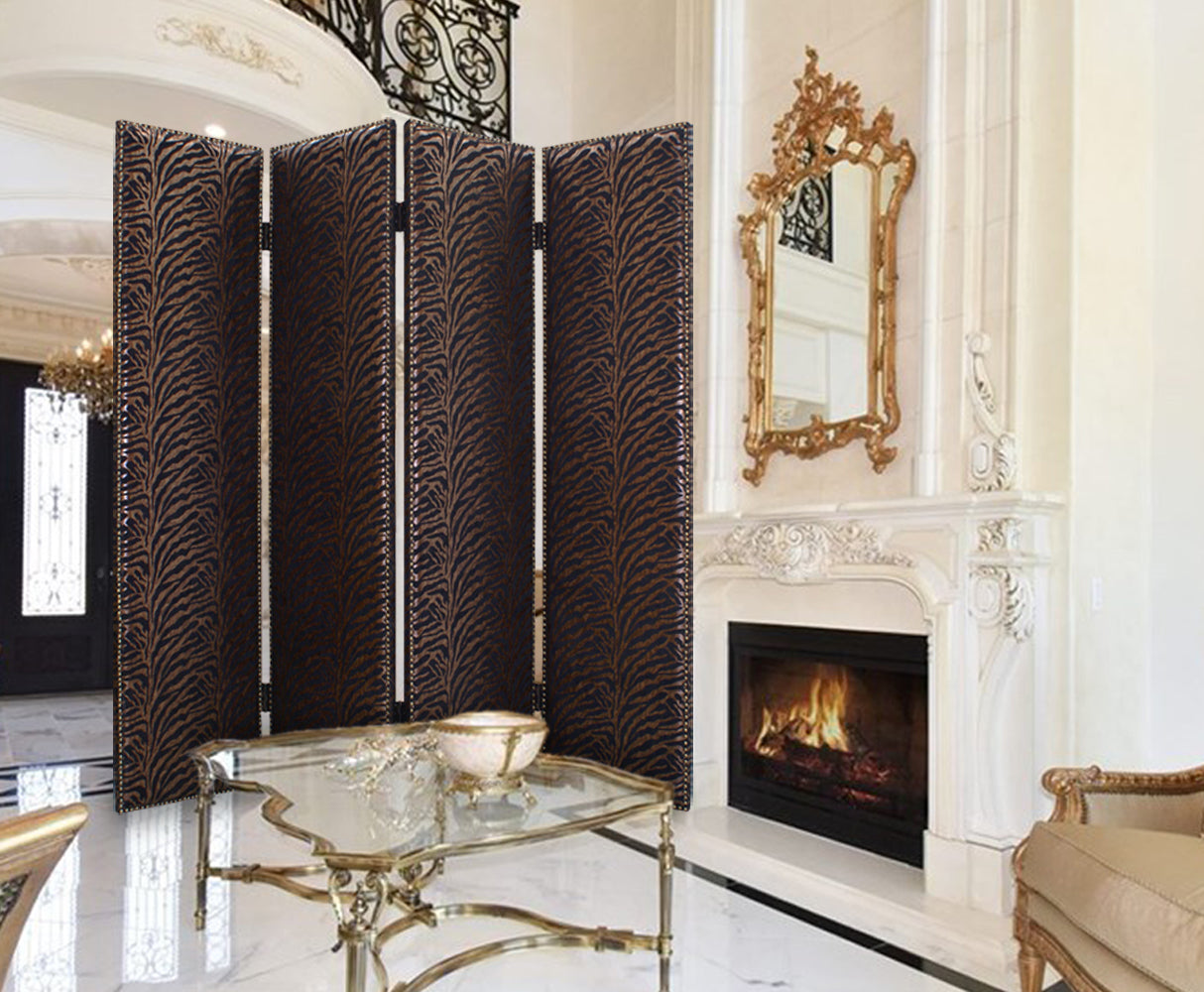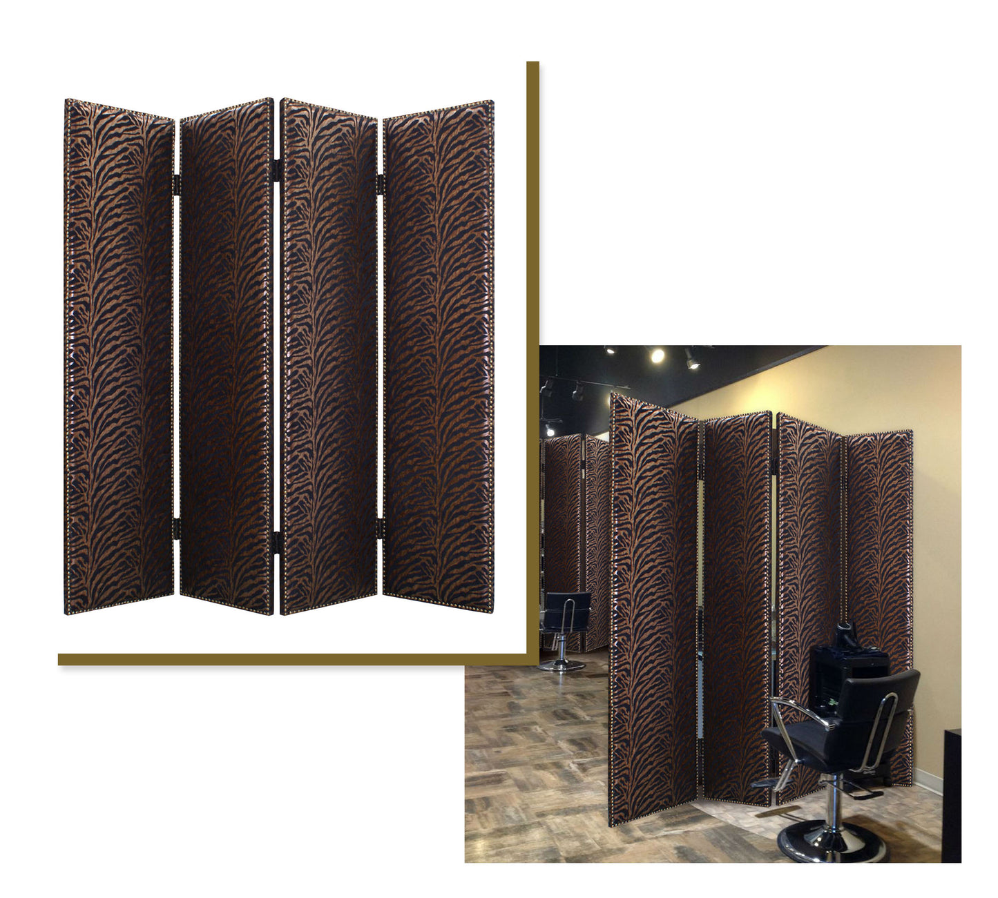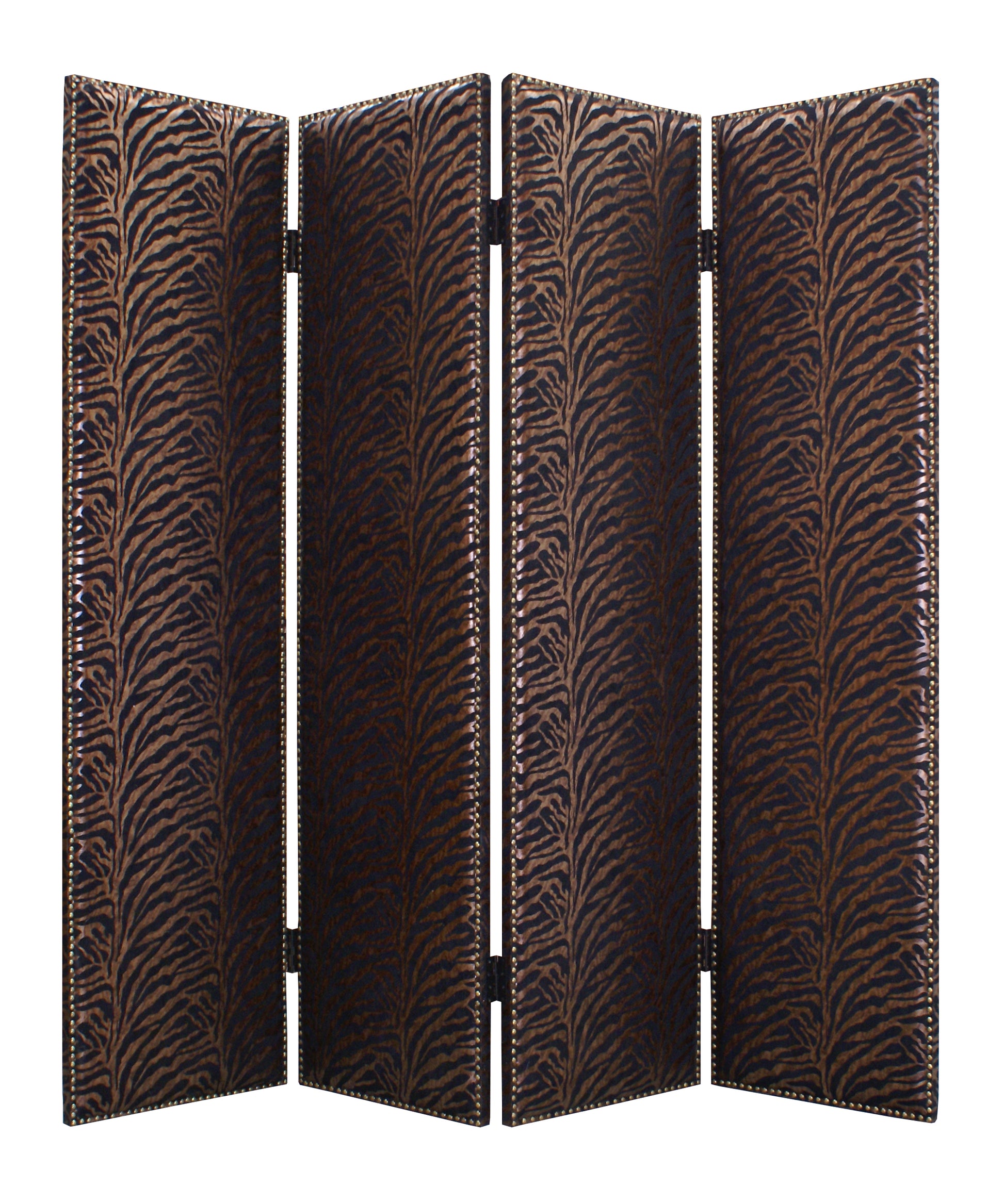 The Azykkuab is a high-design, 4-panel screen. Each panel is stylishly designed with high-quantity fabric, all surrounded by nail head accents. This handmade screen is finished on both sides.