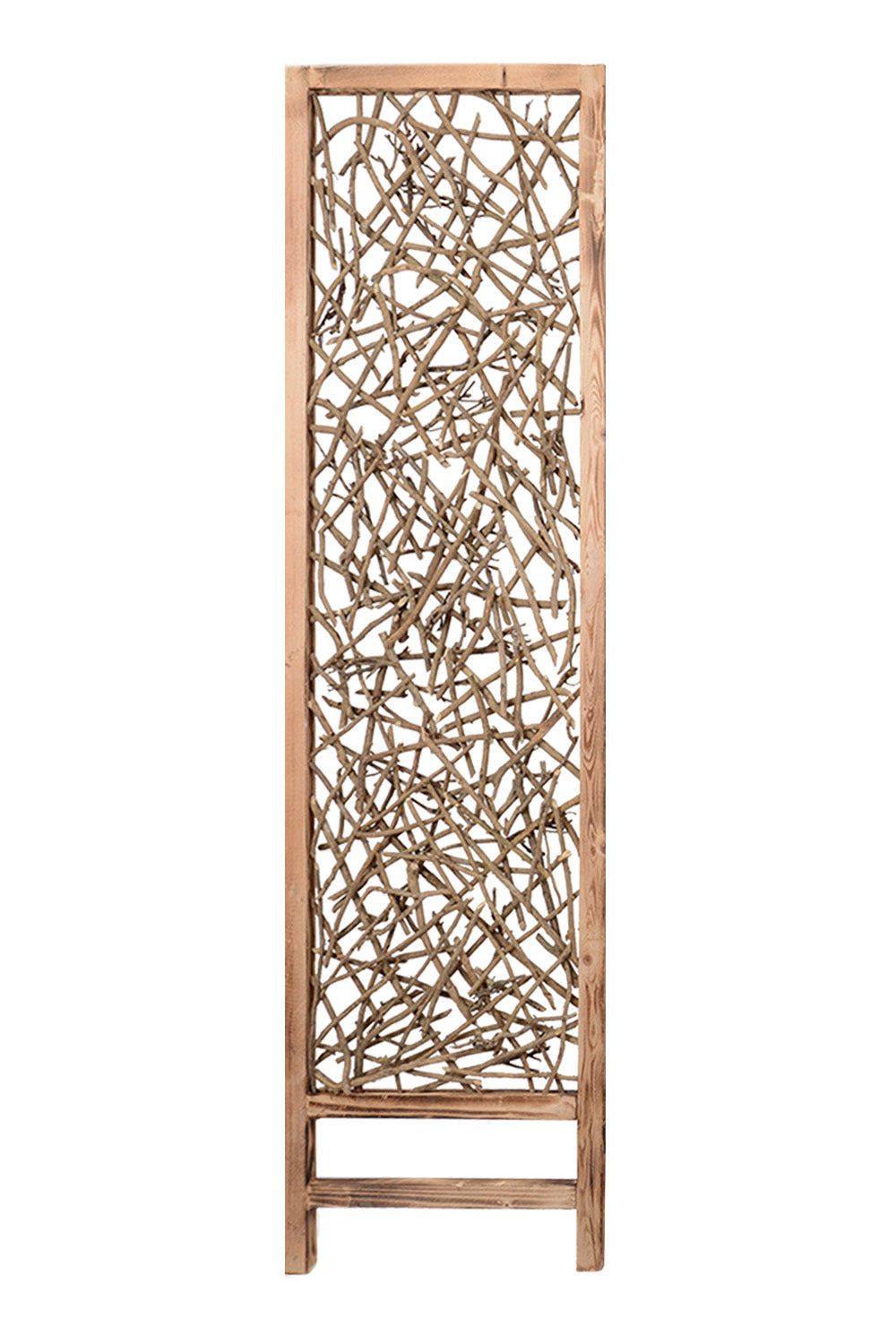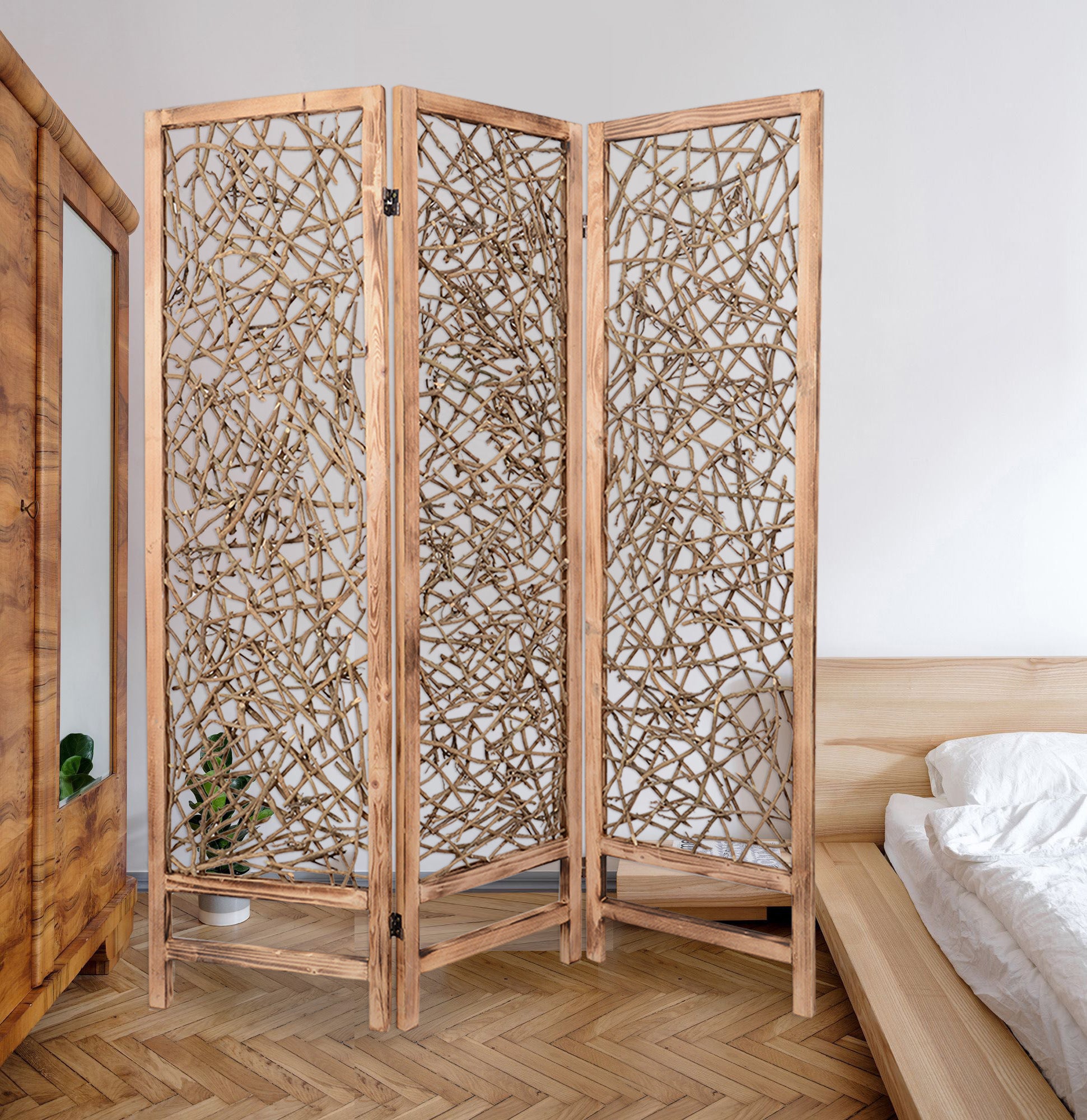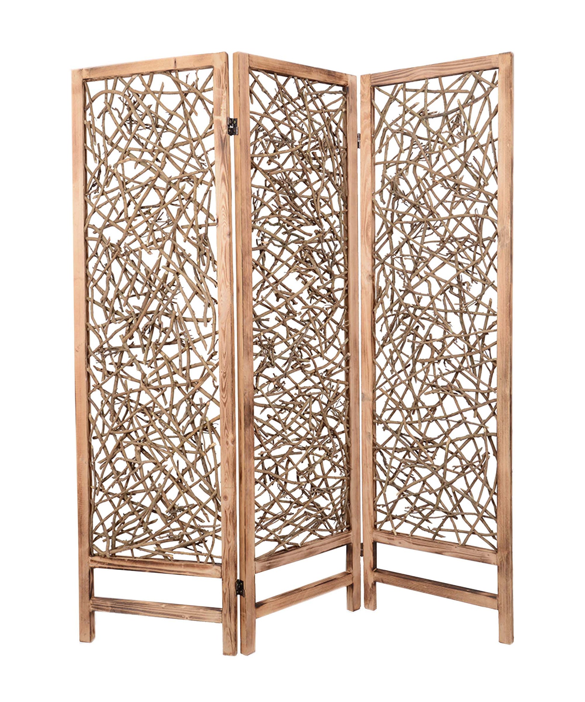 3 panel foldable screen. Wood frame with decorative willow branches inset, a distinctive decorative accent that brings a natural touch to your décor. 3