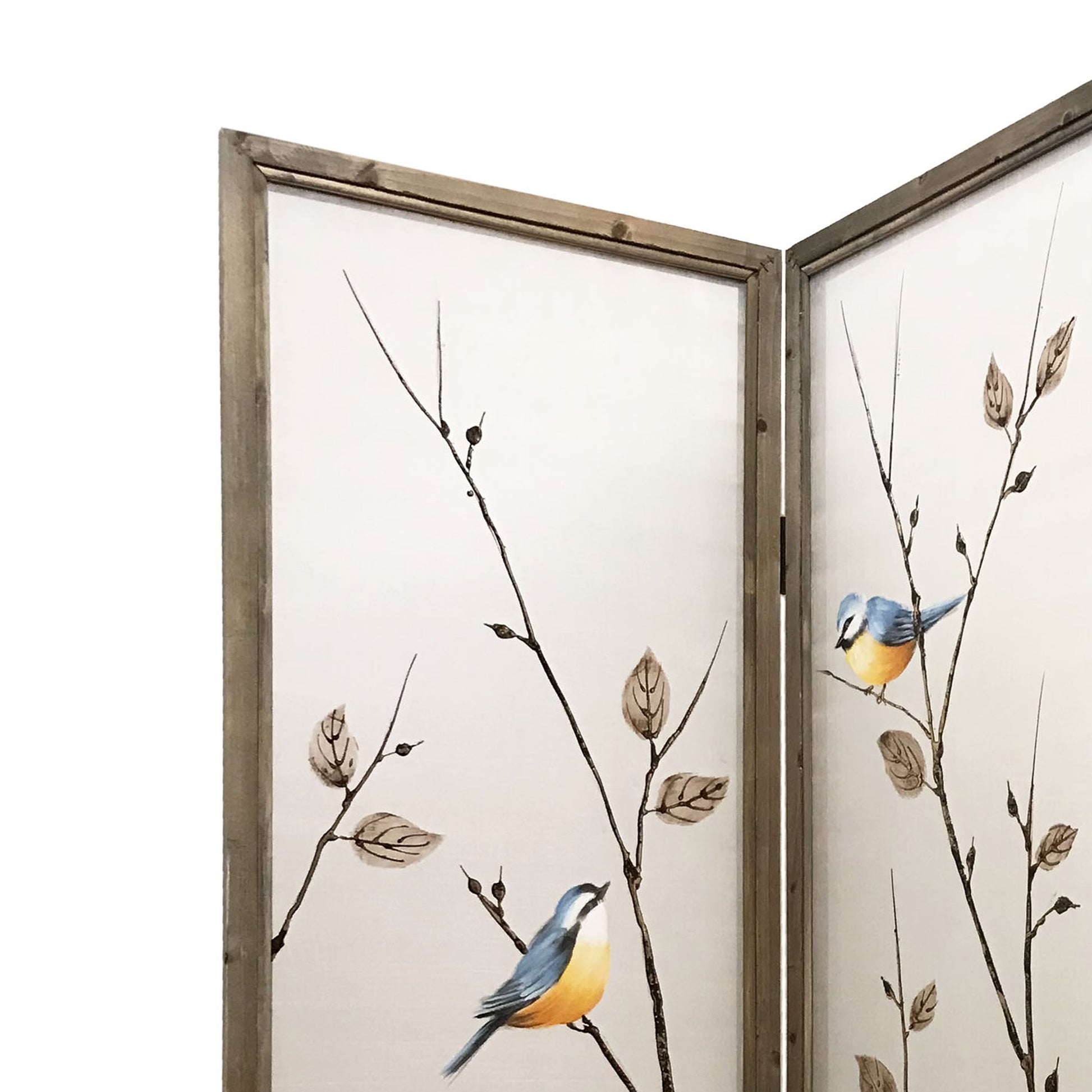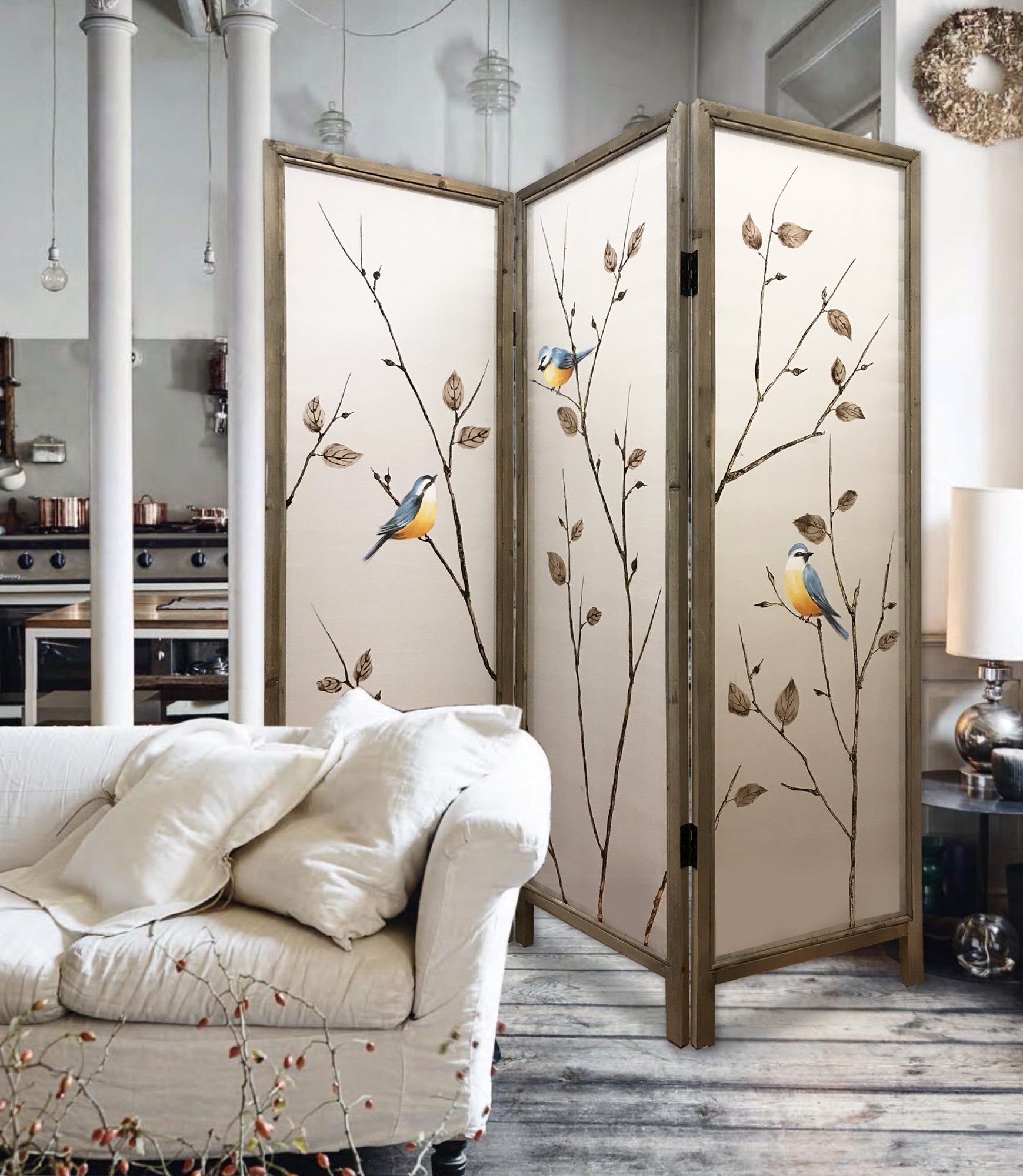Screen Gems Bosque Screen SG-320, this 3 panel screen screen is an artwork in itself. Featuring a hanpainted design on screen fabric. Opaque enough to allow for privacy while also allowing light to filter through.