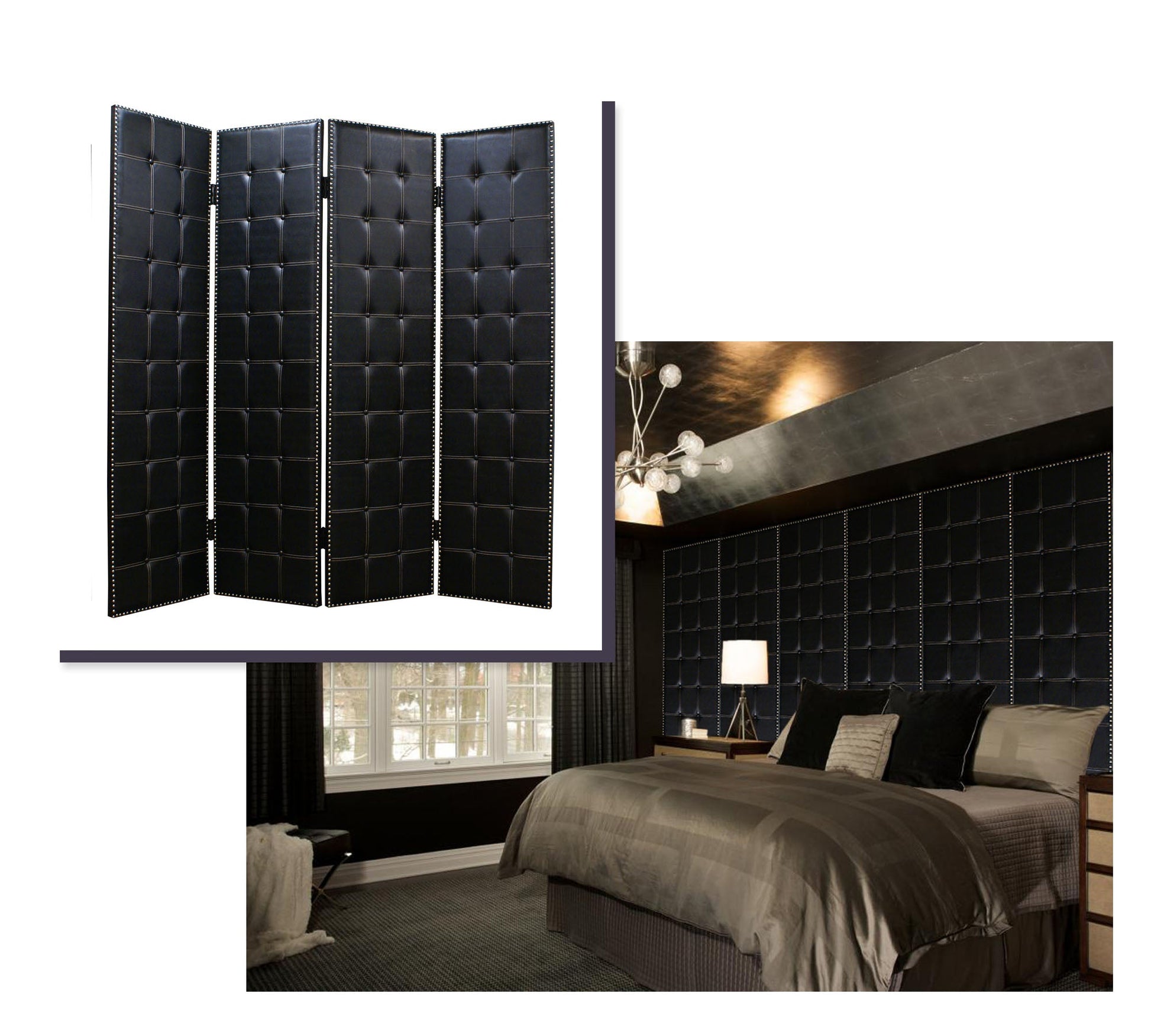 The Briankley is a high-design, 4-panel screen. Each panel is stylishly designed with square white leather patterns accented with white leather-wrapped buttons, all surrounded by nail head accents. This handmade screen is finished on one side.