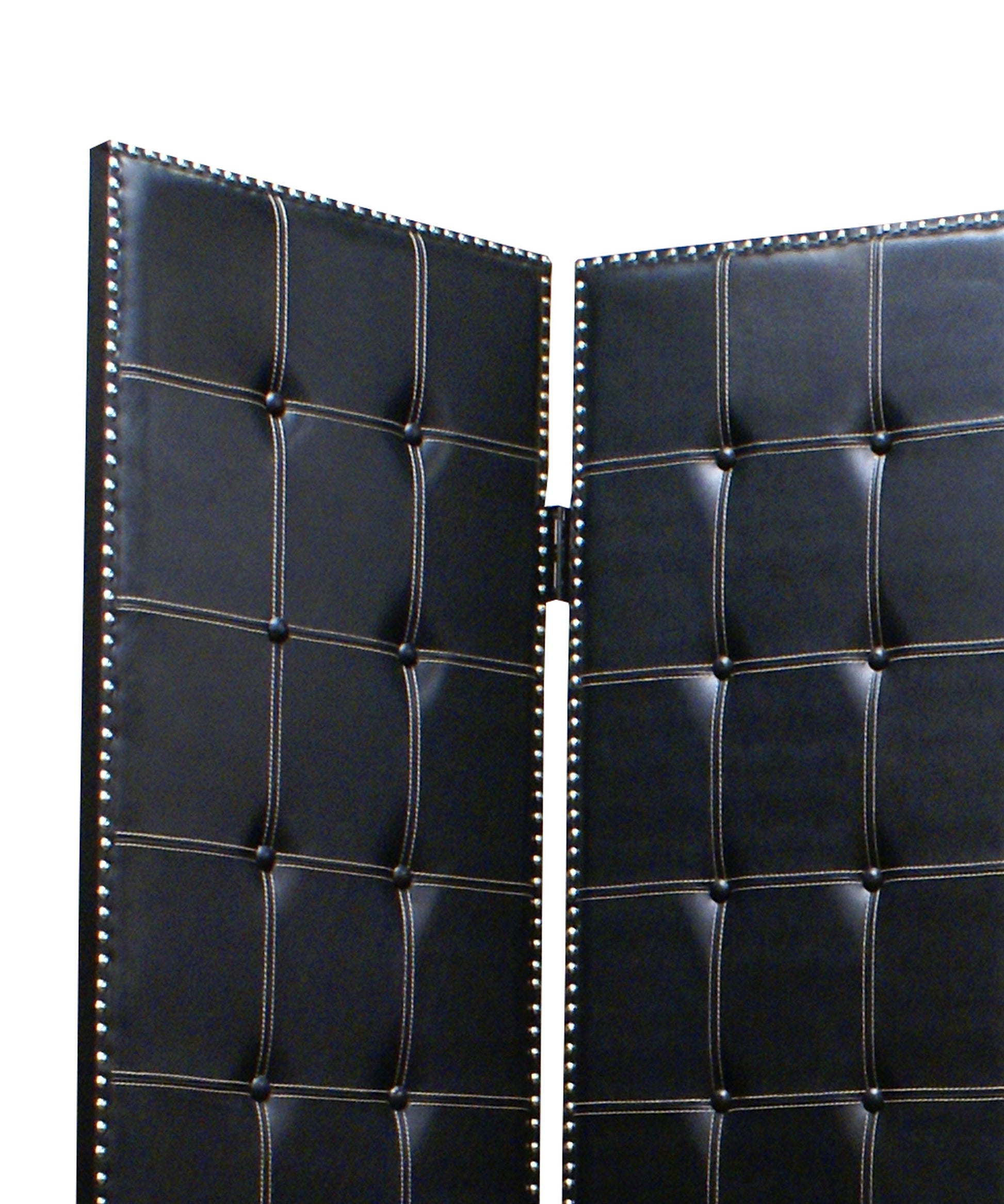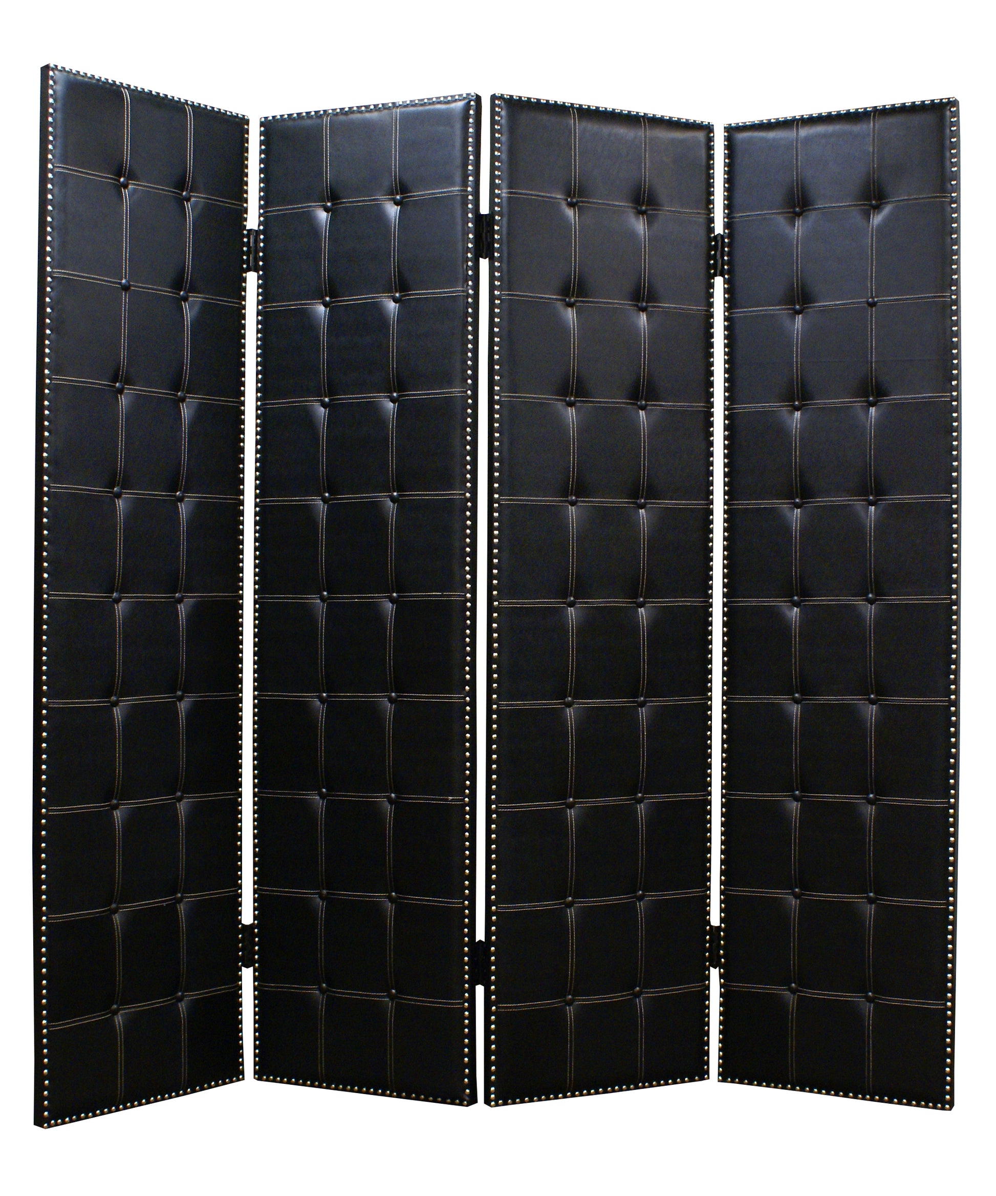 The Briankley is a high-design, 4-panel screen. Each panel is stylishly designed with square white leather patterns accented with white leather-wrapped buttons, all surrounded by nail head accents. This handmade screen is finished on both sides.