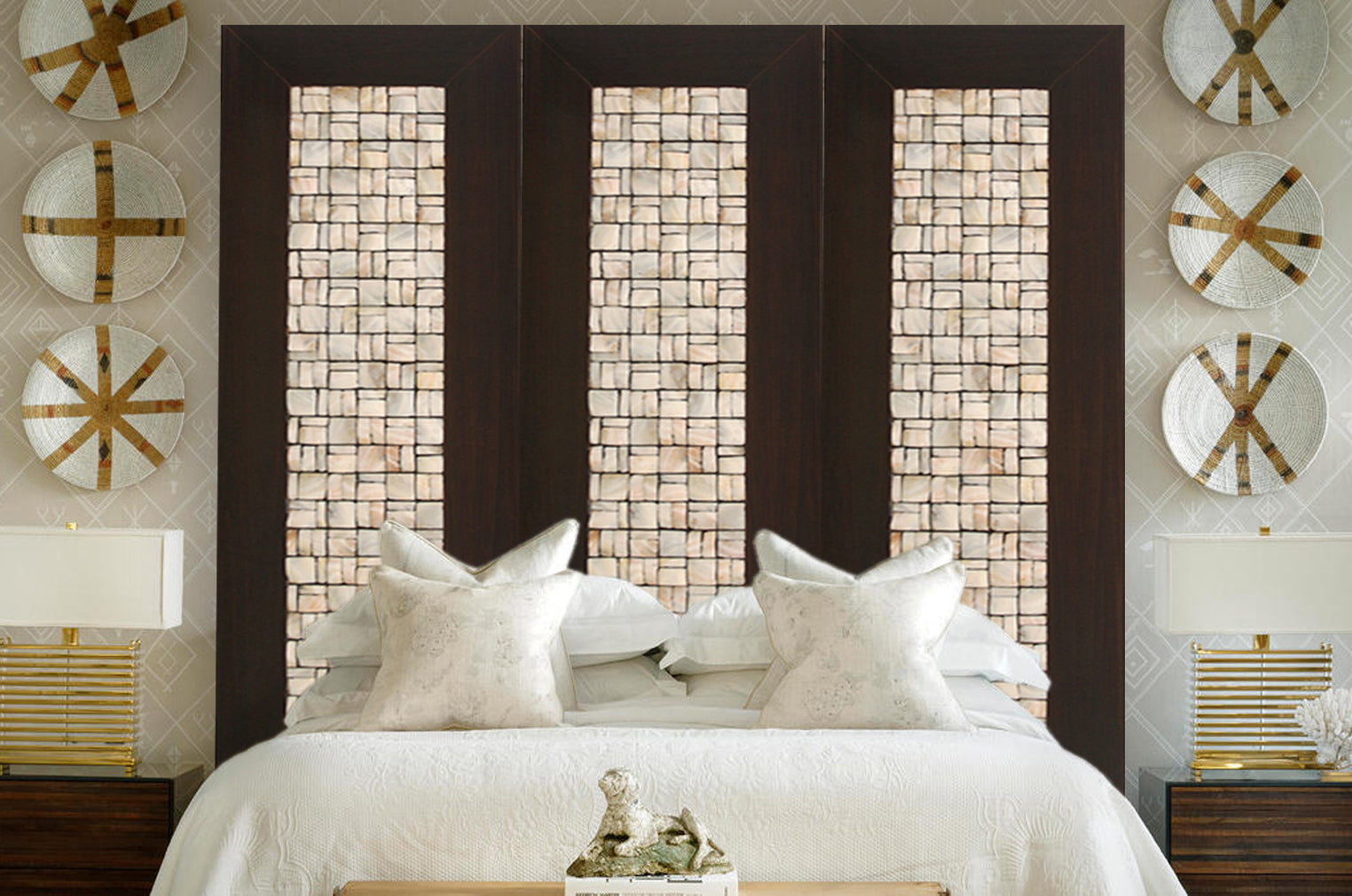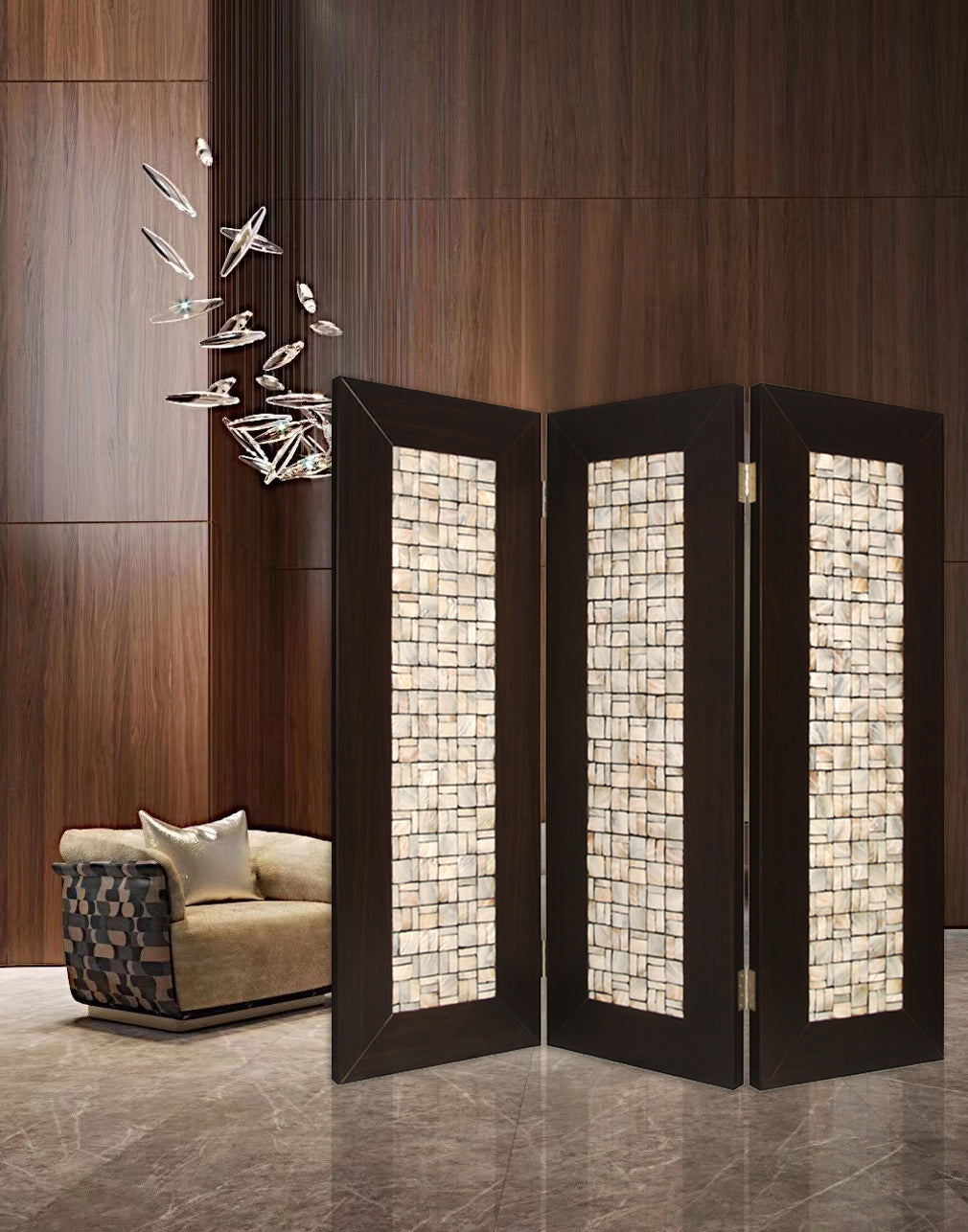 - Inlaid pearl shell tiles with durable wood frame
