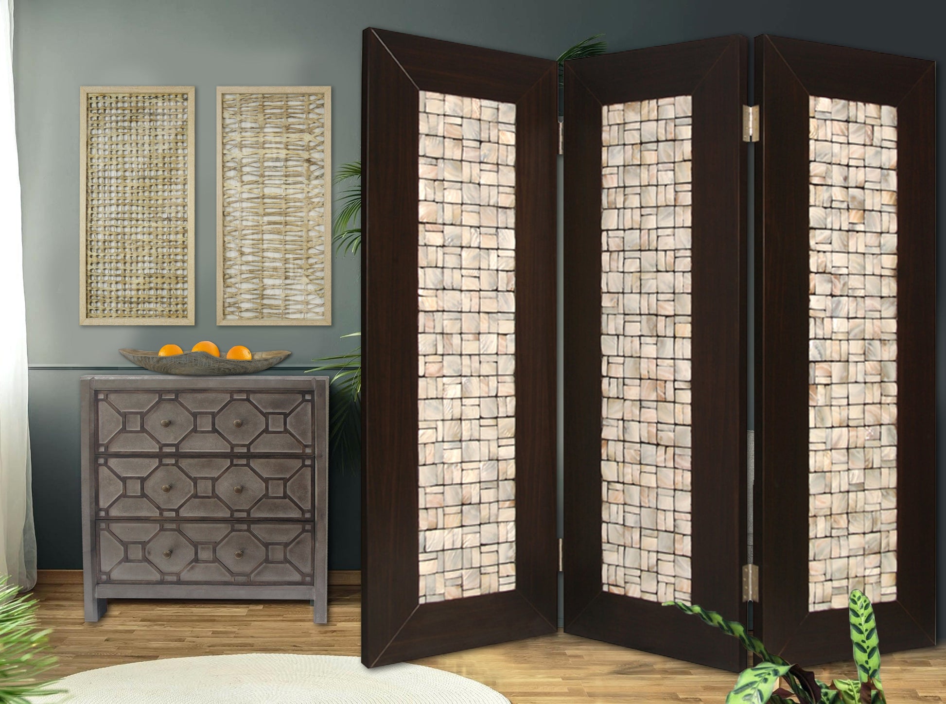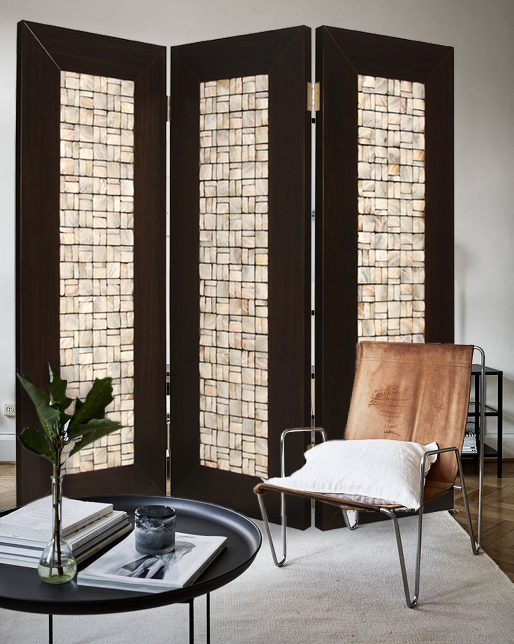 This high design, elegant 3-panel screen has inlayed pearl shell. The square pearl pieces are collectively arranged in a stunning rectangular pattern resluting . The hand made screen is finished on both sides. This high design, elegant 3-panel screen has inlayed pearl shell. The square pearl pieces are collectively arranged in a stunning rectangular pattern resluting . The hand made screen is finished on both sides.