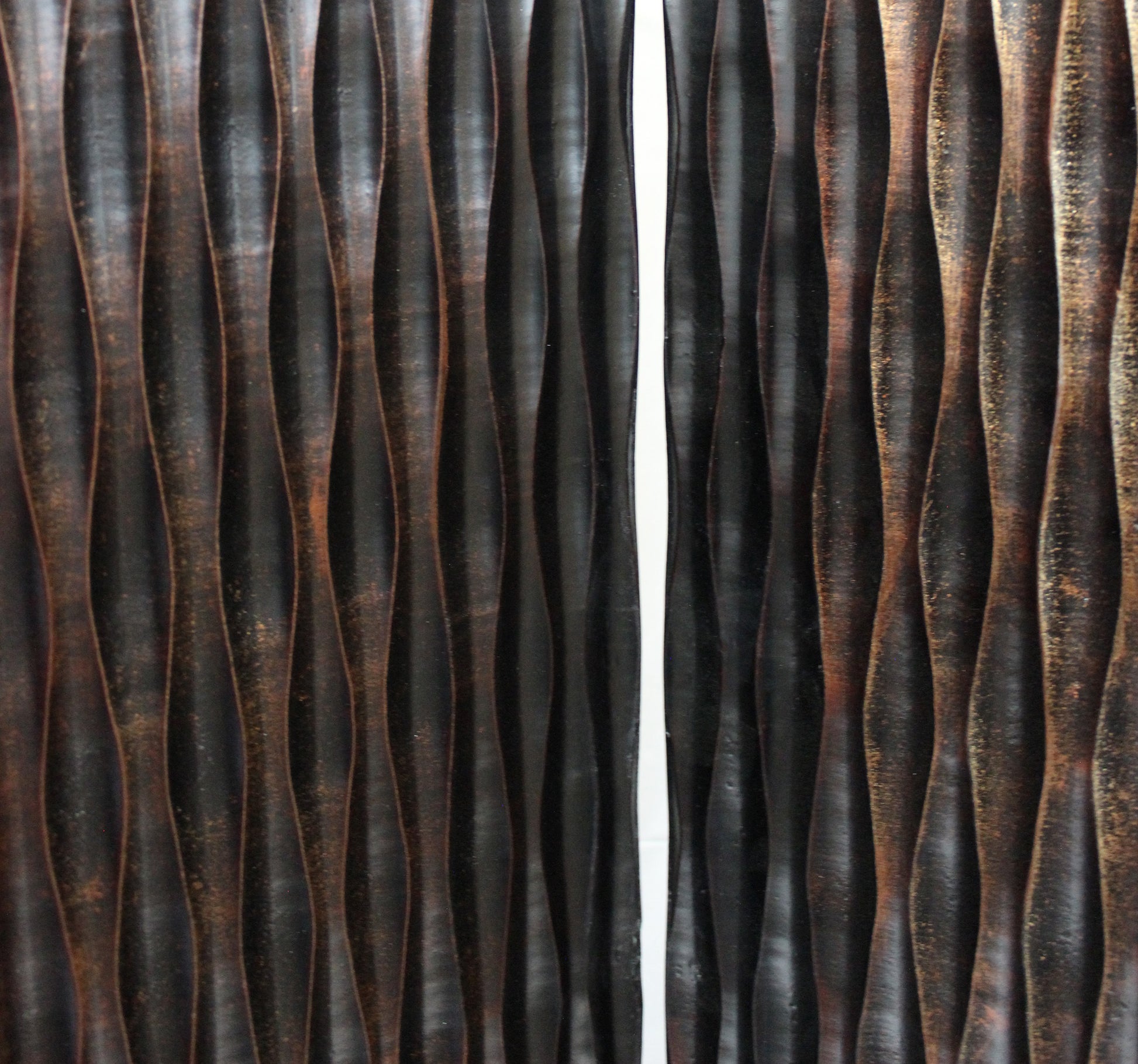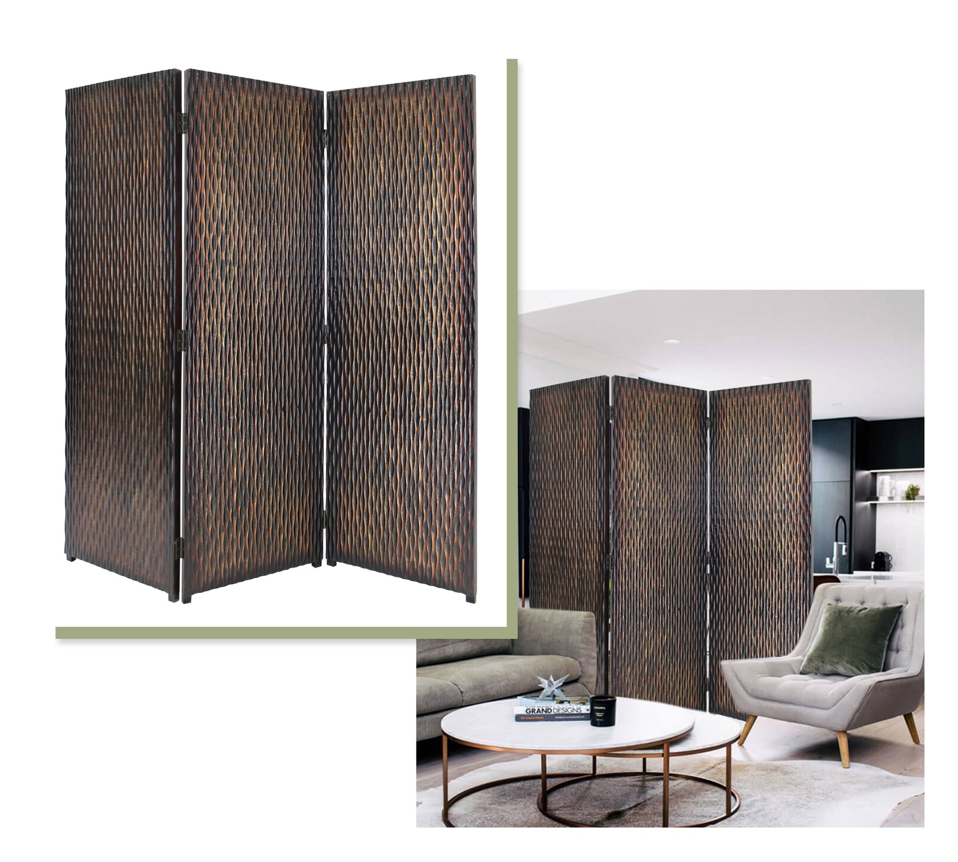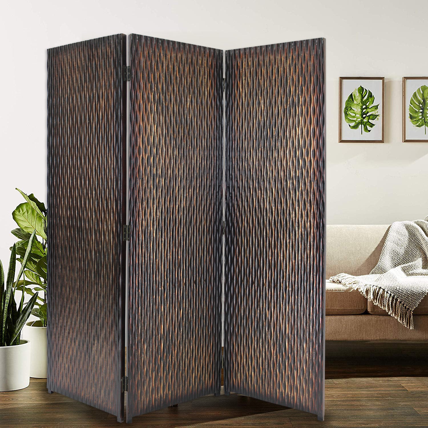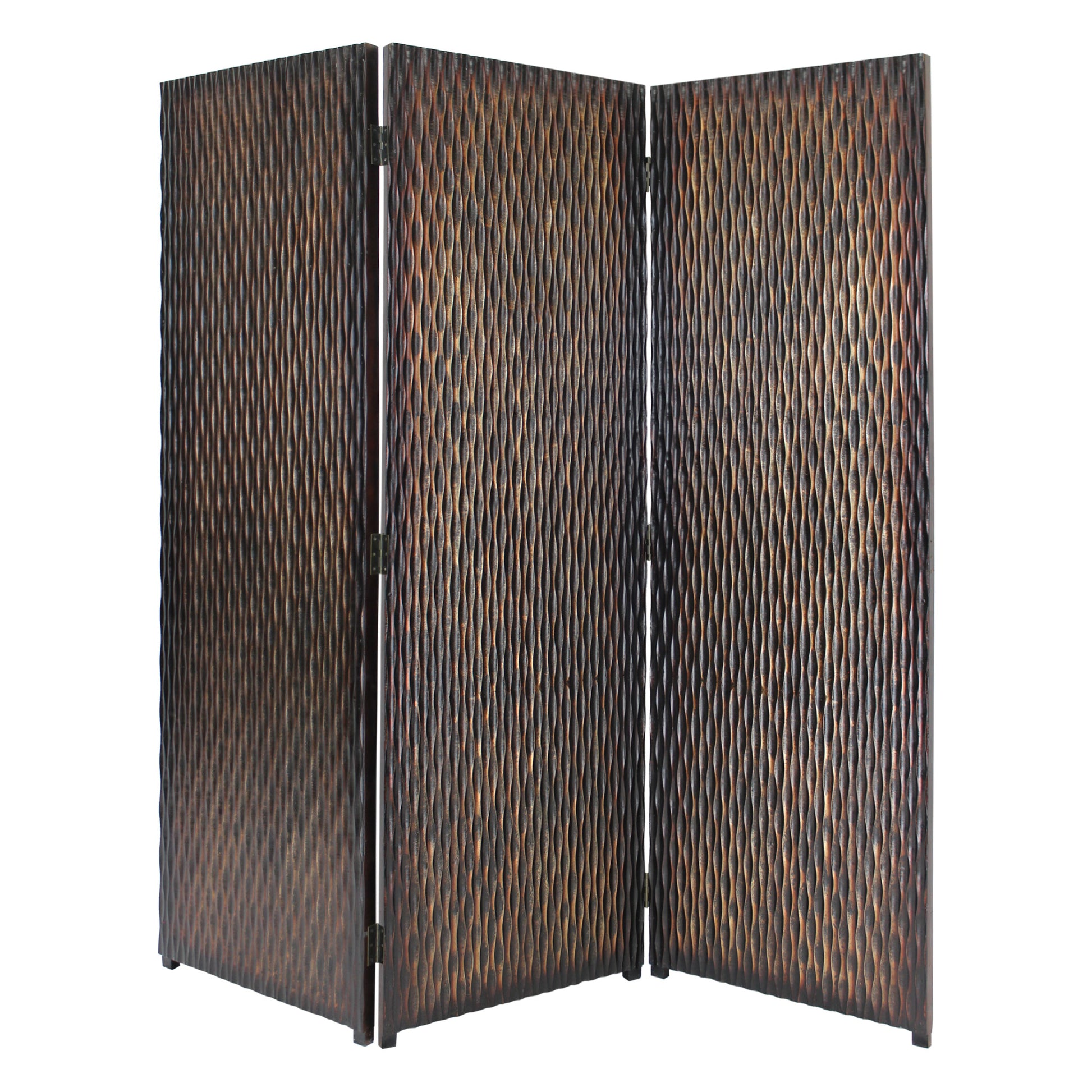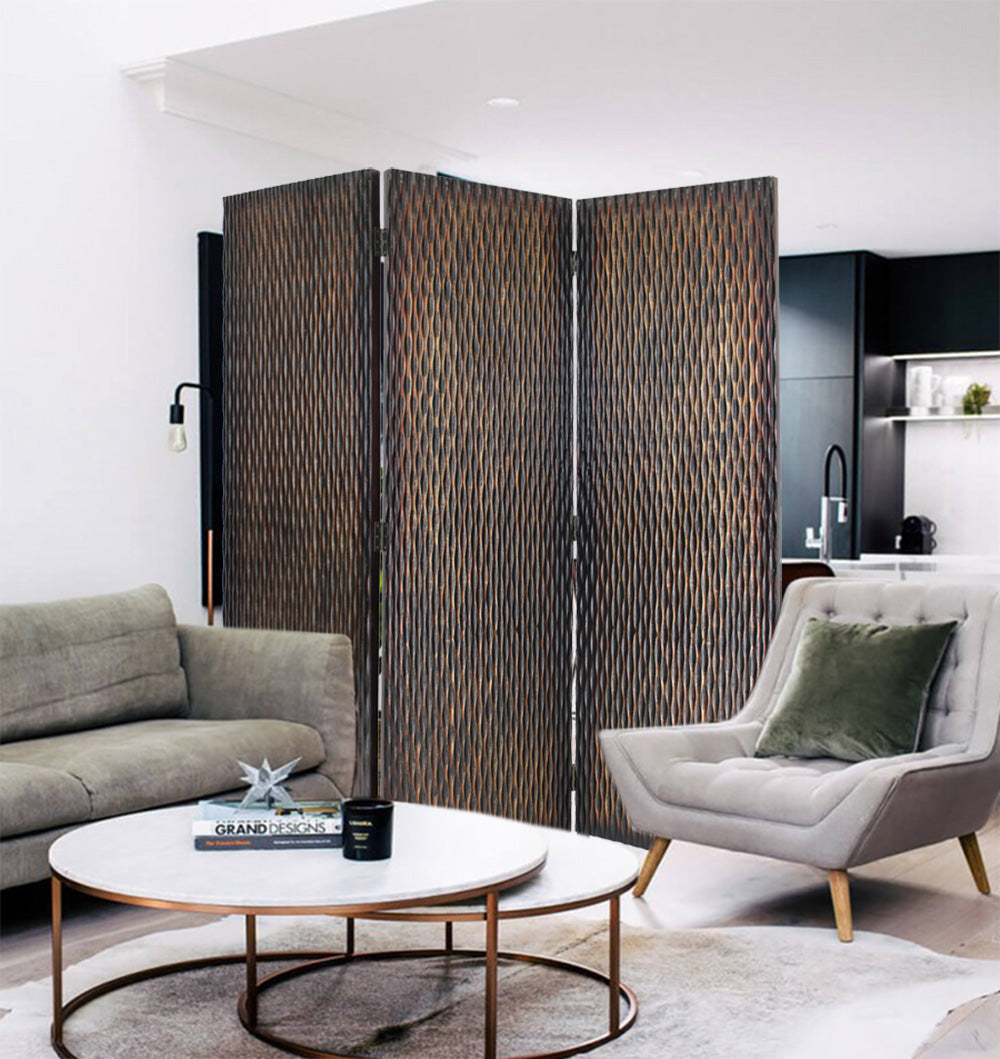 A 3 panel screen made of patterned wood panelling. The screen has a unique brown metallic finish with subltle brwon and black accents to complement the screen.
