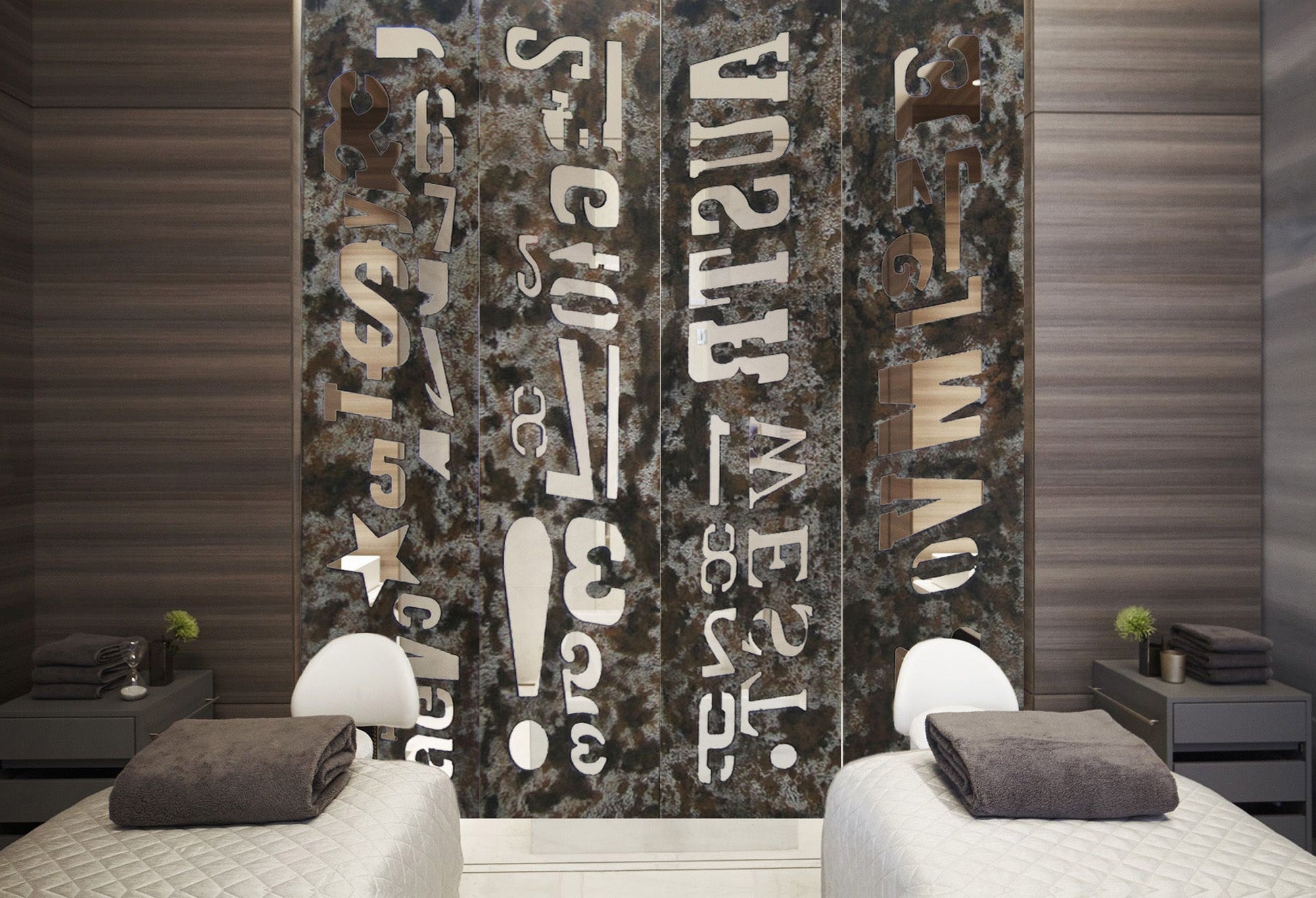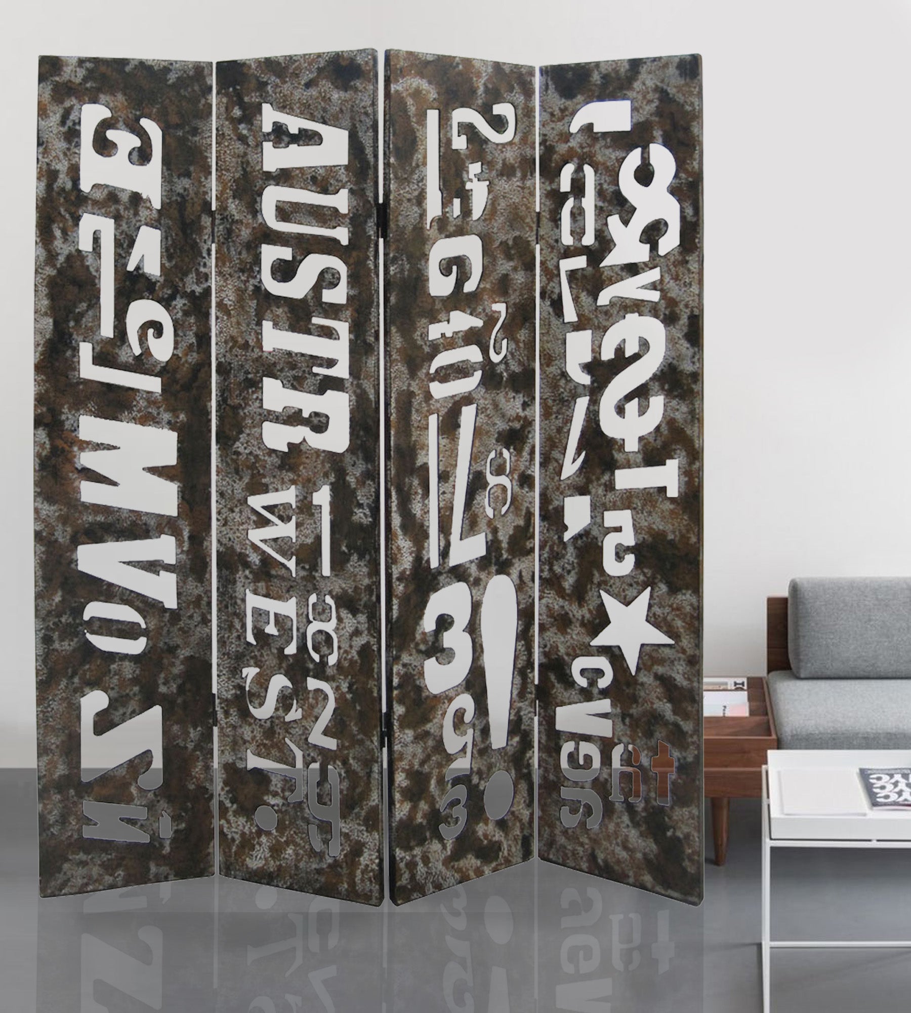 A 4 panel distressed wood screen with artistic design. It’s great decor for either rustic or even contemporary seating.
