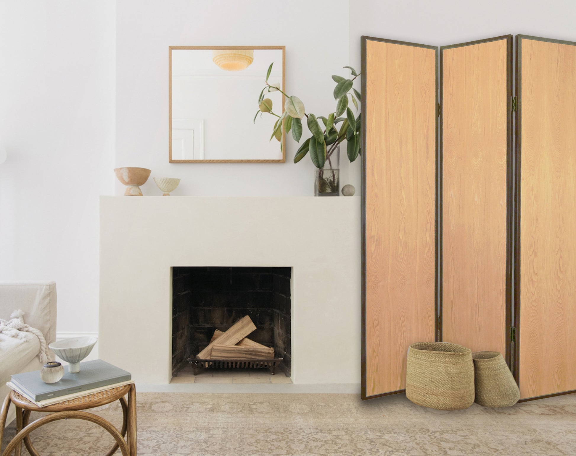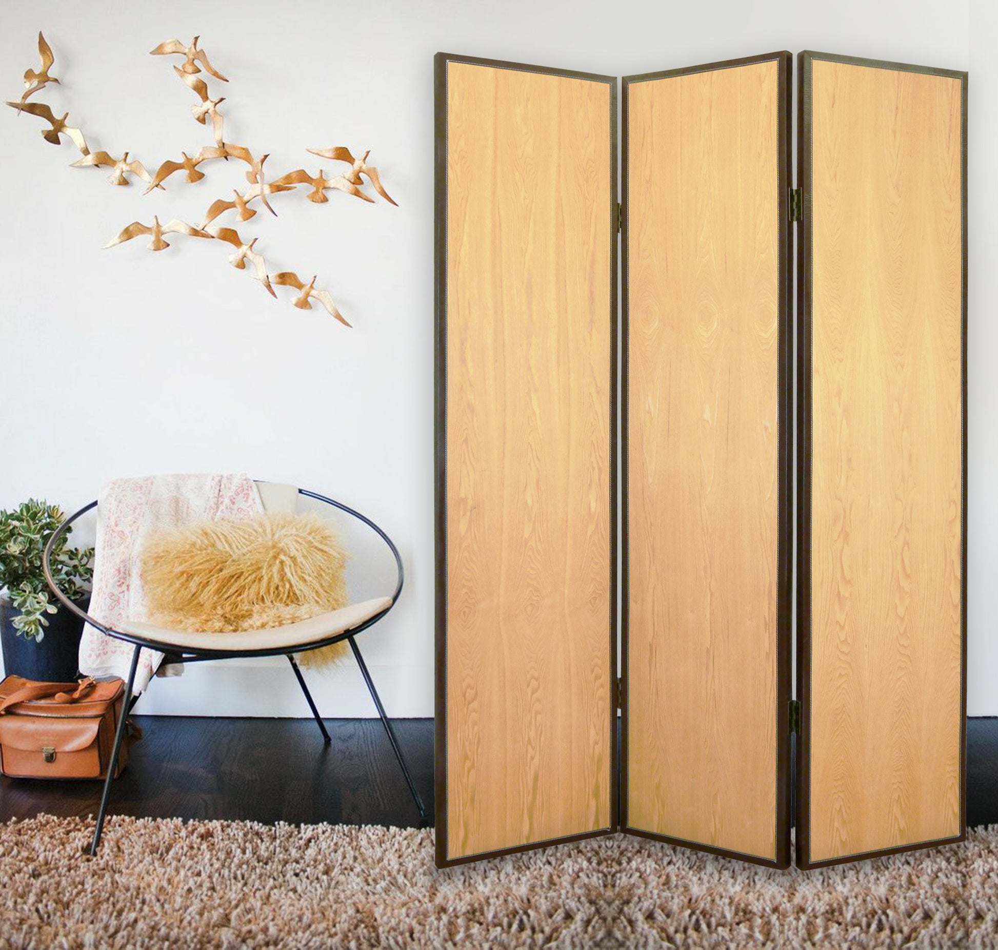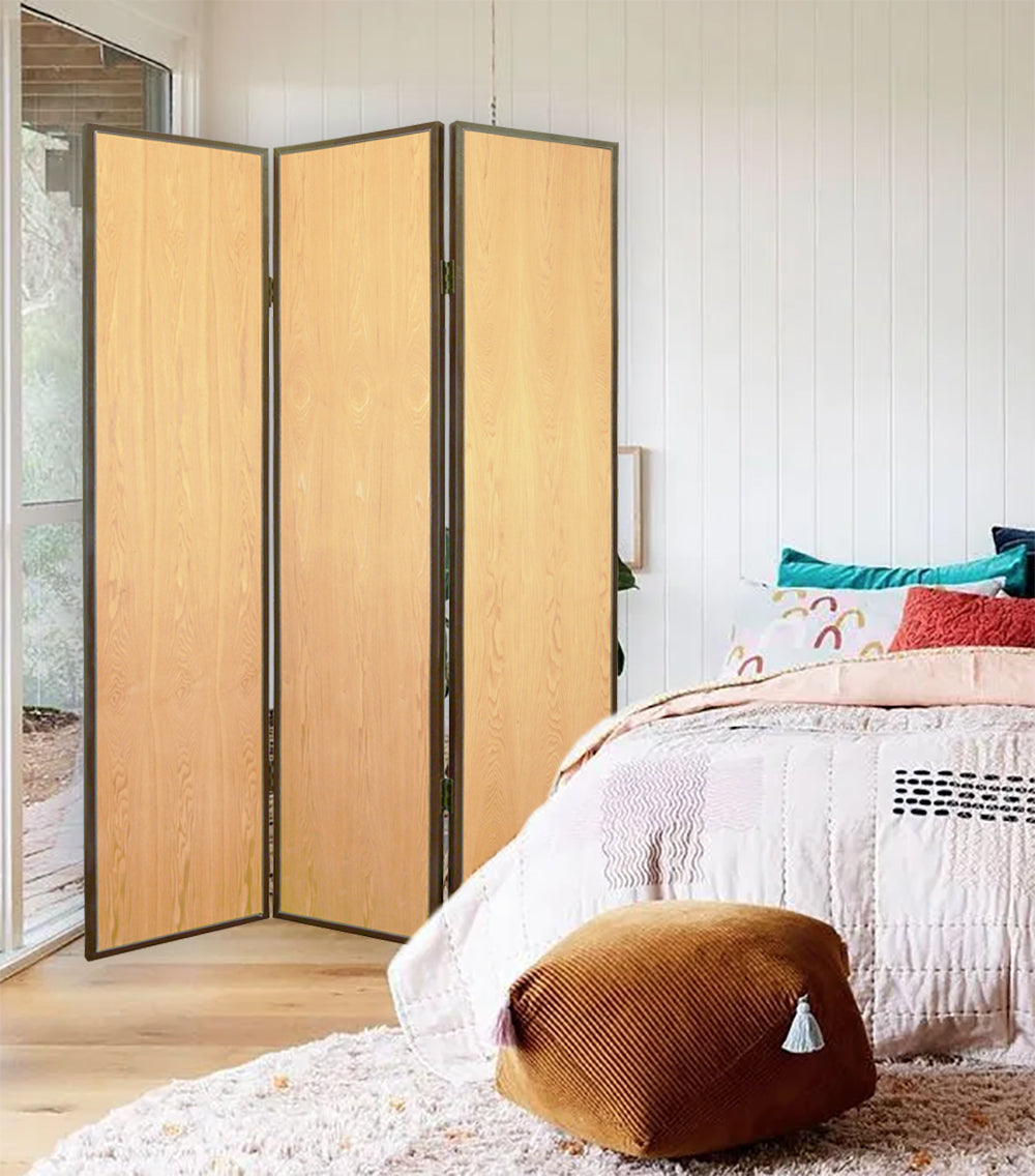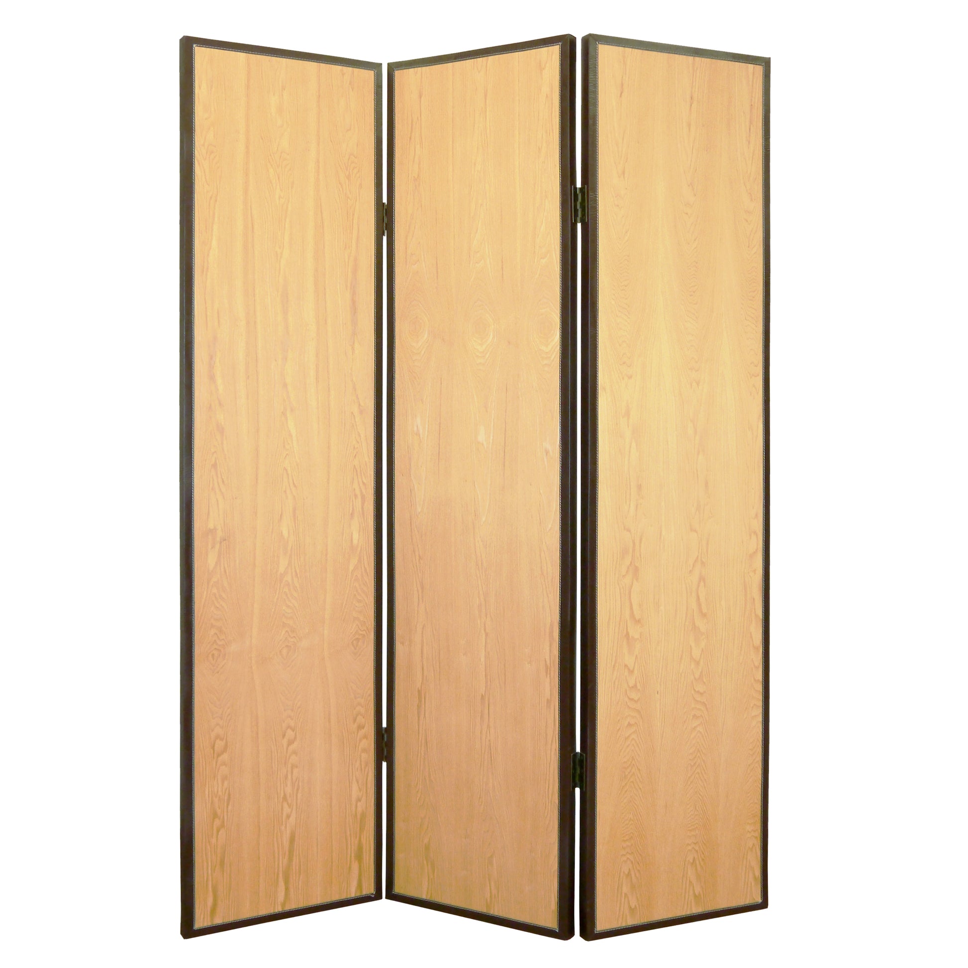 The Element Screen is an exquisitely crafted, transitional 3-panel room divider fininshed on both sides. Each wood panel is embellished with blond maple surfaces and accented with bonded contrasting brown leather trim.