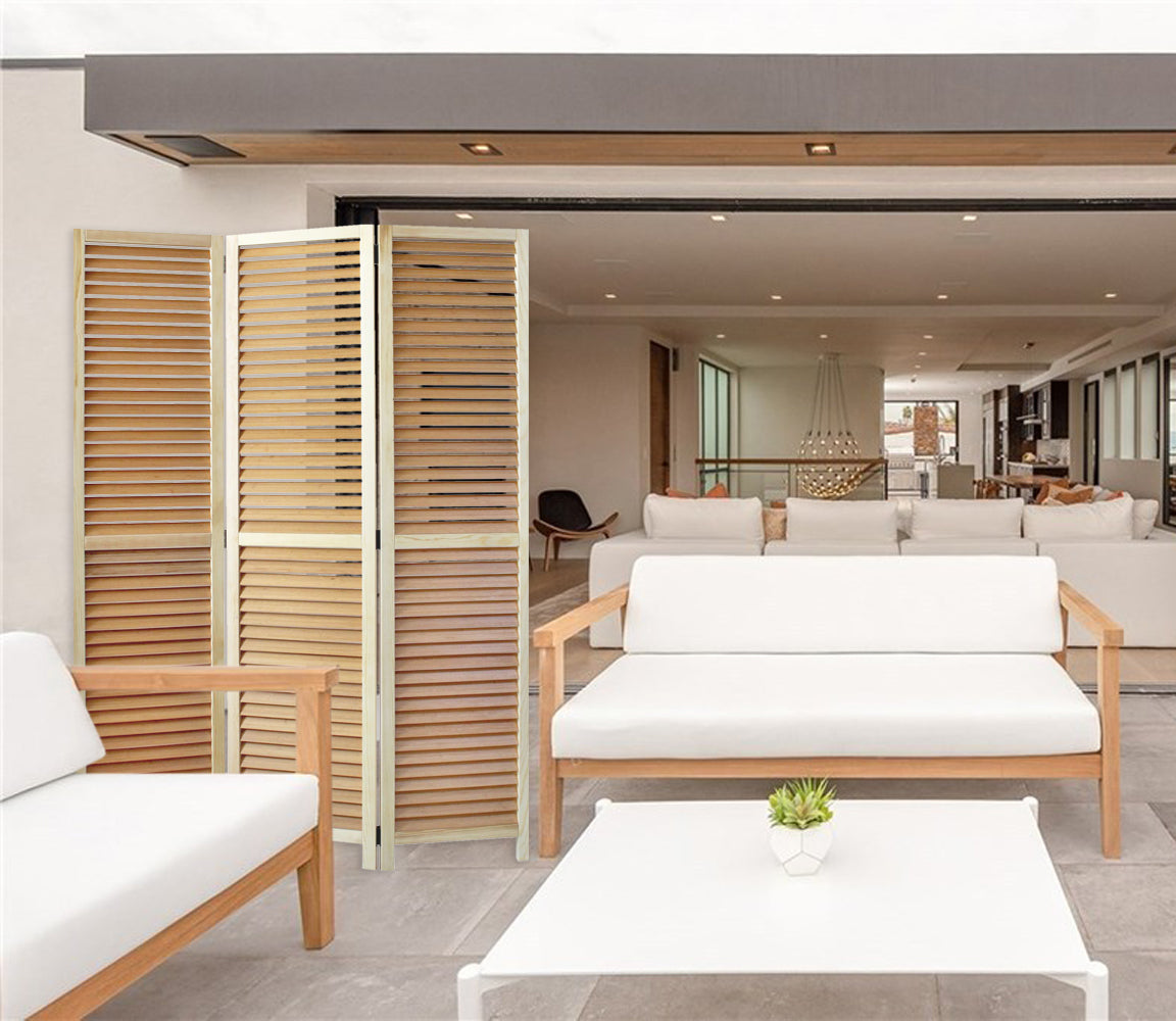 This is Natural Wood Frame with carboined bamboo shutter 3 Panel Floor Screen; It's finished the same on both sides and can be used at any setting.