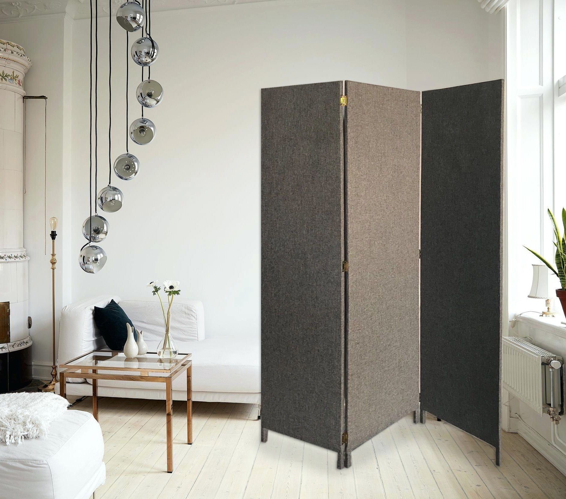 Screen Gems 3 Panel Fabric Soho Screen, this room divider is great for sectioning off any space in any room and serves as a beautiful accent. Constructed from solid wood panels with a soft fabric finish. The soft, grey fabric creates an attractive contemporary design. This room divider is an excellent item to have in your or any place, it is very light-weight and easy to store. Finished on both sides.