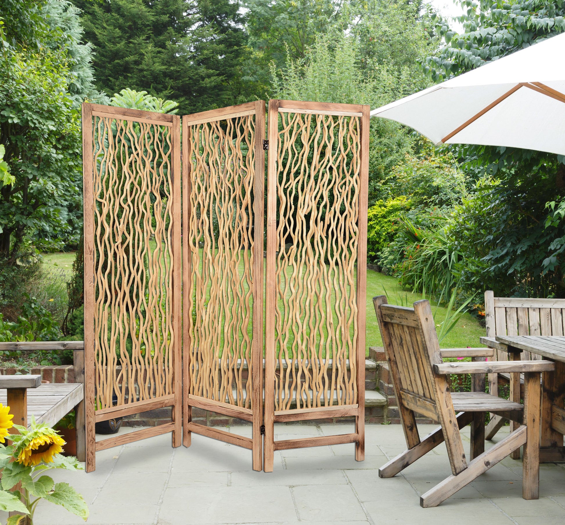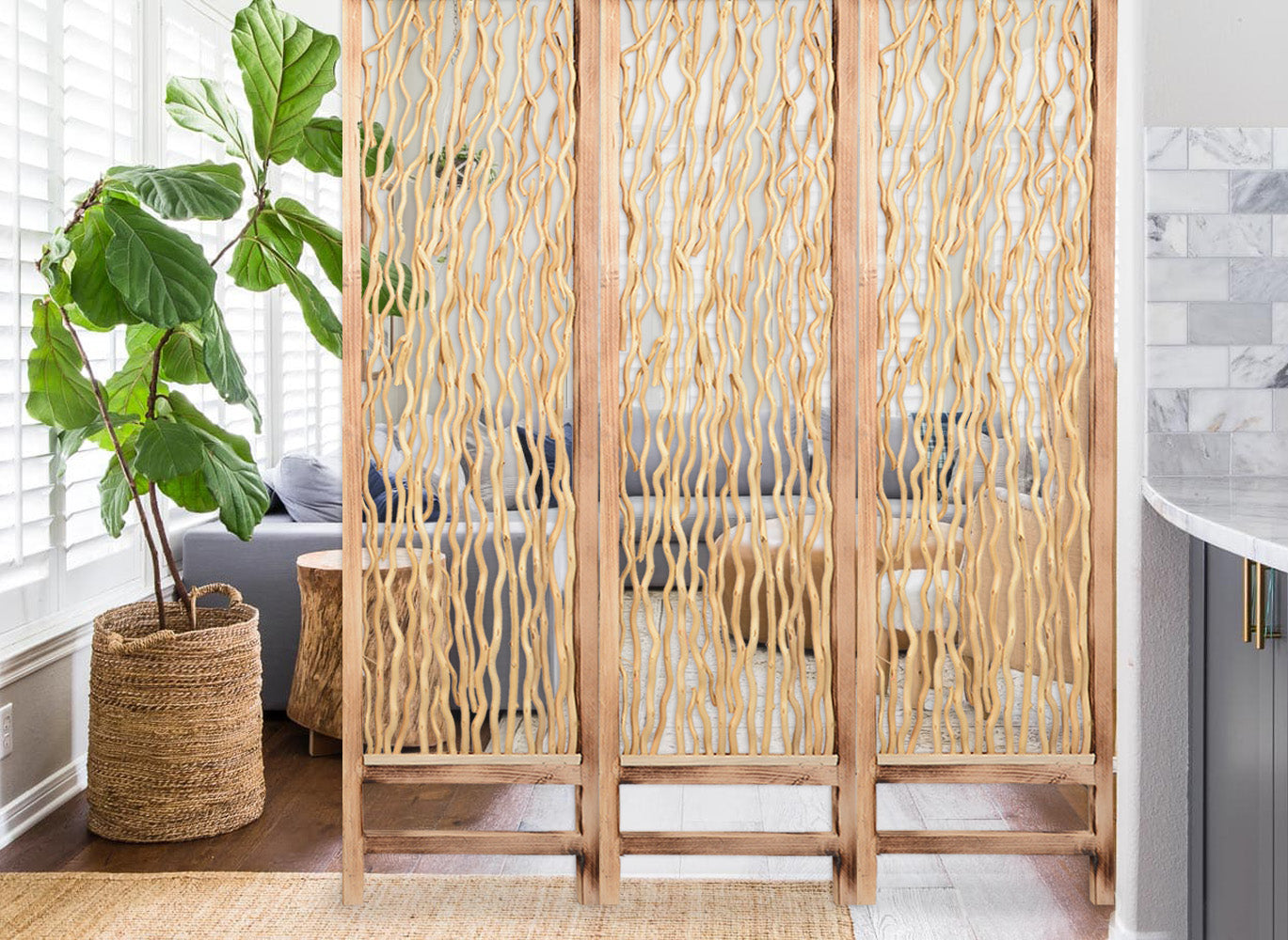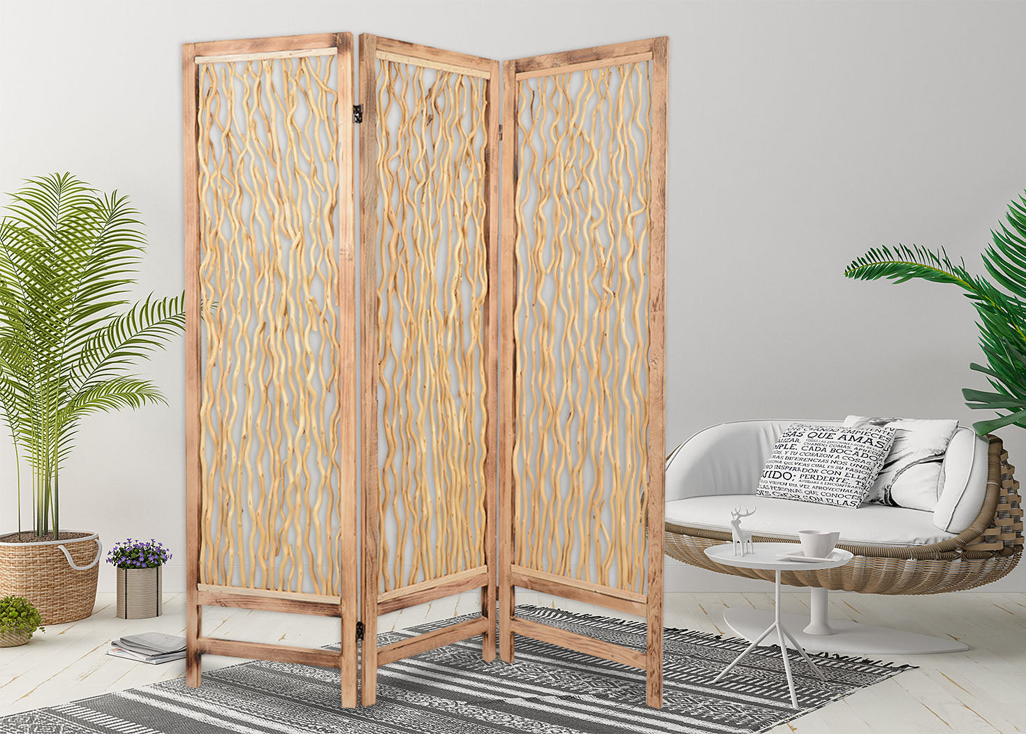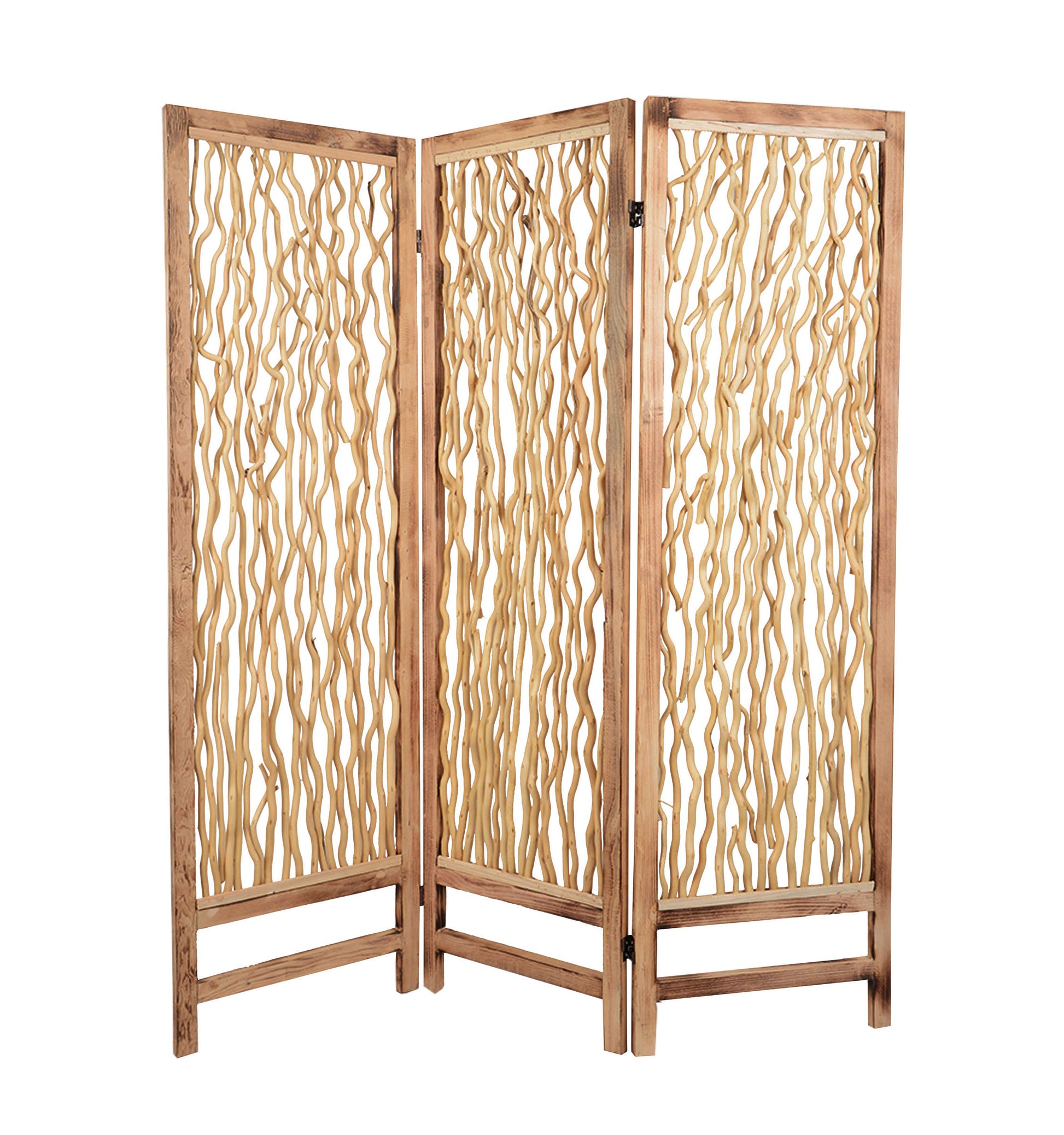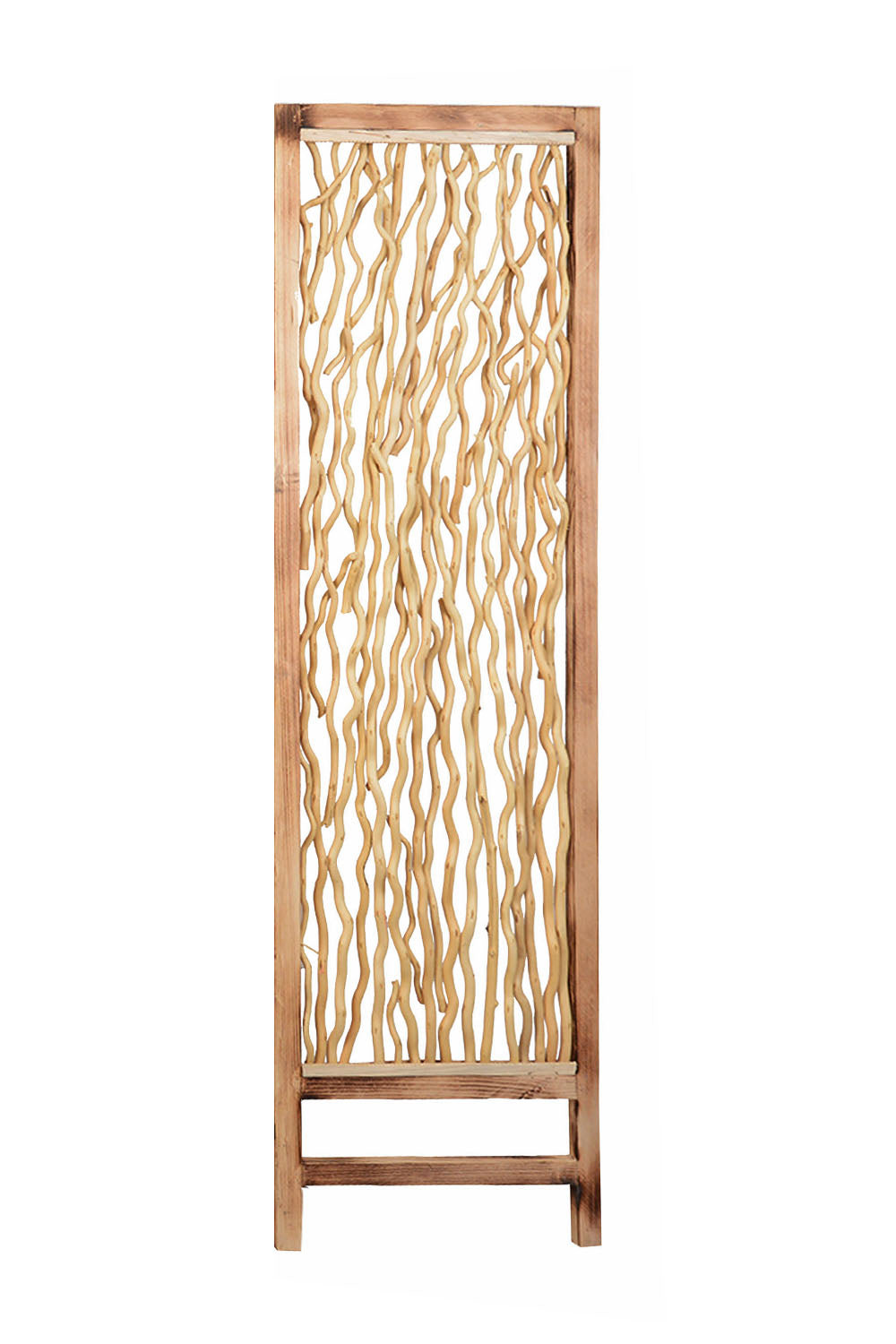 3 panel foldable screen. Wood frame with vertical decorative willow branches inset, gives any room an earthy yet contemporary touch.