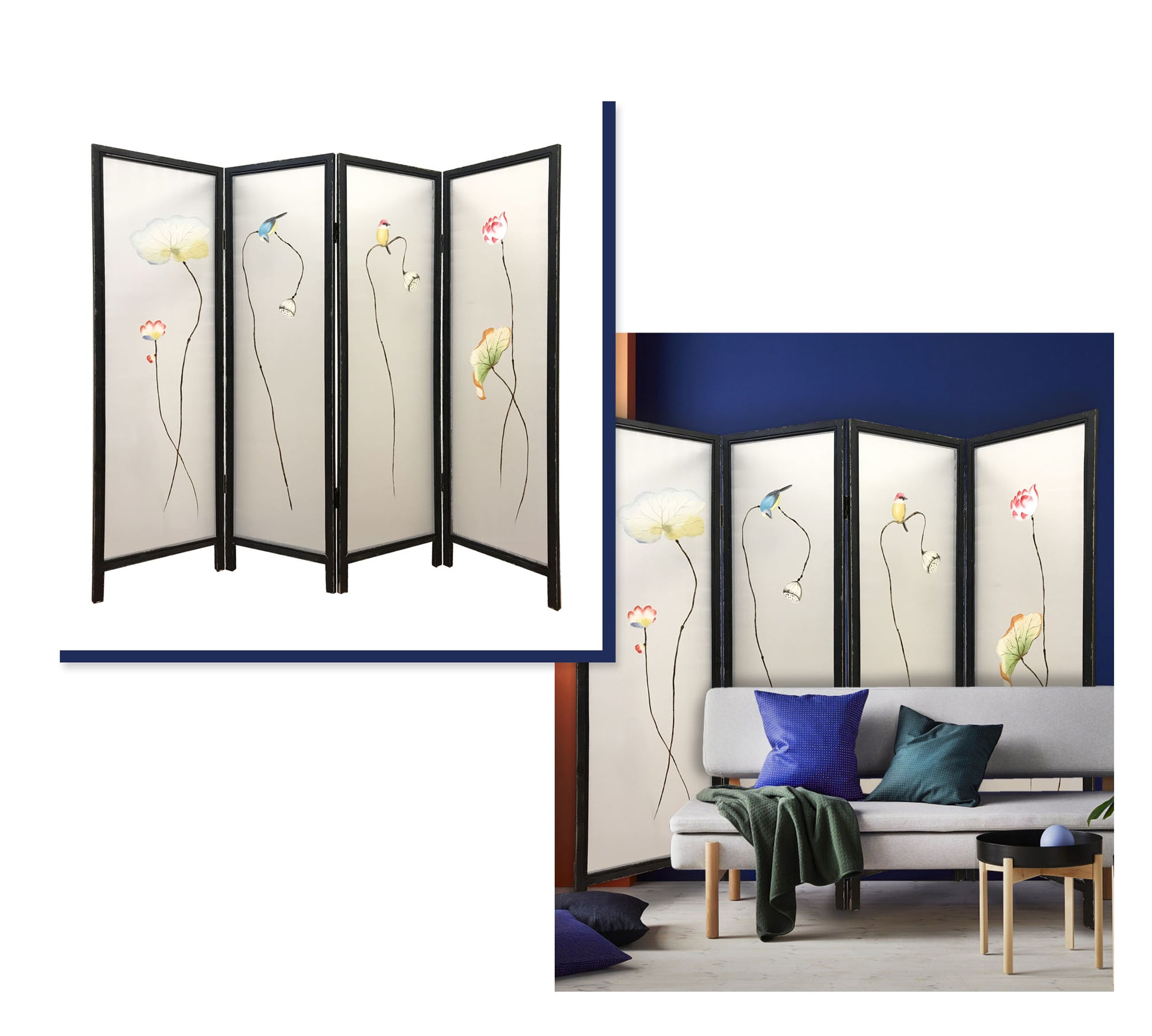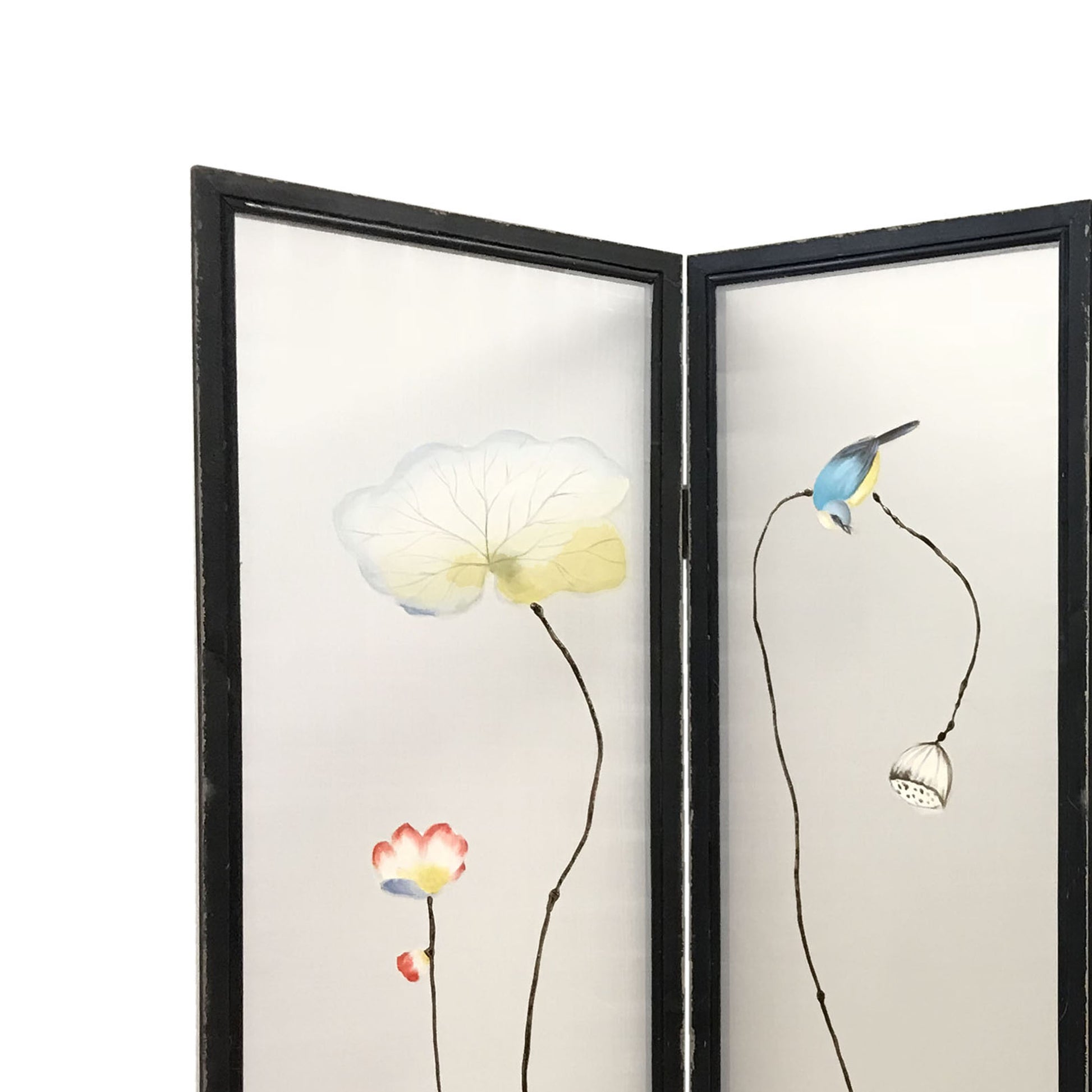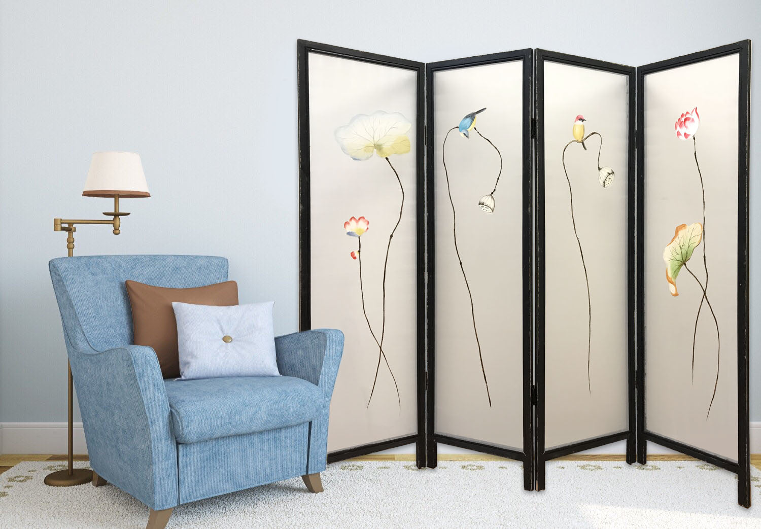 Screen Gems Flourishing Screen SG-322, this 4 panel screen screen is an artwork in itself. Featuring a hanpainted design on screen fabric. Opaque enough to allow for privacy while also allowing light to filter through.