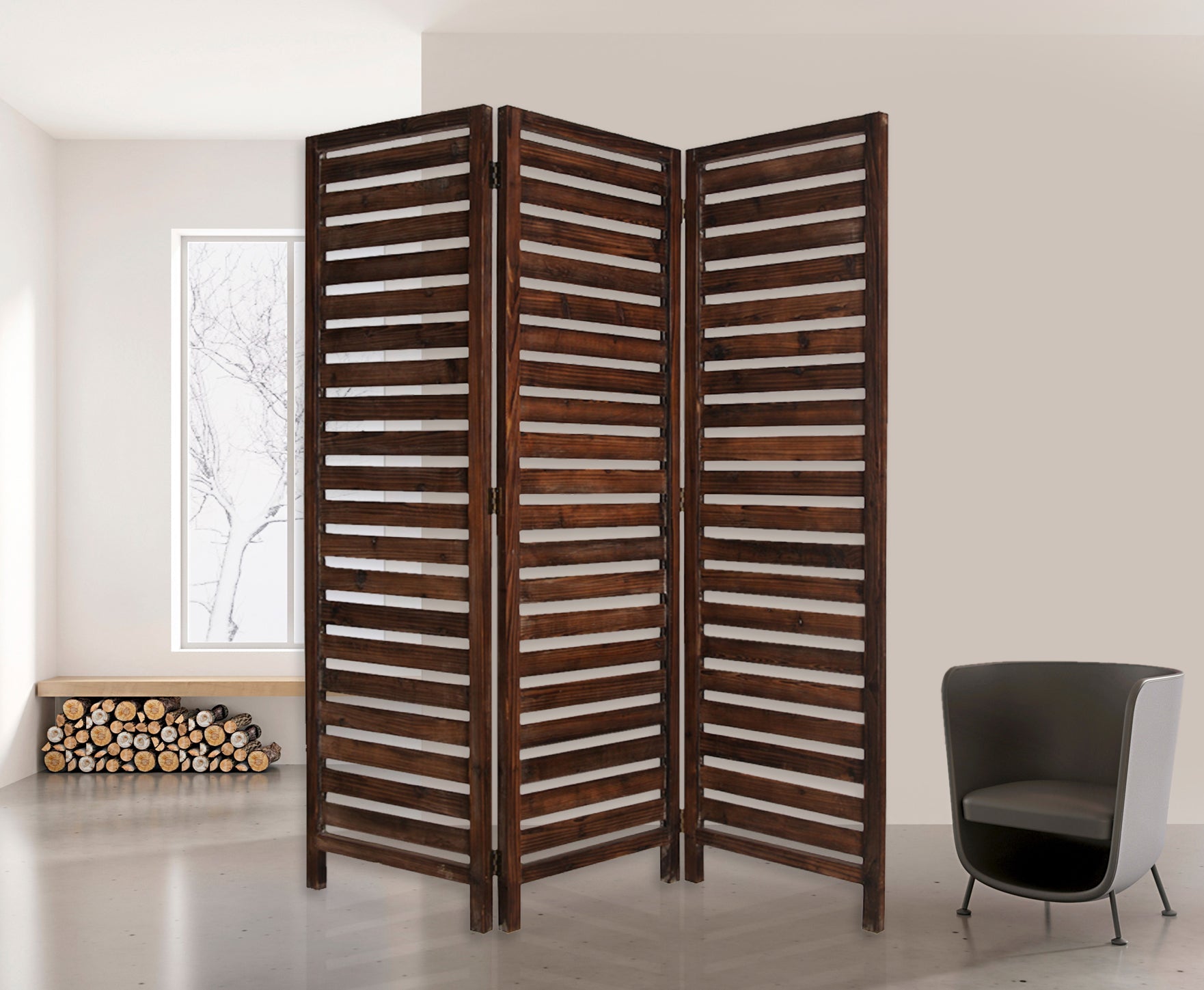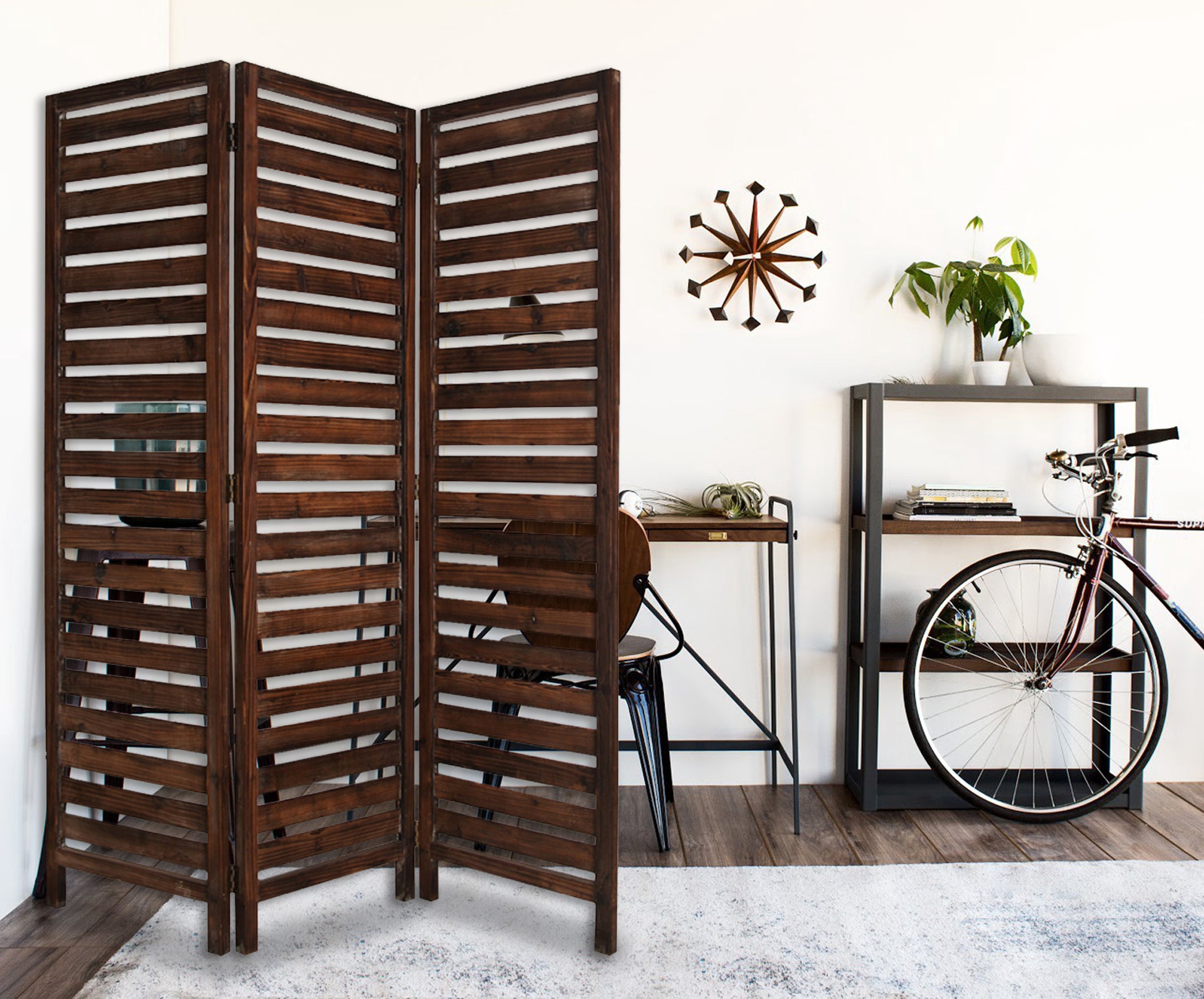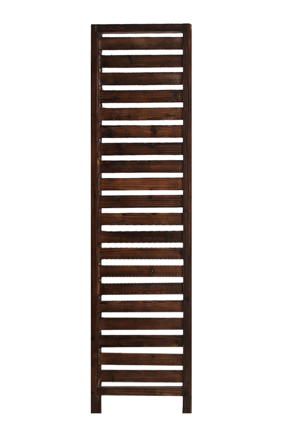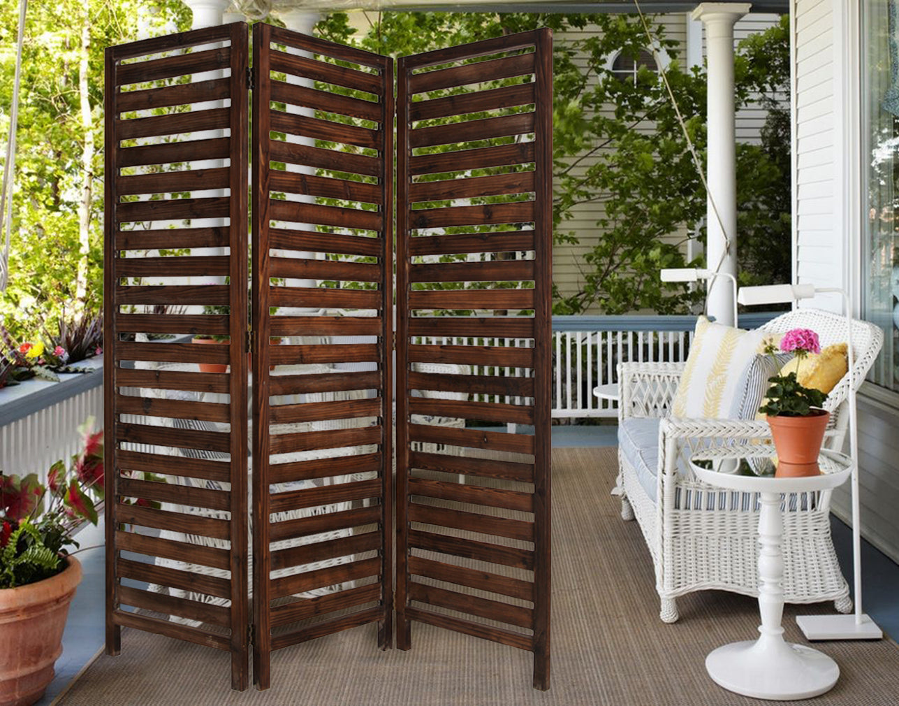 A 3 panel solid wood screen. Each panel has wooden sleeves that run the width of the panel with transparent spaces between each sleeve. Finished in weatherd brown A 3 panel solid wood screen. Each panel has wooden sleeves that run the width of the panel with transparent spaces between each sleeve. Finished in weatherd brown