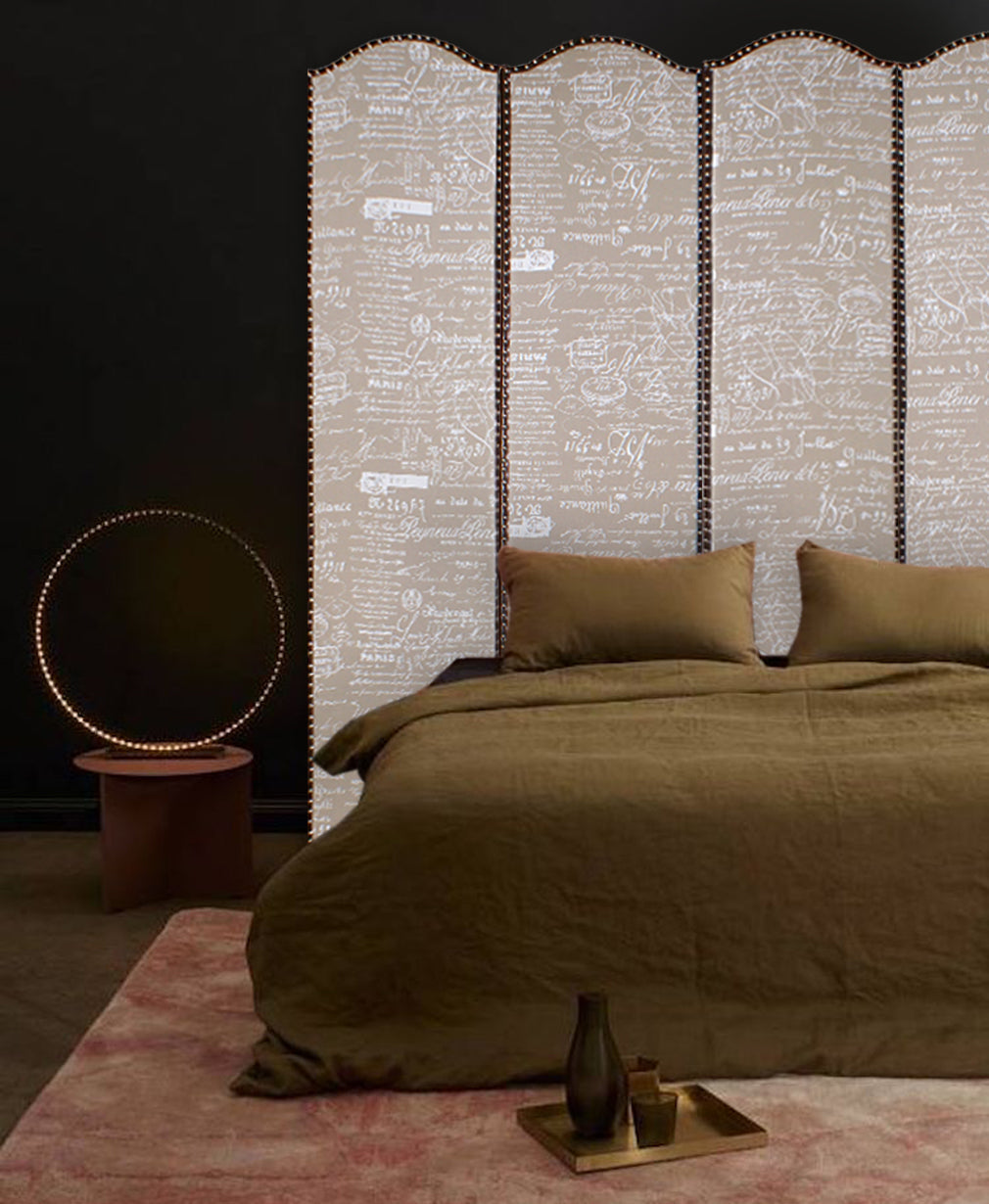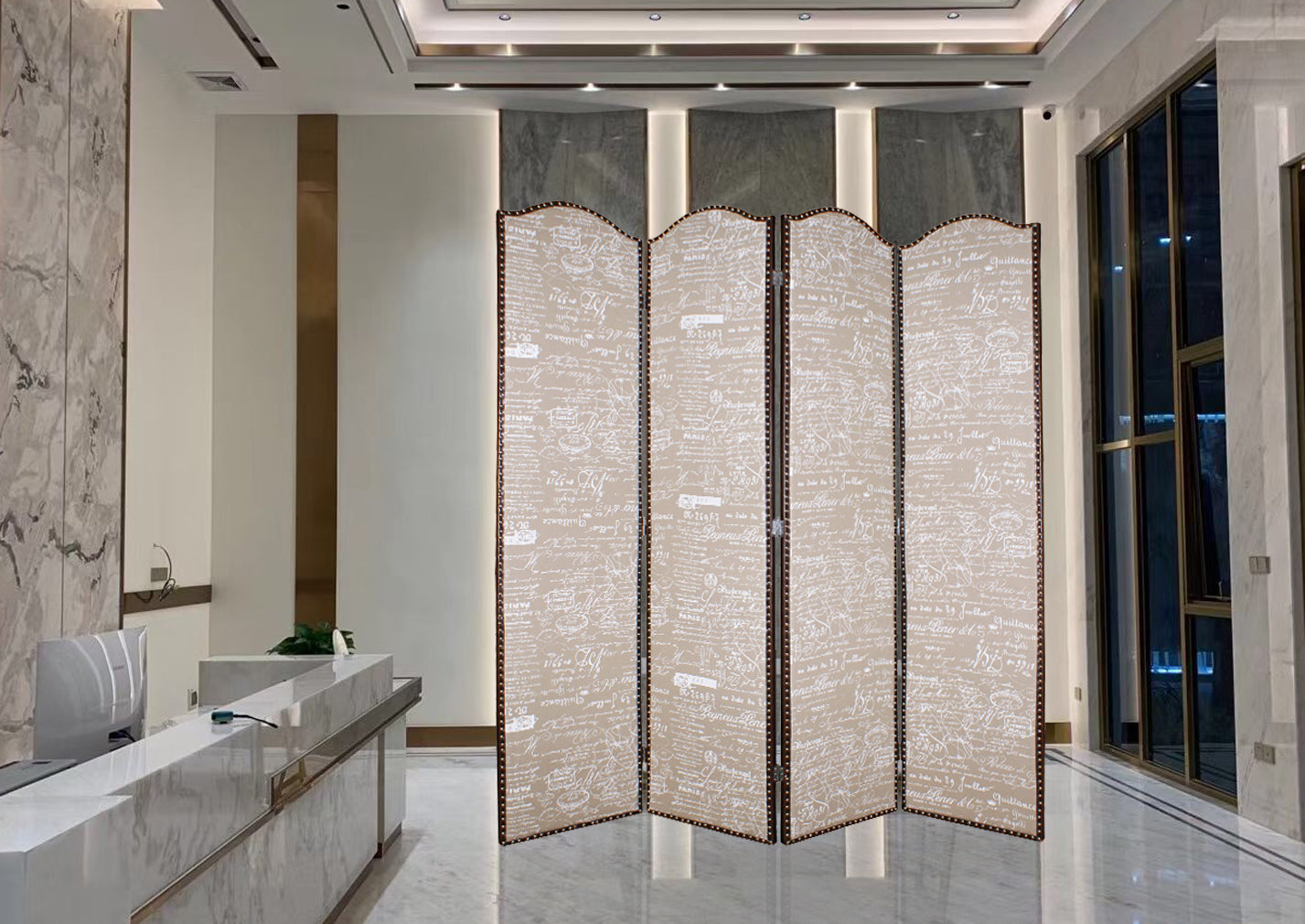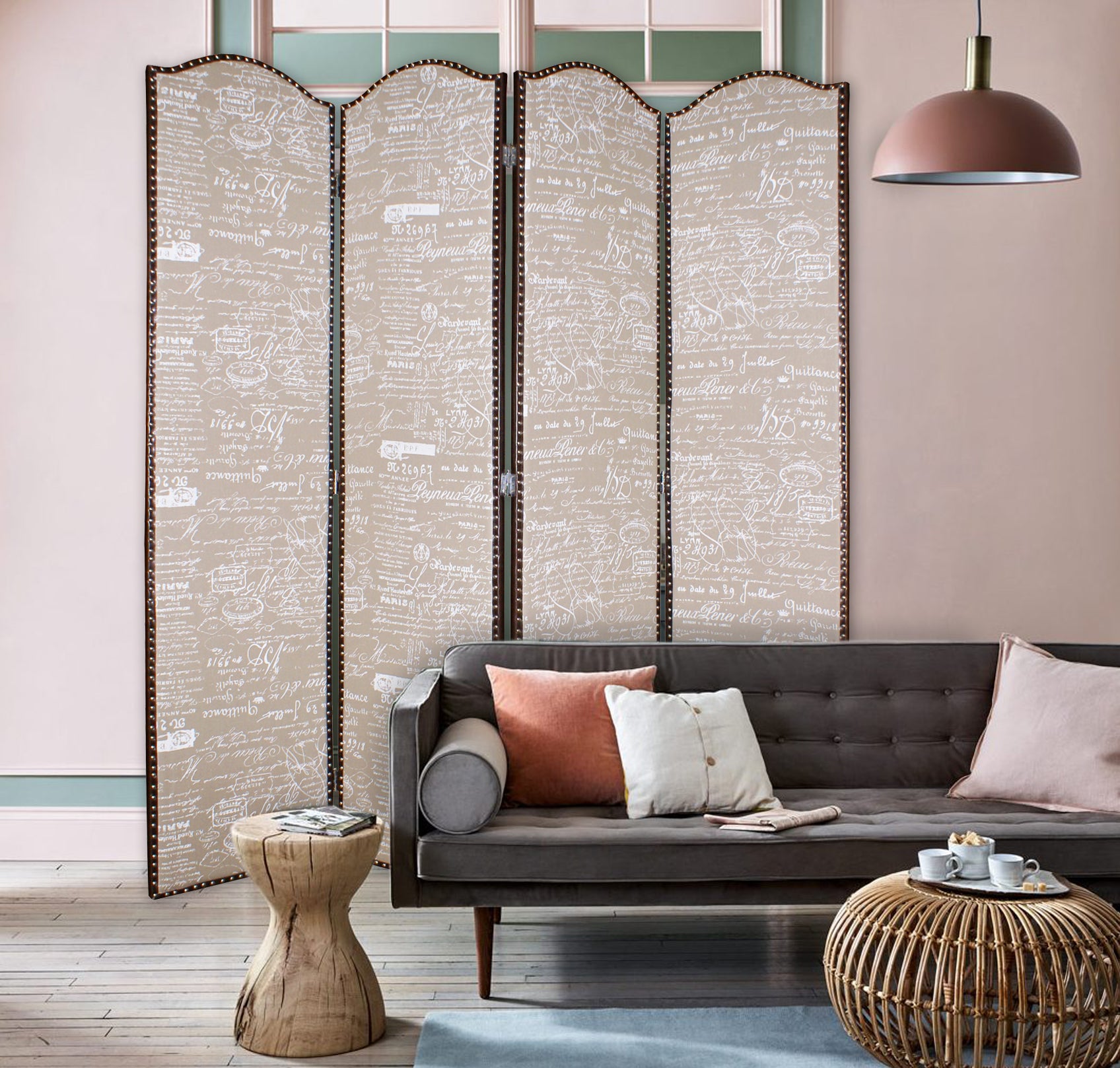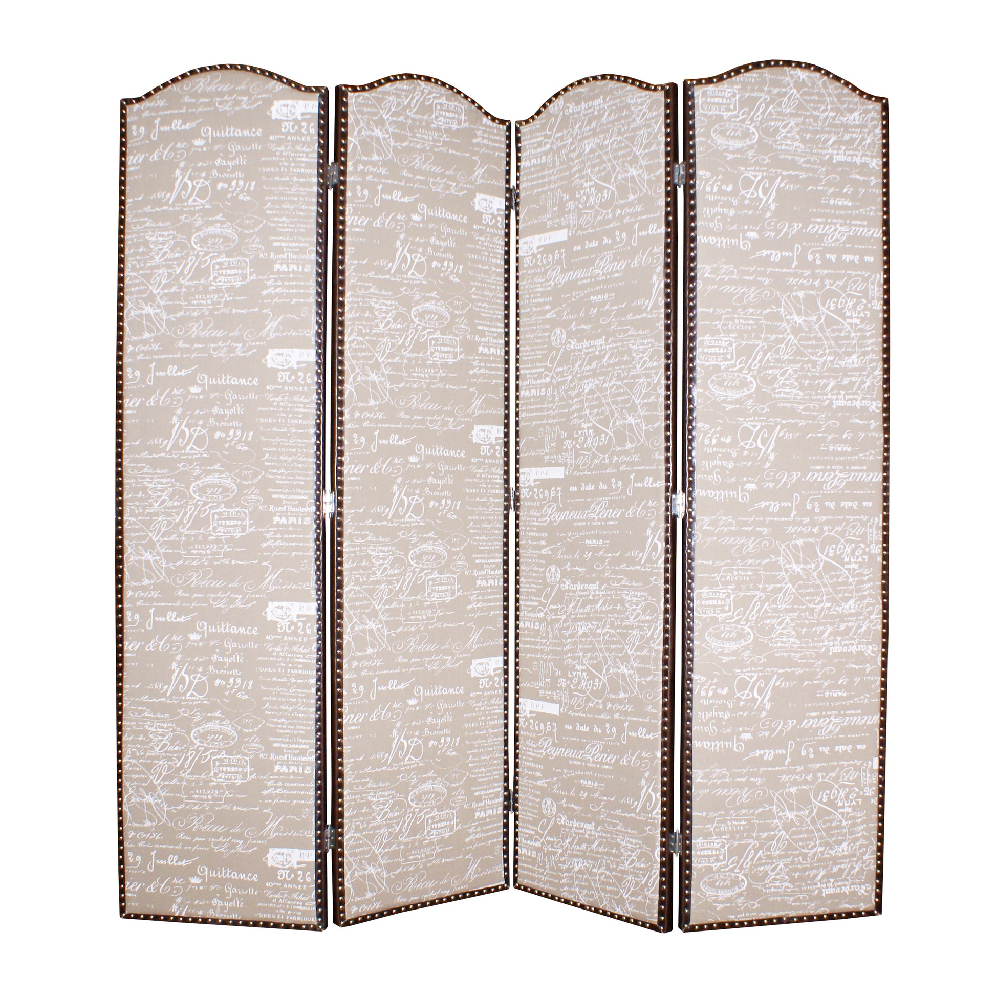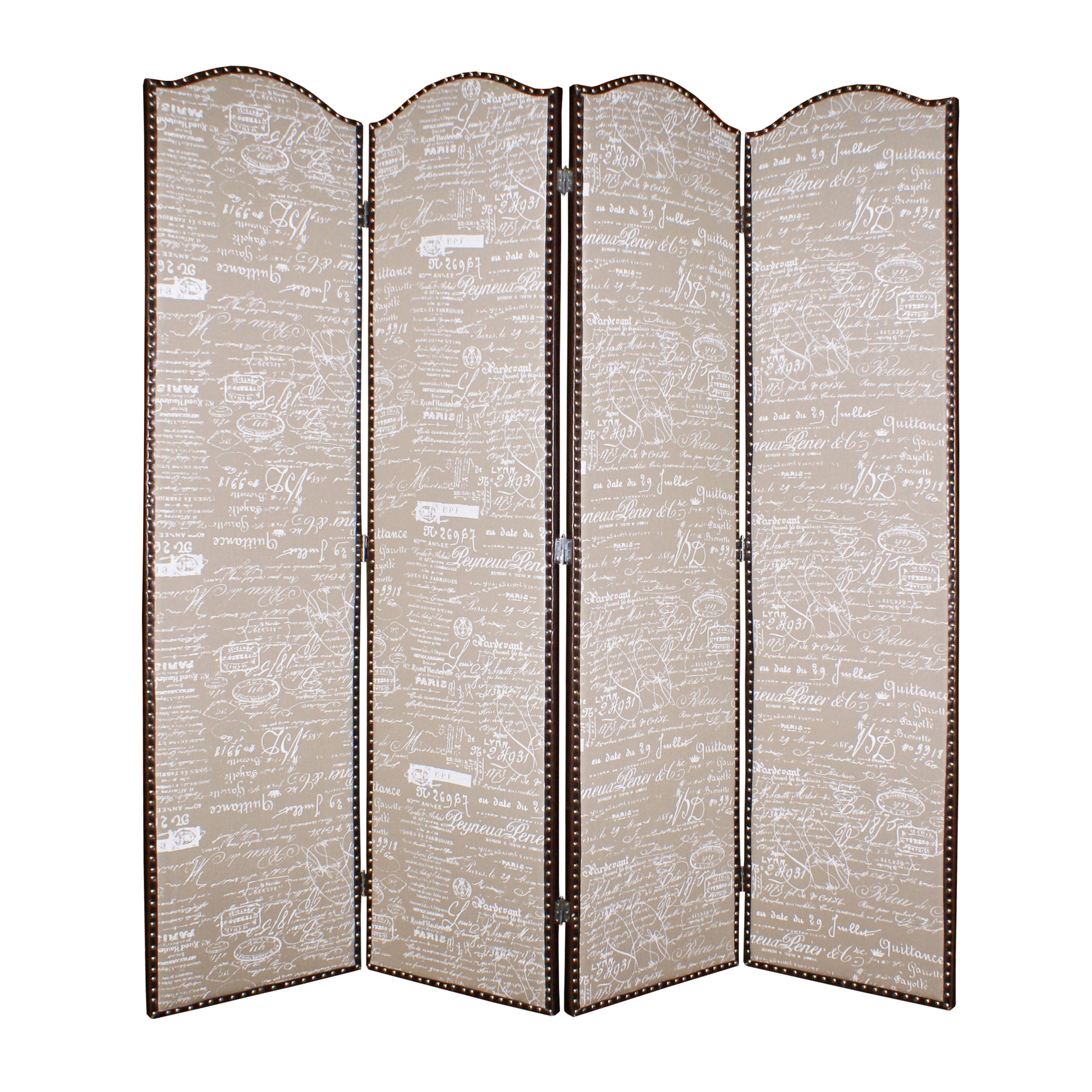 Add a natural, romantic look in a heartbeat with the GALORE Room Divider. Perfect for defining your space, this four-panel, double sided screen is crafted of sturdy fir with a textured burlap front decorated in a tufted ash fabric with letter design.