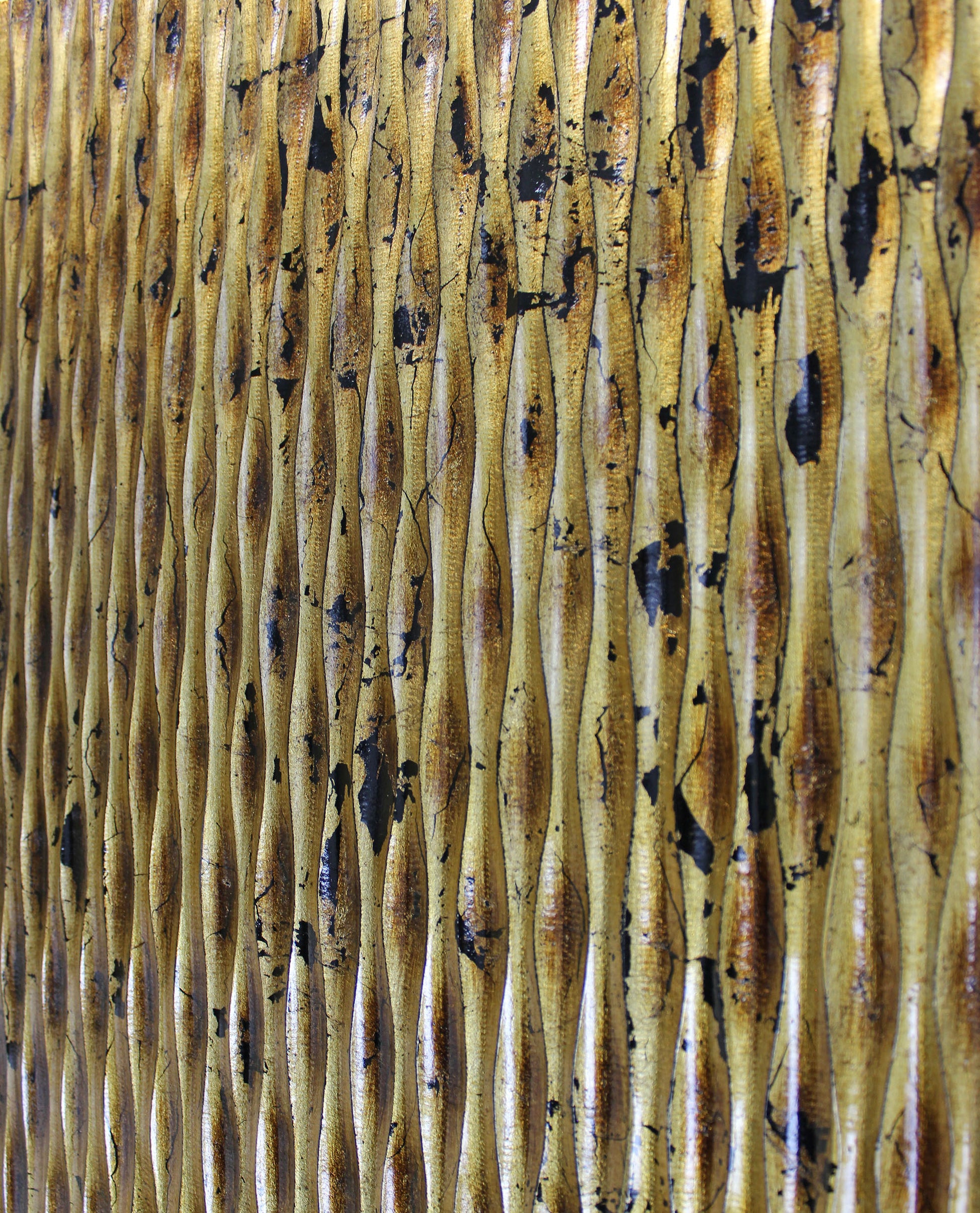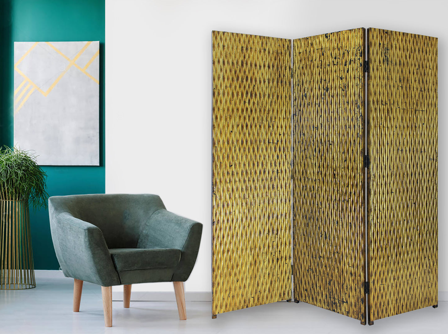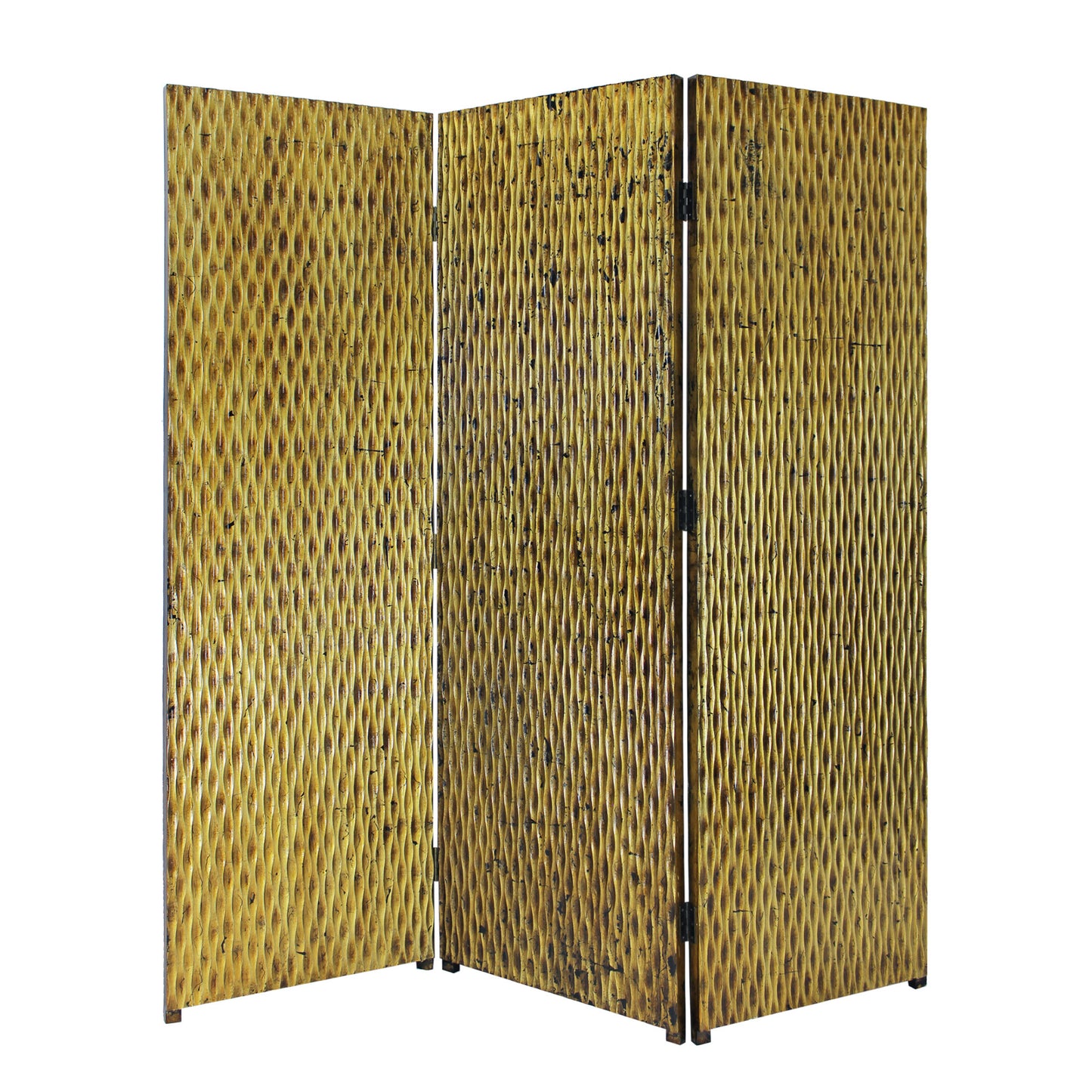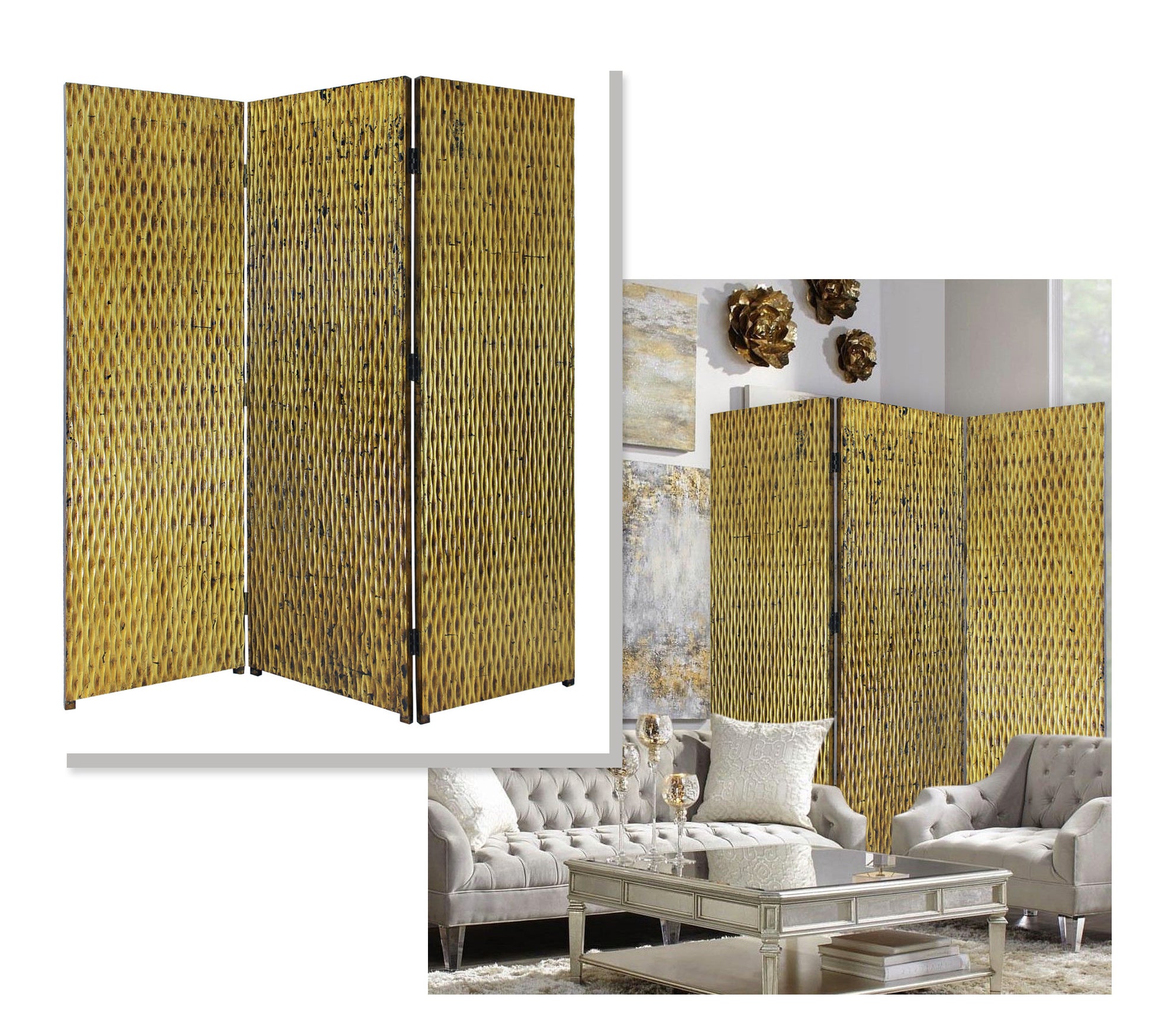 A 3 panel screen made of patterned wood panelling. The screen has a unique gold metallic finish with subltle brown and black accents to complement the screen. A 3 panel screen made of patterned wood panelling. The screen has a unique gold metallic finish with subltle brown and black accents to complement the screen.