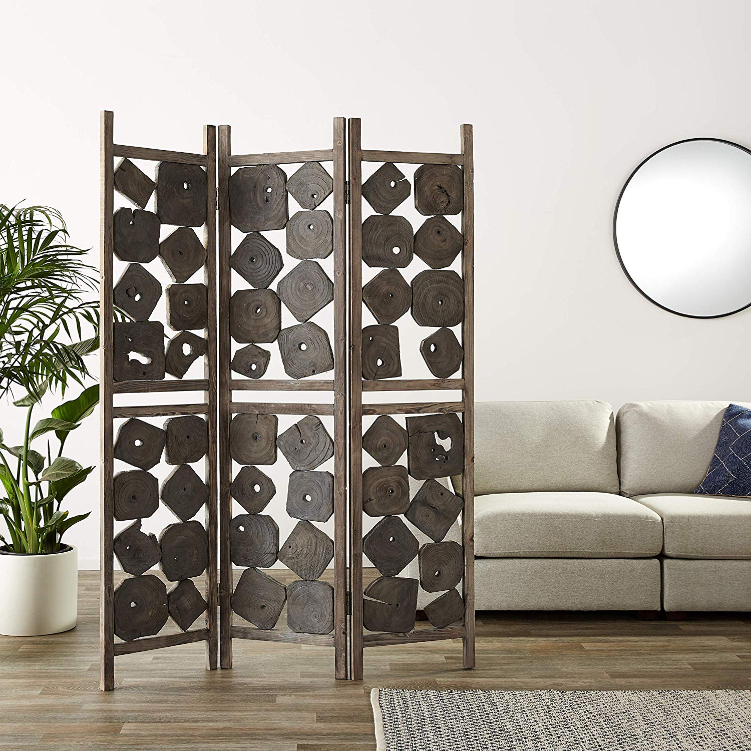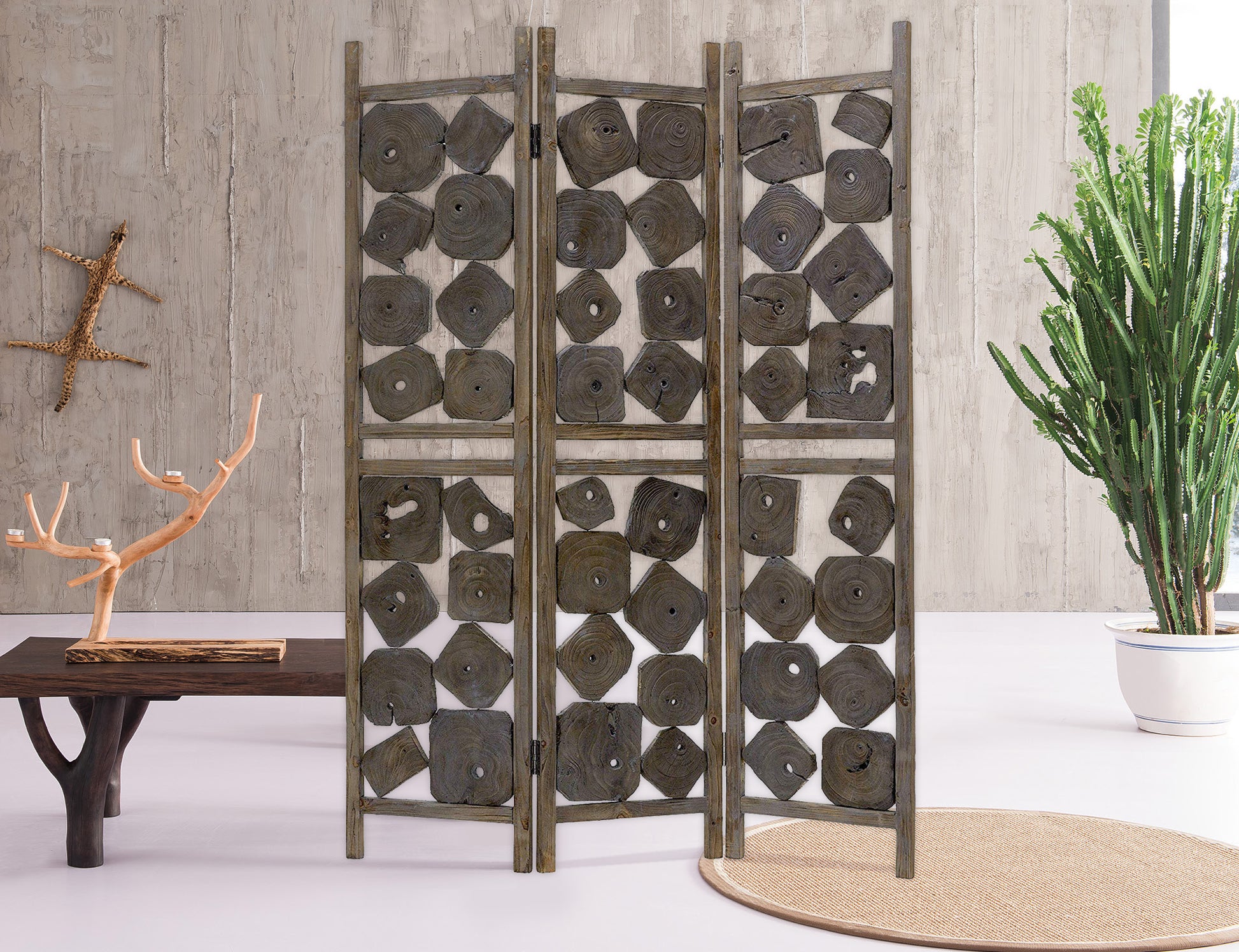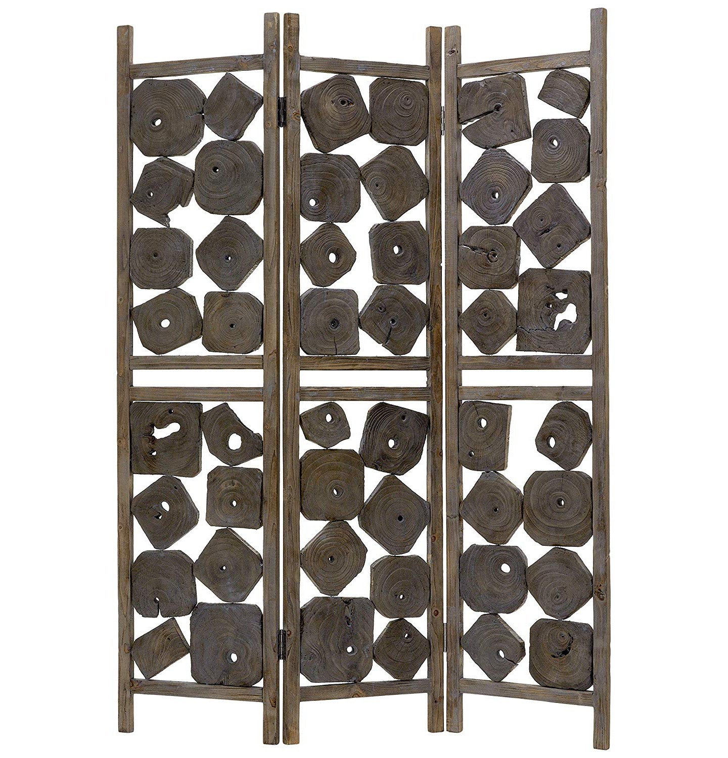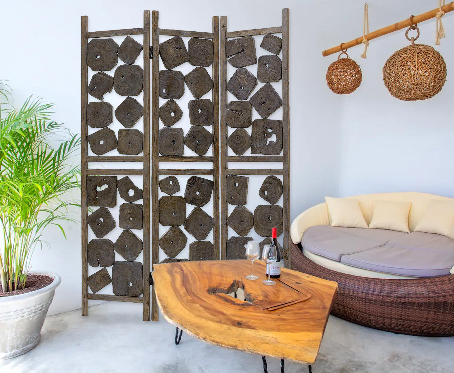 Screen Gems Glenbook Screen SG-314, bring an organic style to your home with this beautiful natural wood room divider. Each panel features hand cut circular wood pieces, uniquely placed to create the design. Making each piece one of a kind. Whether you want to divide a room, add privacy, or create a backdrop, this three-panel screen is sure to add a beautiful element to your home's decor.