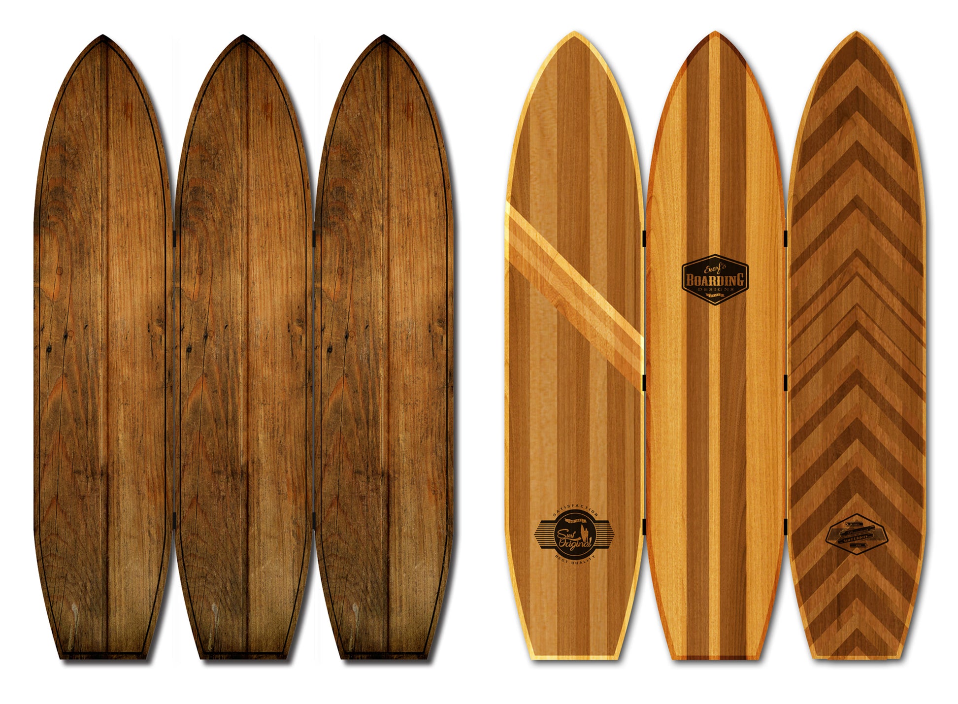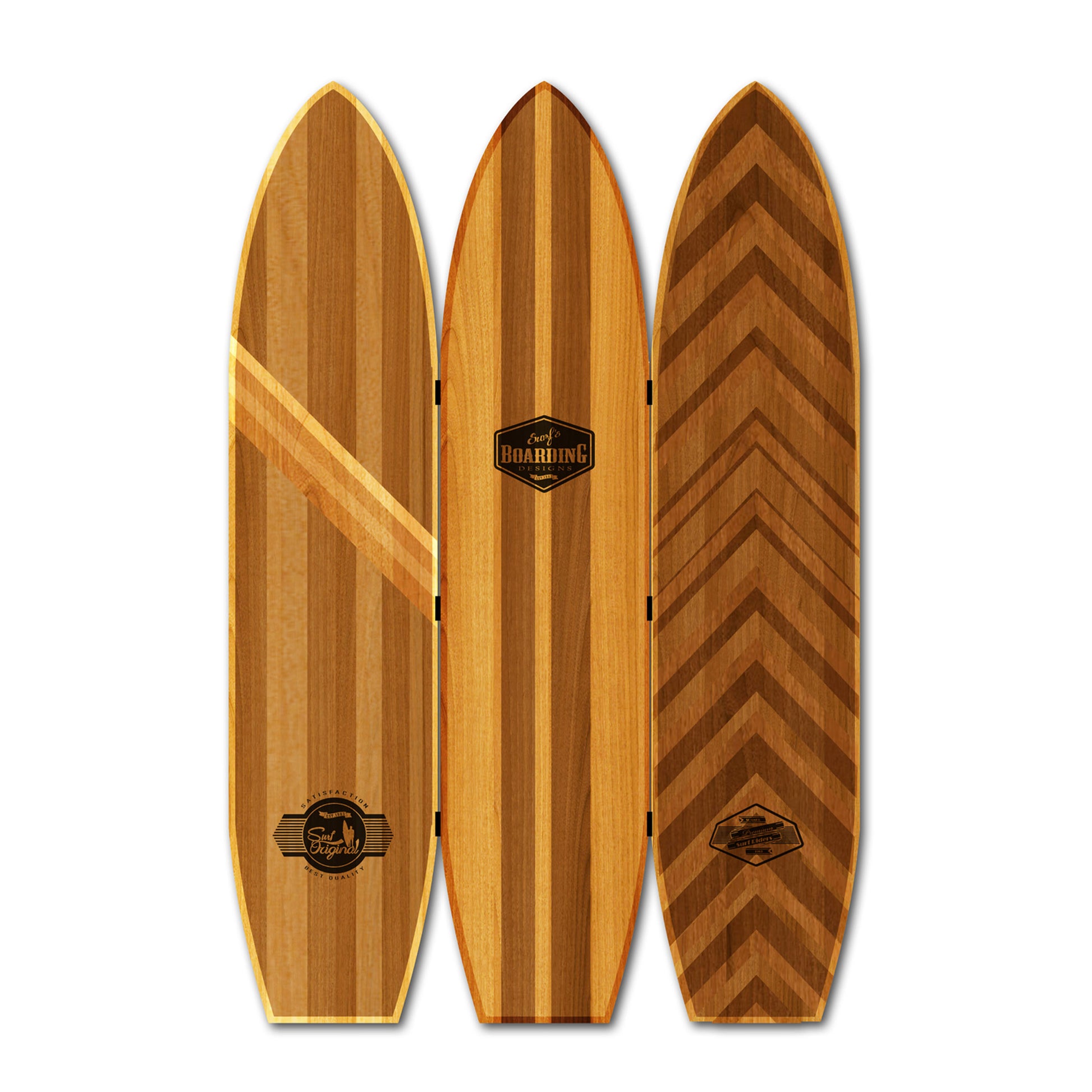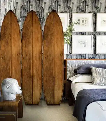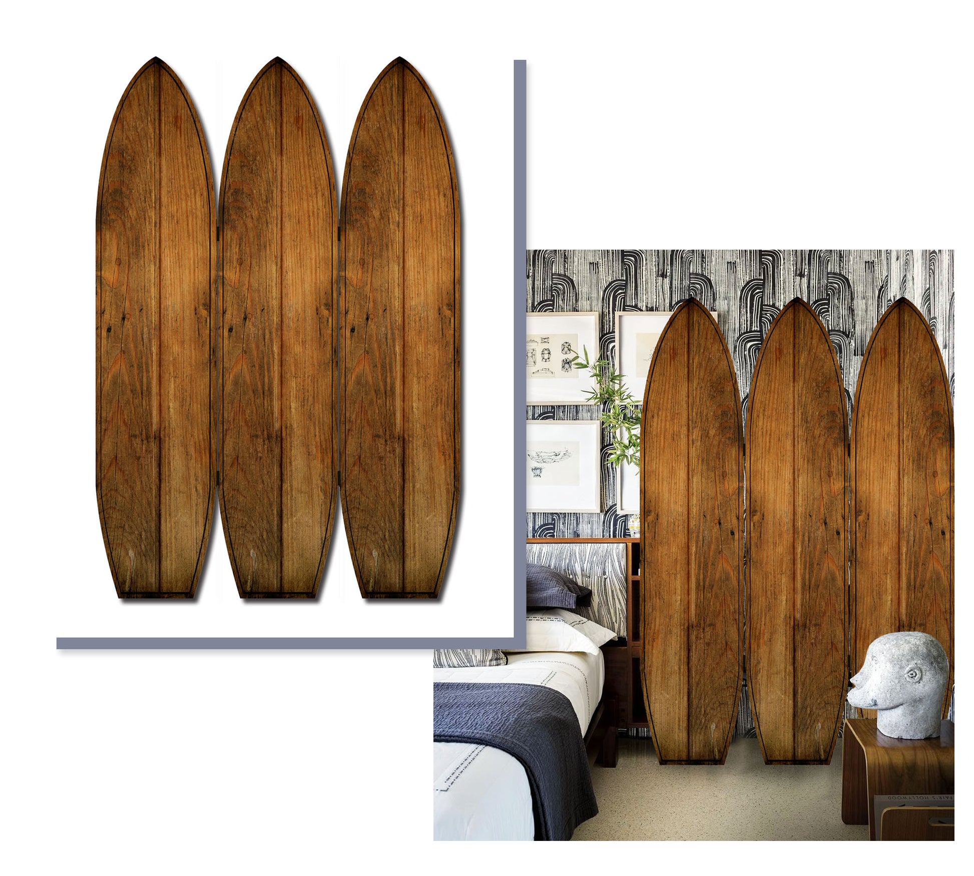 Screen Gems Kahuna Surfboard Screen SG-333, Live the coastal lifestyle with your very own screen shaped into three 3 surfboards hinged together. Inspired by traditional wooden surfboards. Different image on each side for your design options.