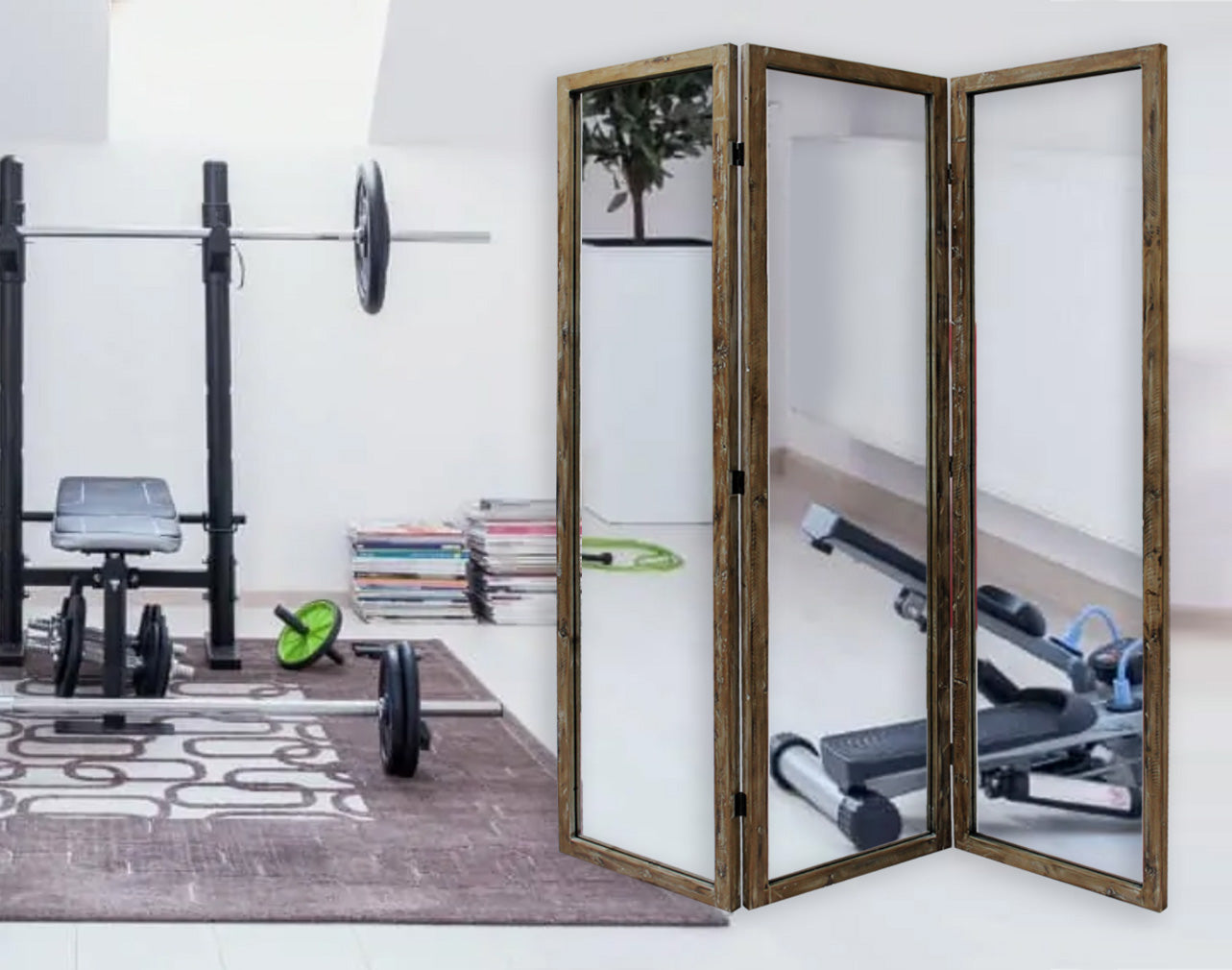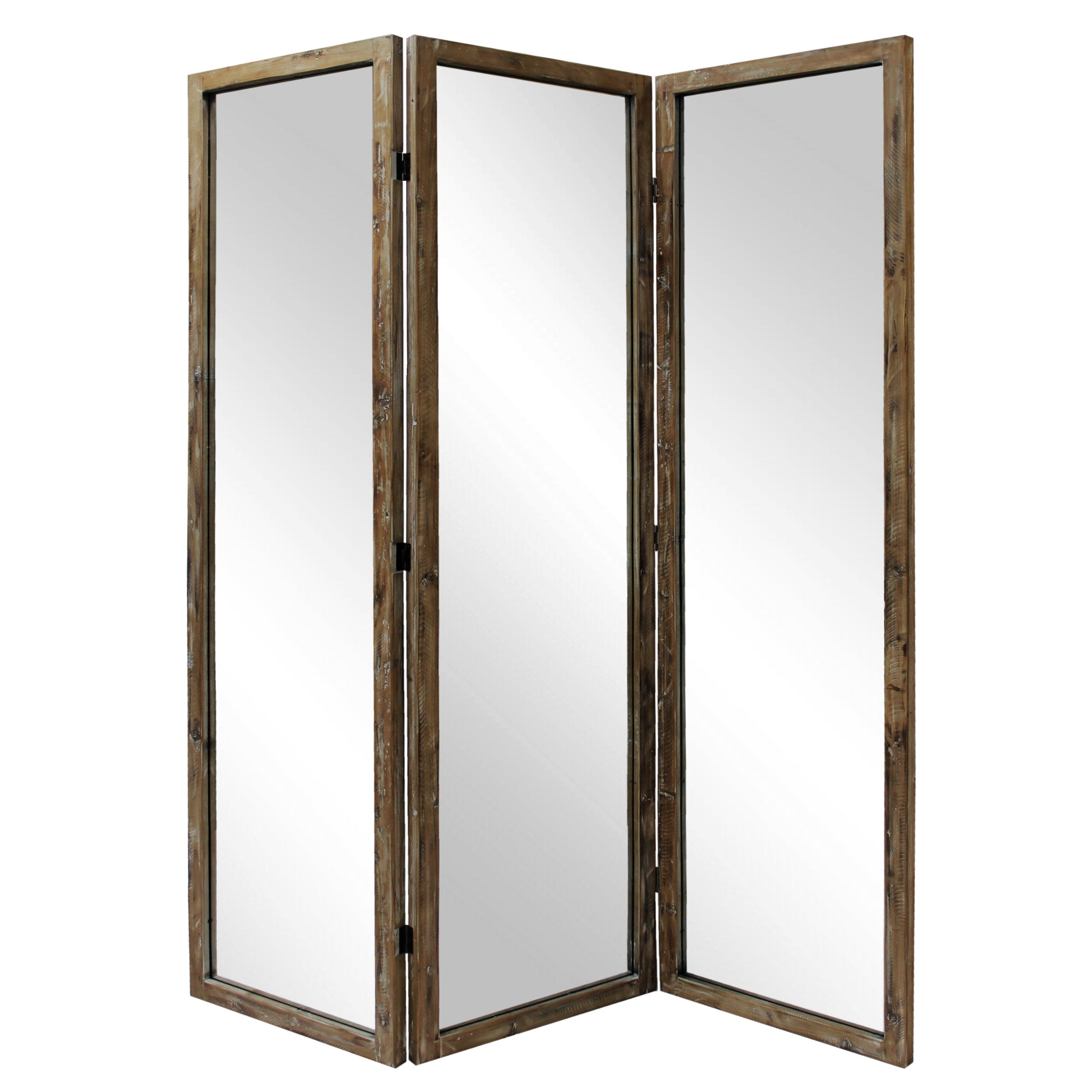 Screen Gems Karson Mirror Screen SG-356 is a 3 panel mirror room divider. Beautiful frame features a natural, distressed wood finish all around. Transitional enough to accommodate any design style. Perfect for a dressing room or make shift home gym. The mirror panels also give the optical illusion of more space, making any room of your home or office look bigger and brighter!