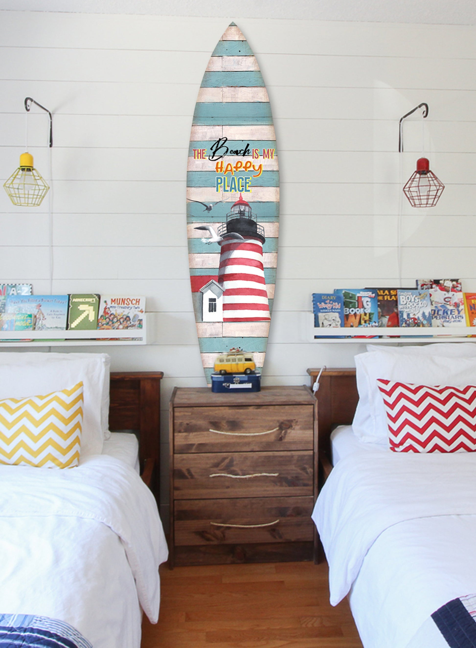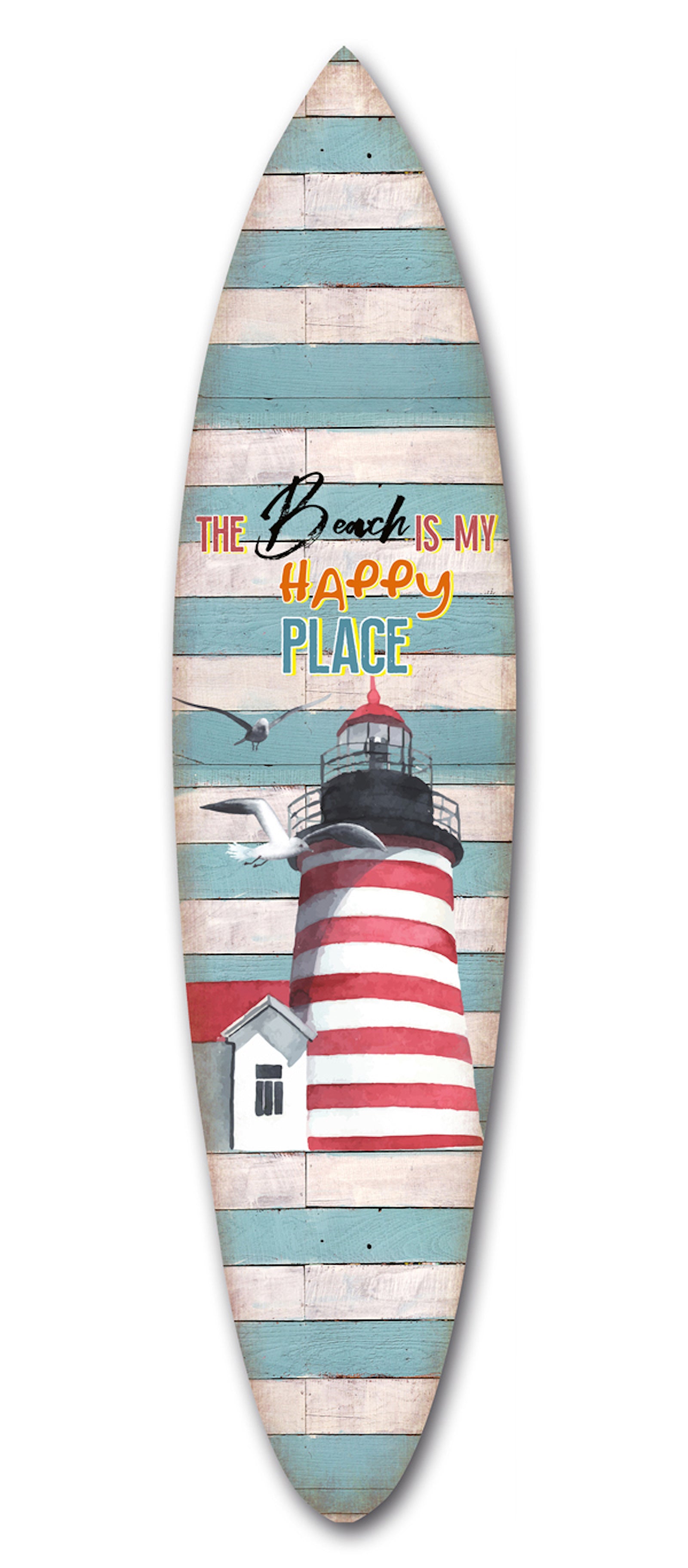 Screen Gems Lighthouse Surfboard Wall Art SGW91911 features vibrant colors printed on a wood panel. The distressed graphics give this piece a one-of-a-kind vintage feel. Invisible mount and hardware on the back make it easy to hang vertically or horizontally. Perfect for any decor!