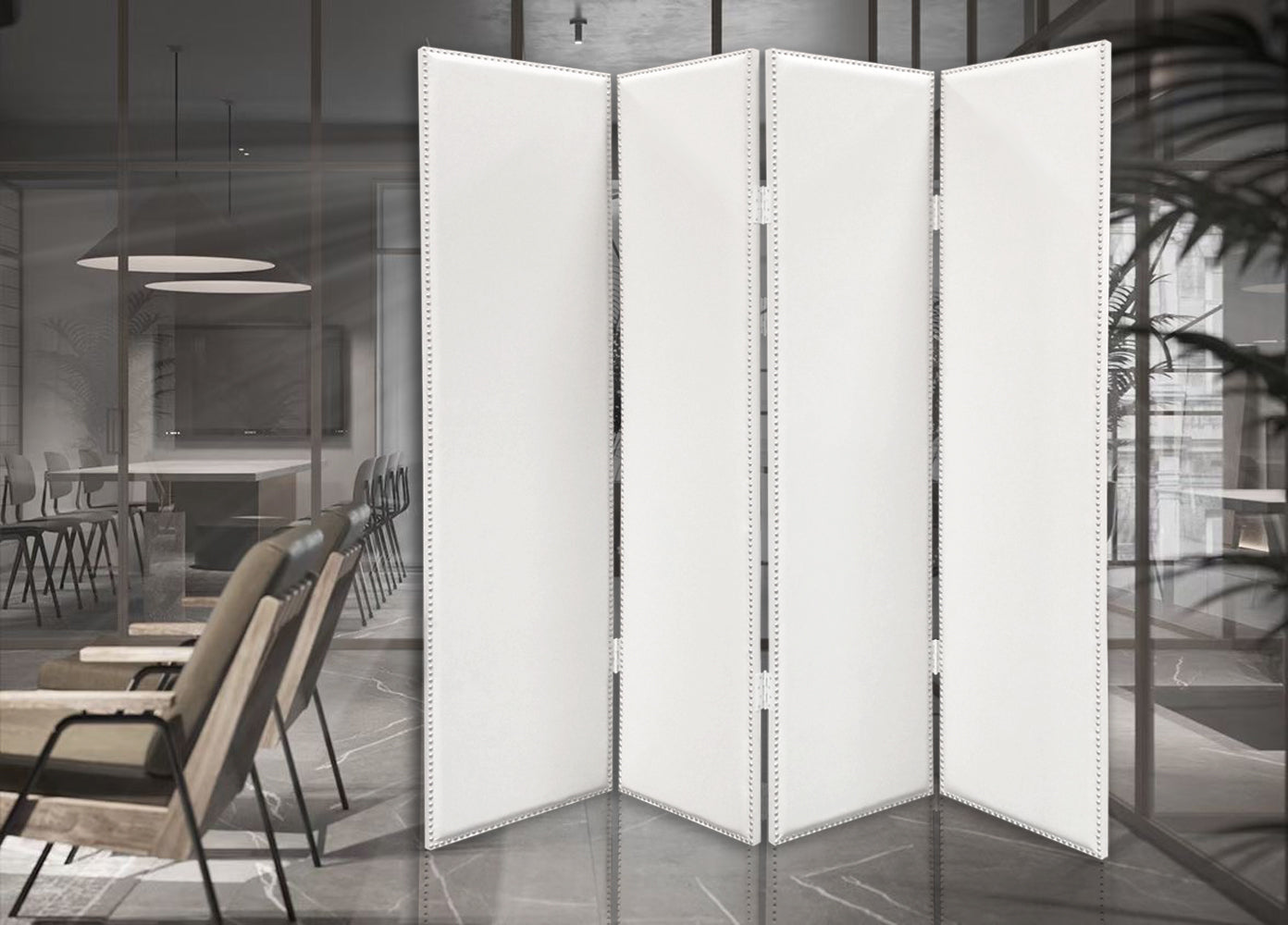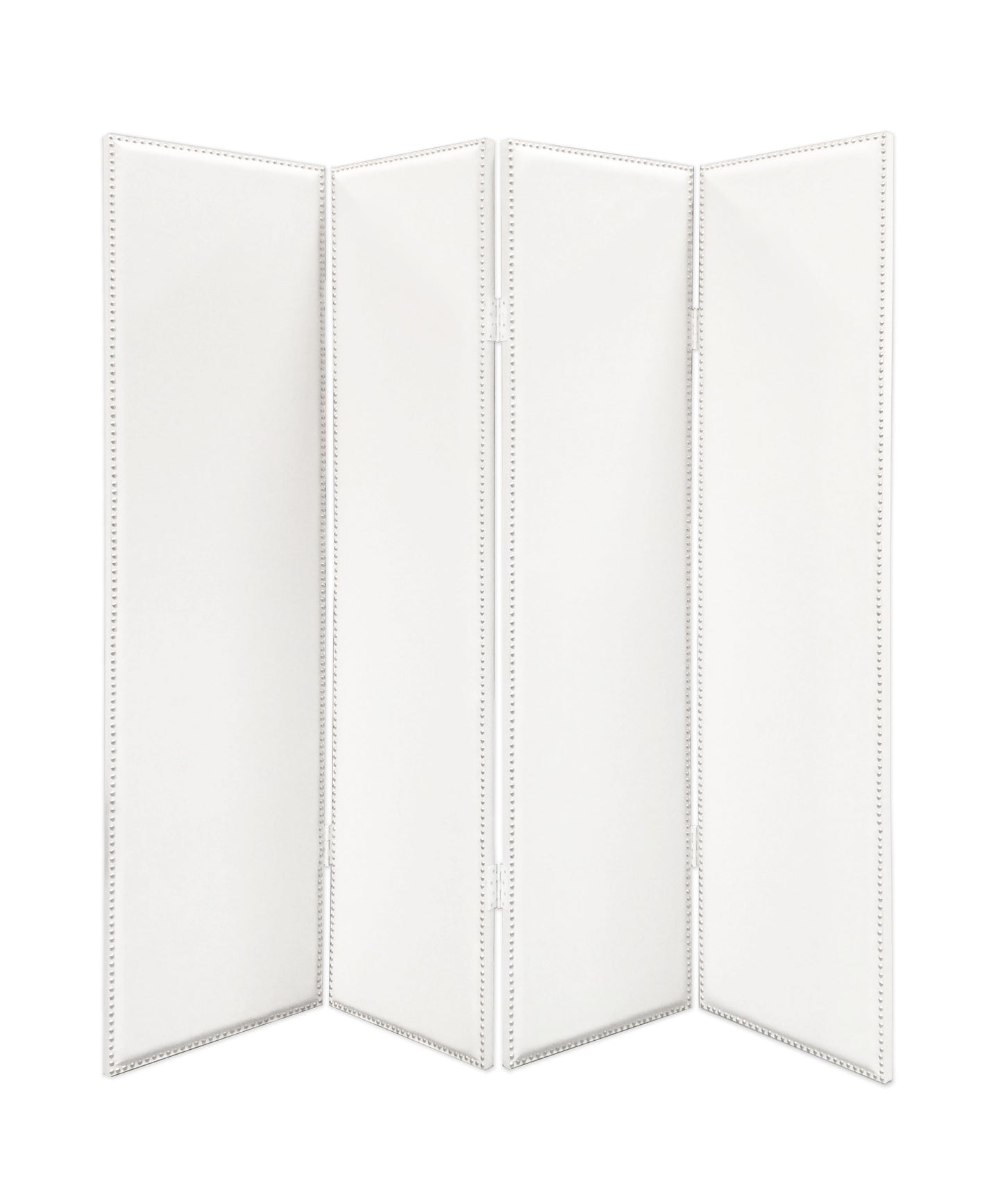 The Milano is a high-design, 4-panel screen. Each panel is stylishly designed with square white leather patterns accented with white leather-wrapped buttons, all surrounded by nail head accents. This handmade screen is finished on both sides. The Milano is a high-design, 4-panel screen. Each panel is stylishly designed with square white leather patterns accented with white leather-wrapped buttons, all surrounded by nail head accents. This handmade screen is finished on both sides.