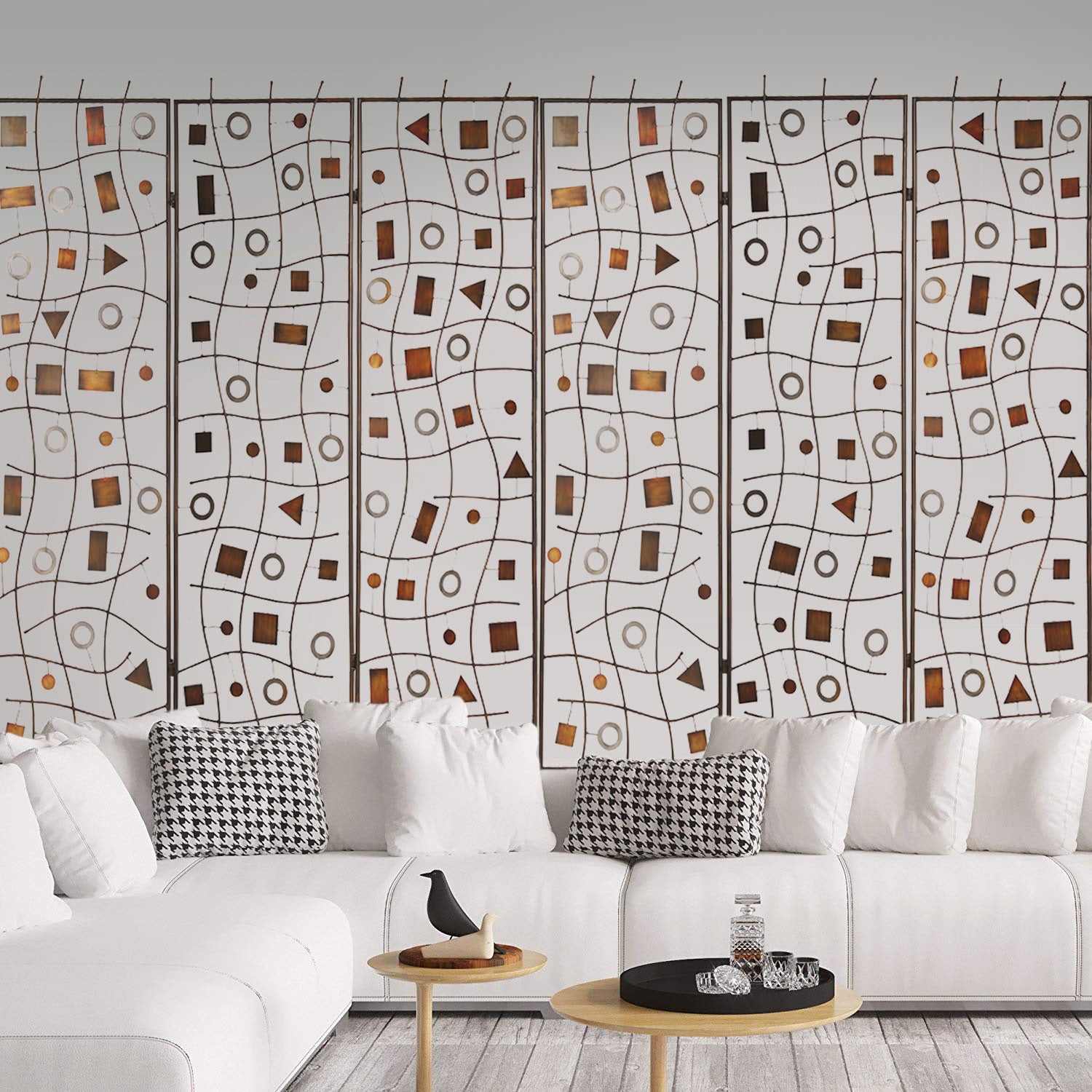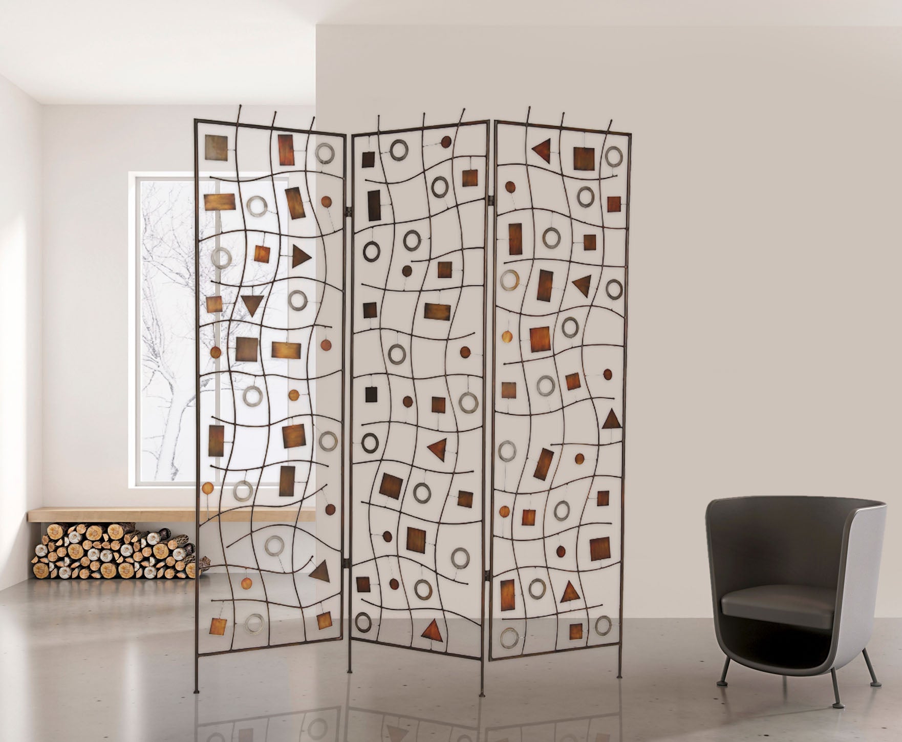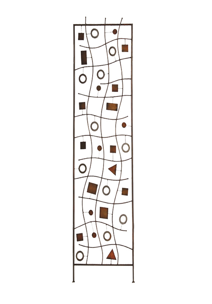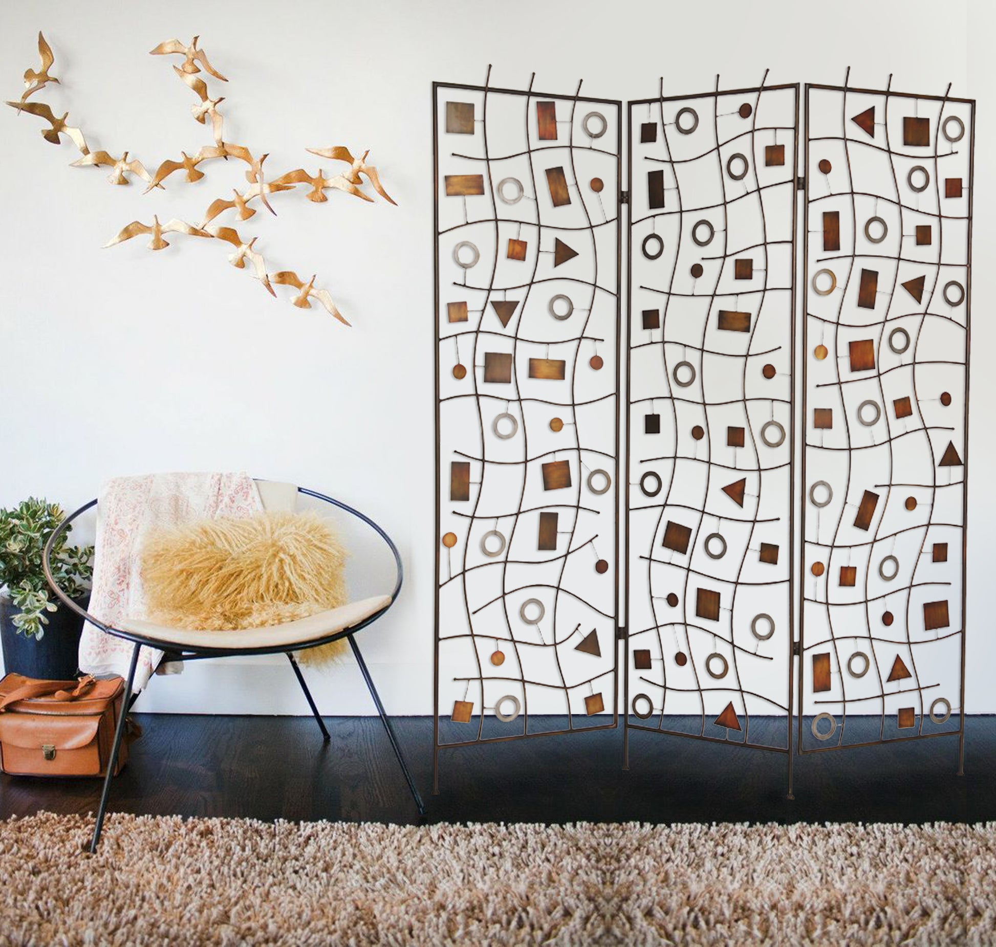Screen Gems Morton Screen is a 3 panel solid metal screen. The unique design is accented by fun, contemporary, multi-colored geometric shapes. It is light weight and easy to move.