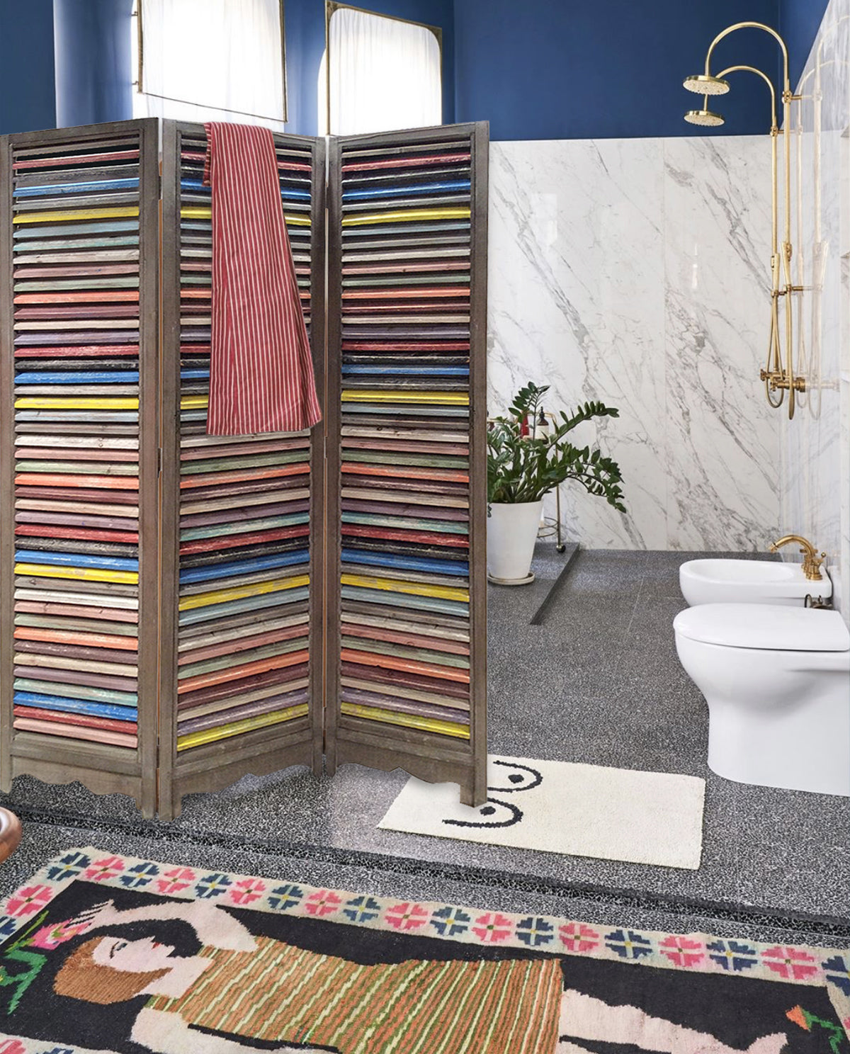 Screen Gems Multi-colored Shutter Screen SG-232, this architectural detailing of traditional shutter screen can enhance the interior and exterior of a house. The colors in these shutters pick up on the hues from the floor, walls and furniture, helping to tie it all together. Vinyl in the bathroom, café style in the kitchen, clerestory in the living room — today's shutter screens are terrific for every room in the home.