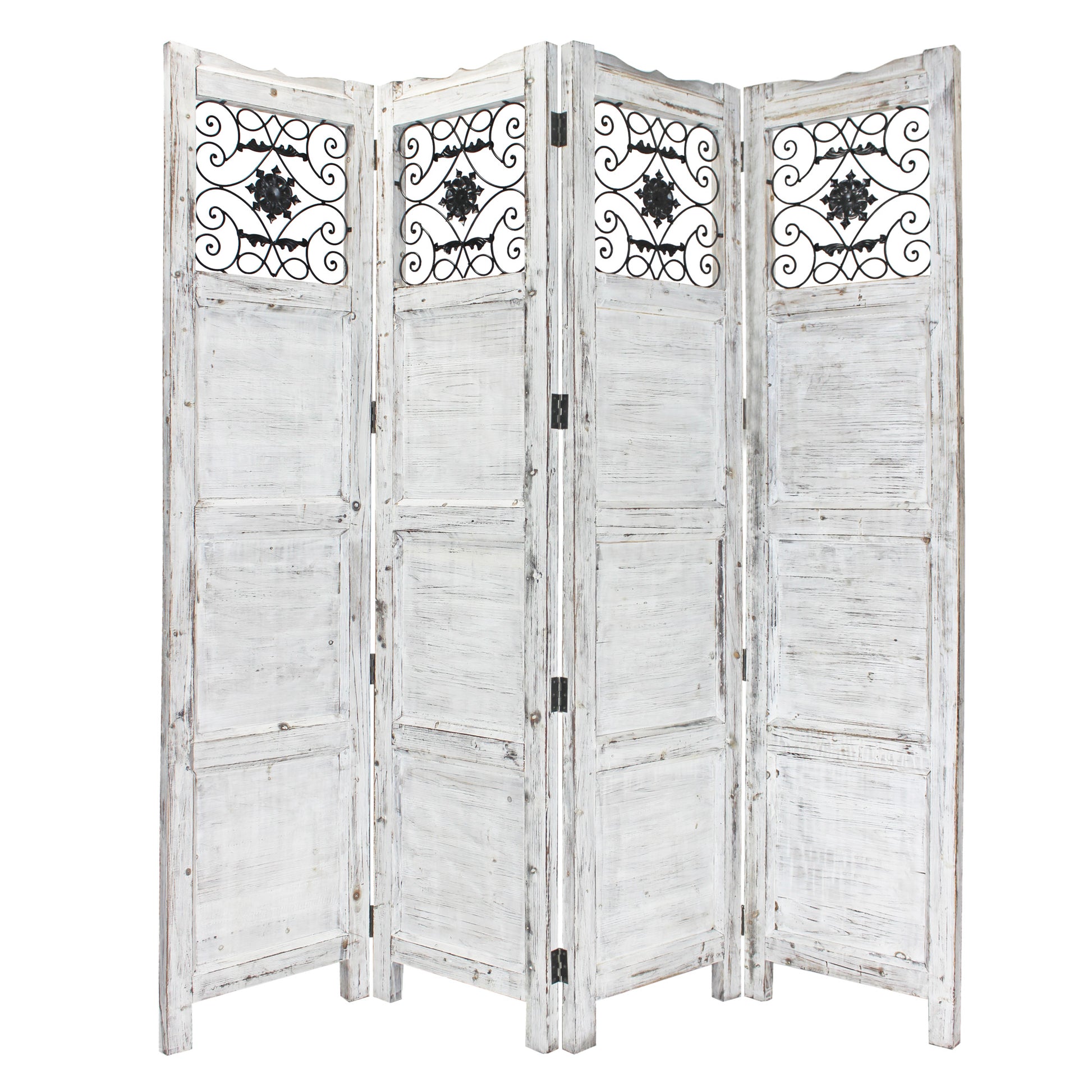 Salisbury 4 Panel Floor Screen has a frame and panels of solid cedar wood stained in a washed Soft White finish. Detailed scroll work on the top panels are made from stamped antique brass metal insets. This handmade Floor Screen is finished on both sides Salisbury 4 Panel Floor Screen has a frame and panels of solid cedar wood stained in a washed Soft White finish. Detailed scroll work on the top panels are made from stamped antique brass metal insets. This handmade Floor Screen is finished on both sides