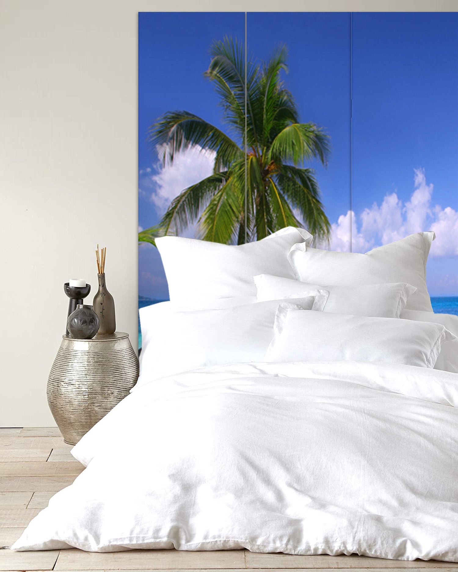 This is a 3 panel screen printed on canvas. The screen is two sided with different and complementary images on each side. It is light weight and very easy to move. The screen also has inspirational wall décor applications. One price gets two different finishes, Switch sides to get a fresh look because each side finishs with different scenery