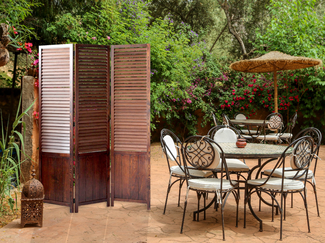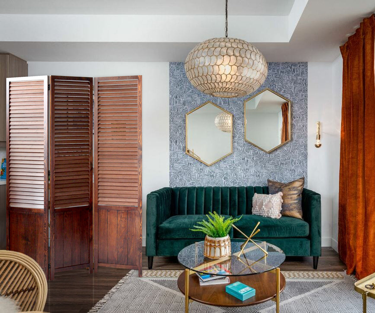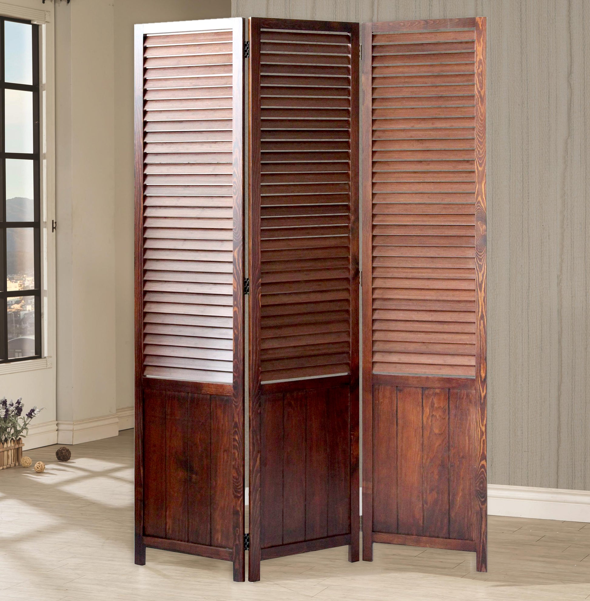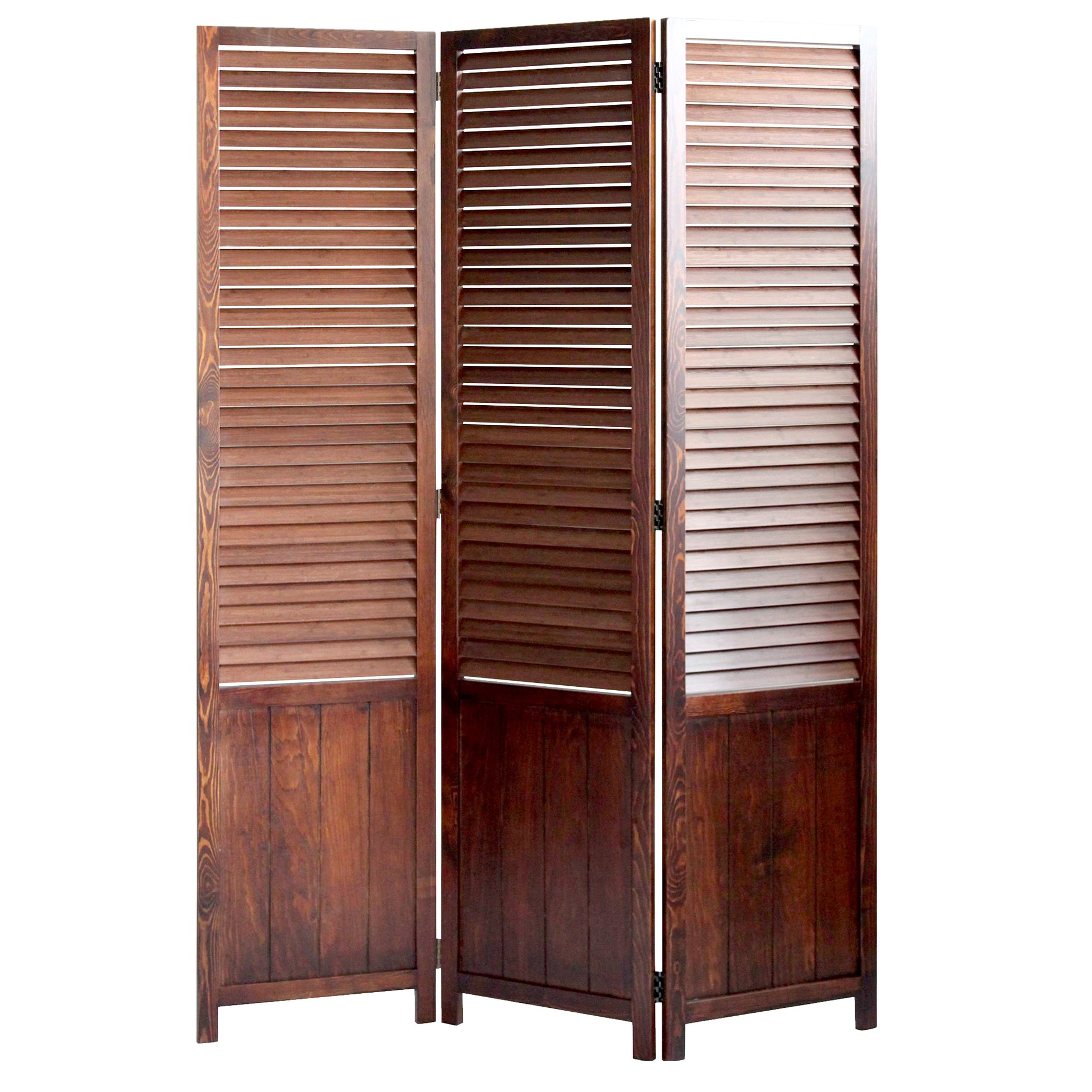 This is Espresso Wood Frame with carboined bamboo shutter 3 Panel Floor Screen; It's finished the same on both sides and can be used at any setting.