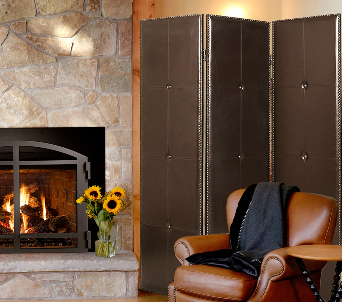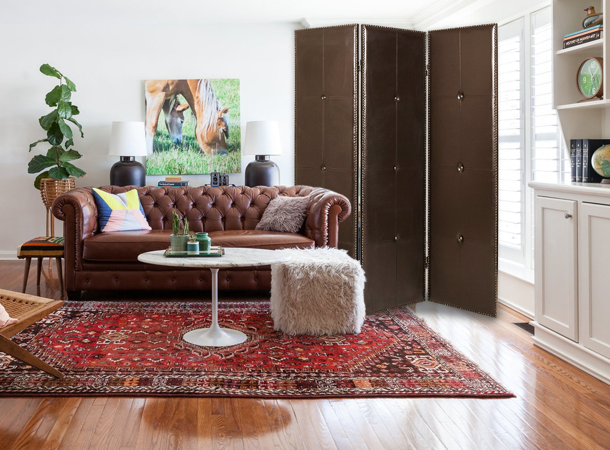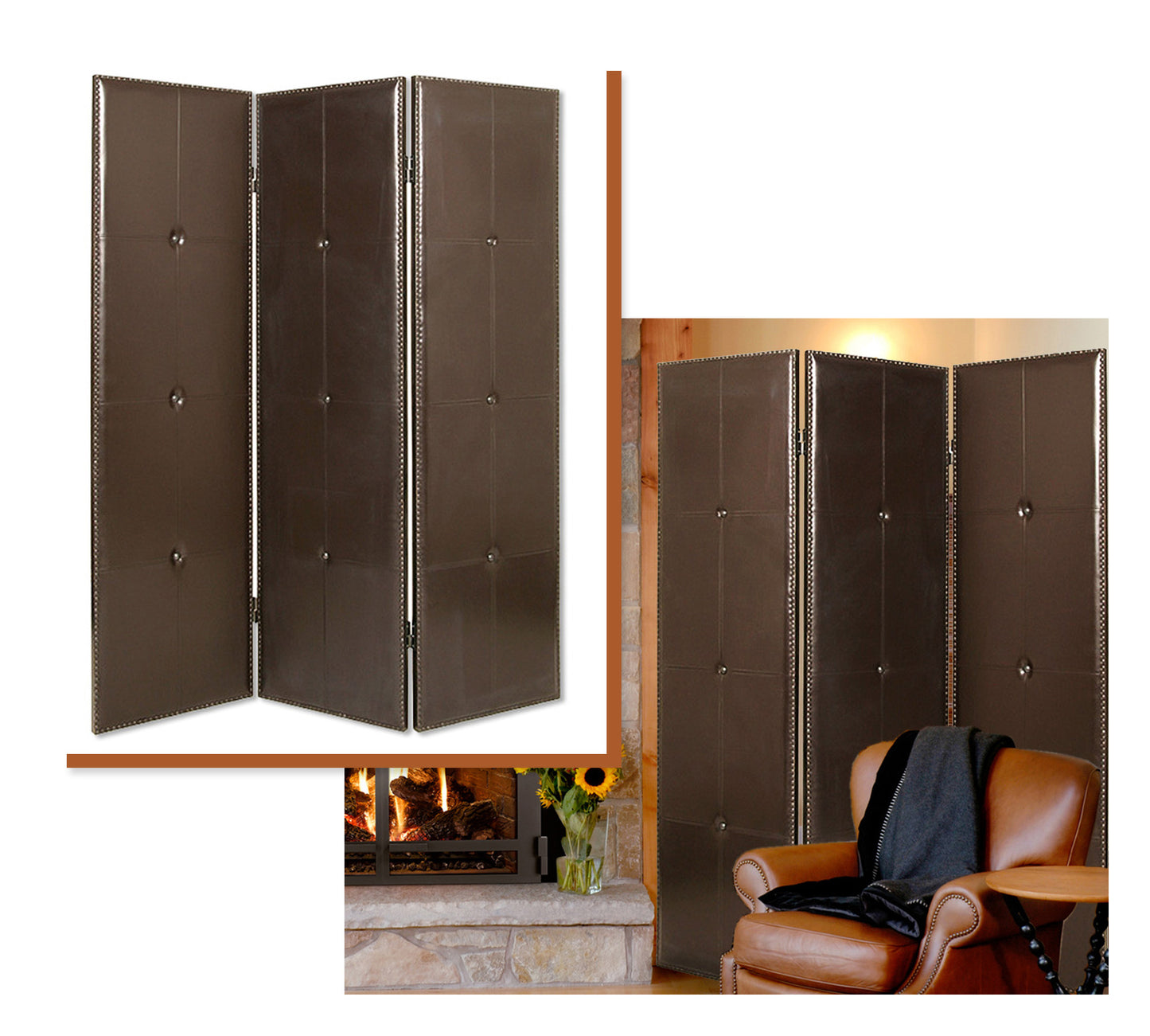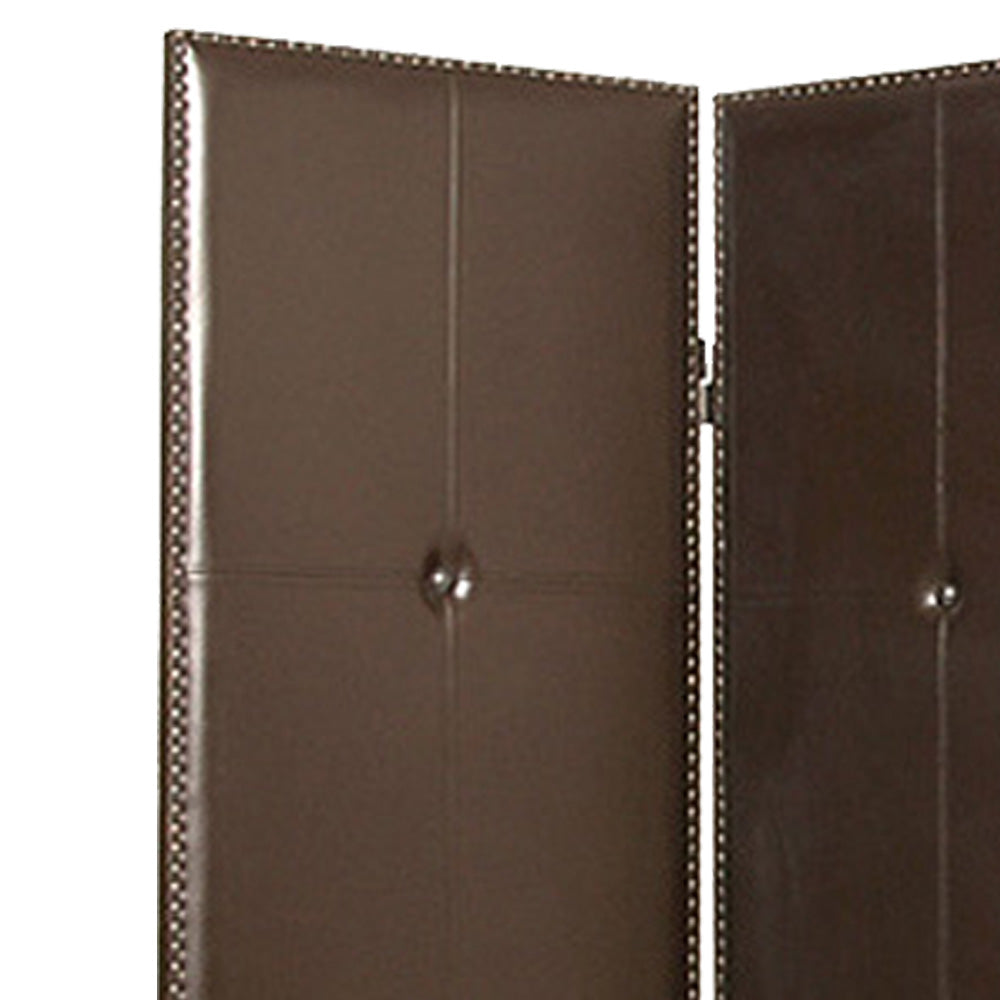 Regent 3 Panel Black Faux Leather Floor Screen with diamond stitched seams and button tufted. The screen is trimmed in antique brass nail heads. Faux Leather on the front side with a solid wood brown panel back.