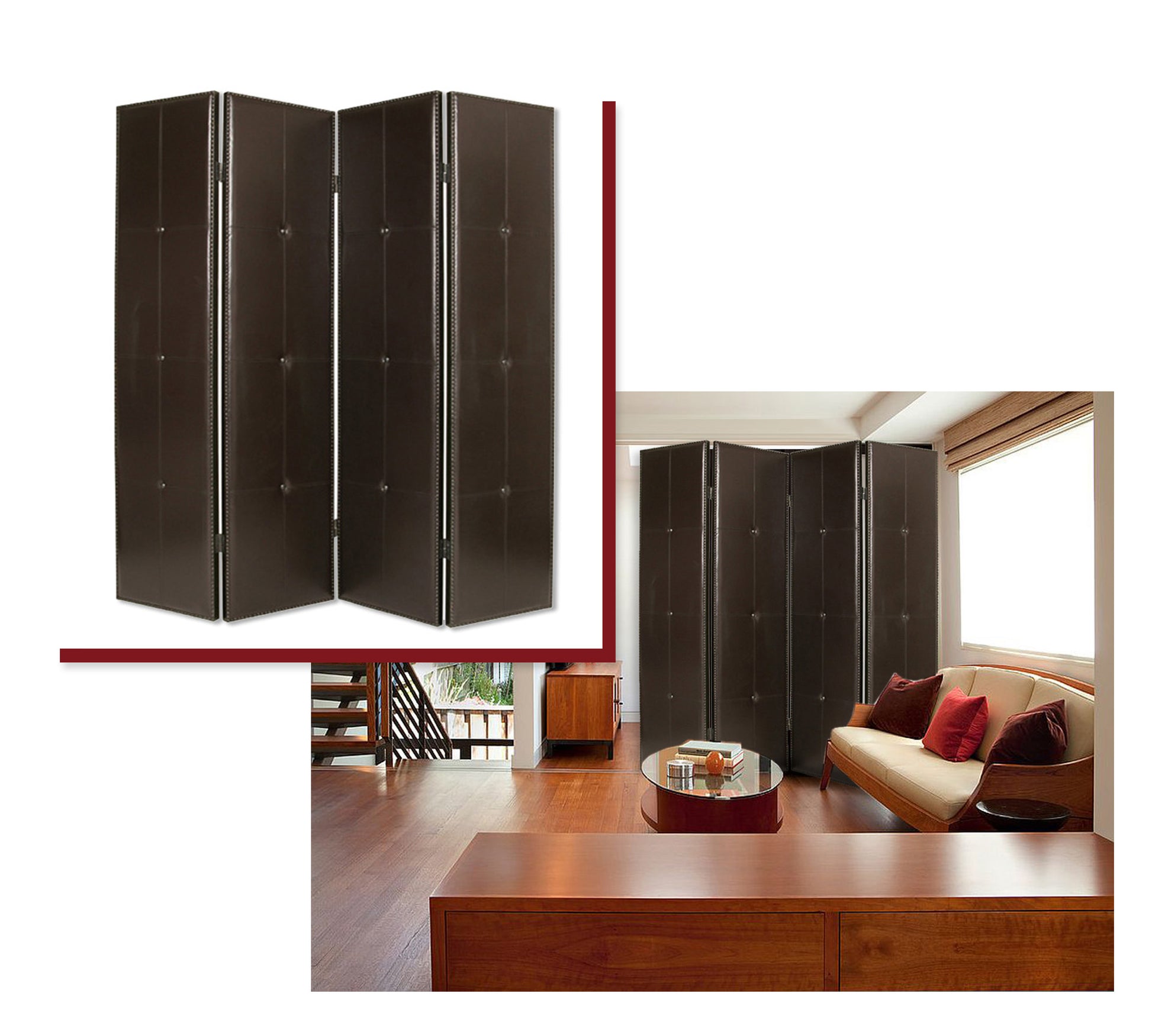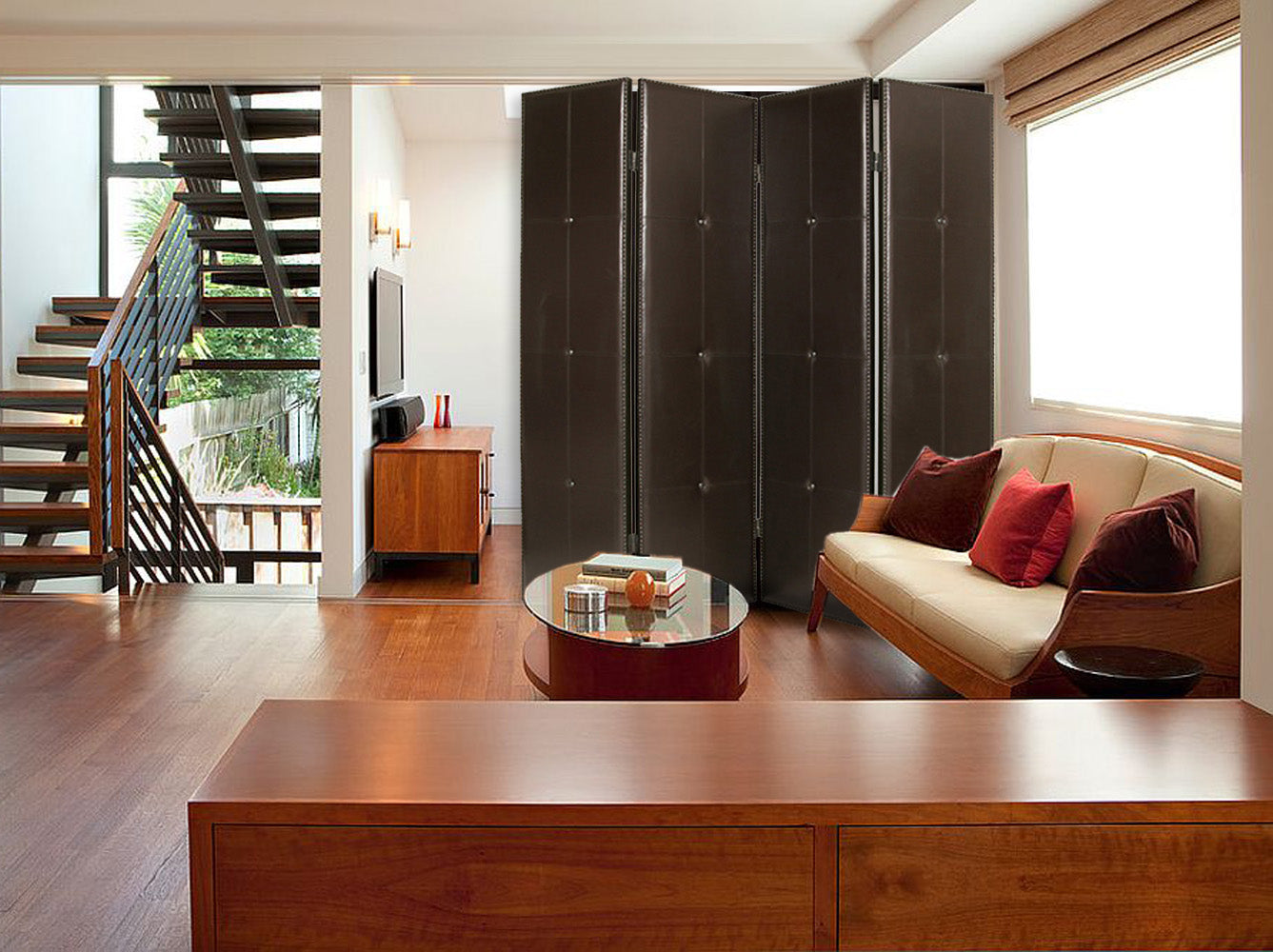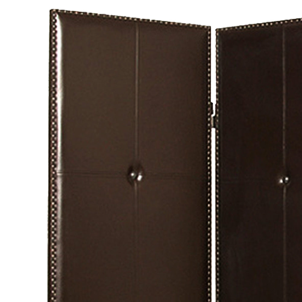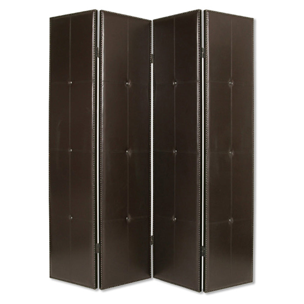 Regent 4 Panel Black Faux Leather Floor Screen with diamond stitched seams and button tufted. The screen is trimmed in antique brass nail heads. Faux Leather on the both sides.