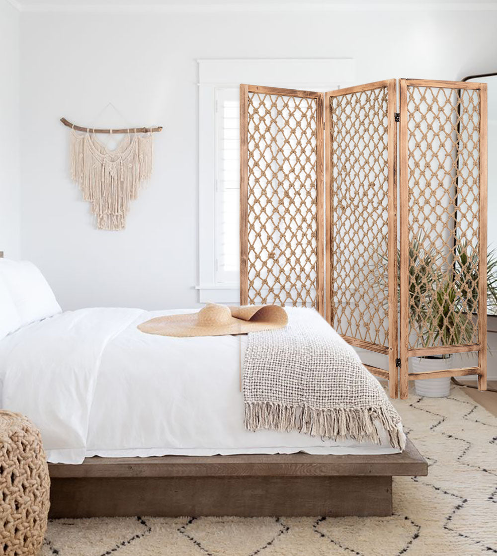 3 panel foldable screen. Wood frame with decorative rope inset, perfect for an indoor and outdoor setting.