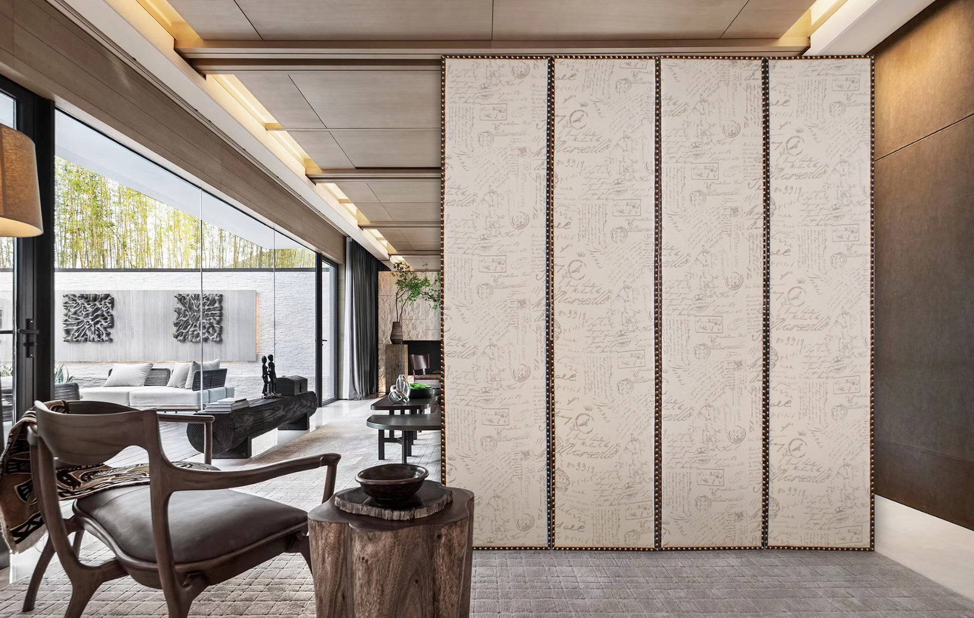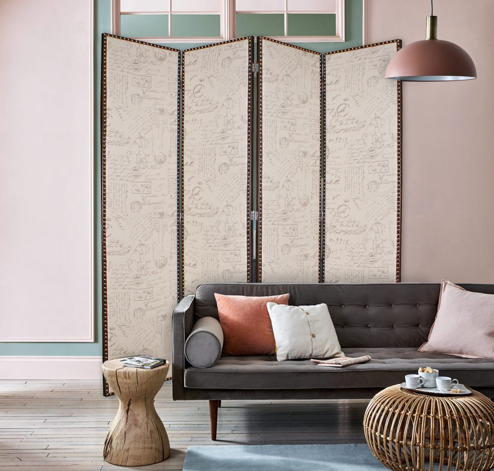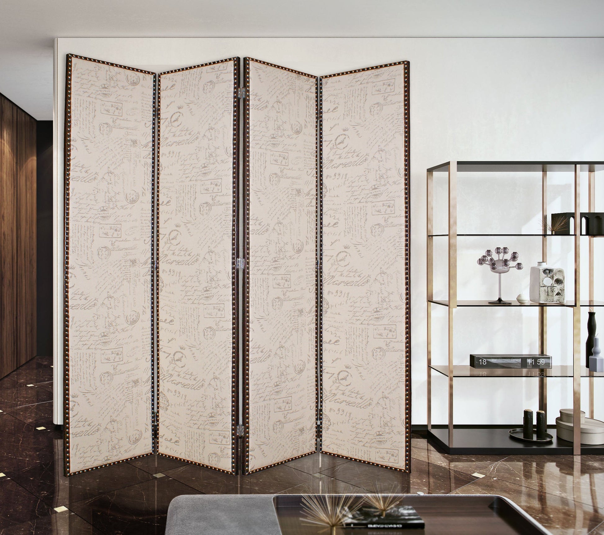 - Each panel is stylishly designed and finished with high quality of fabric, Screen is trimmed in antique brass nail heads
