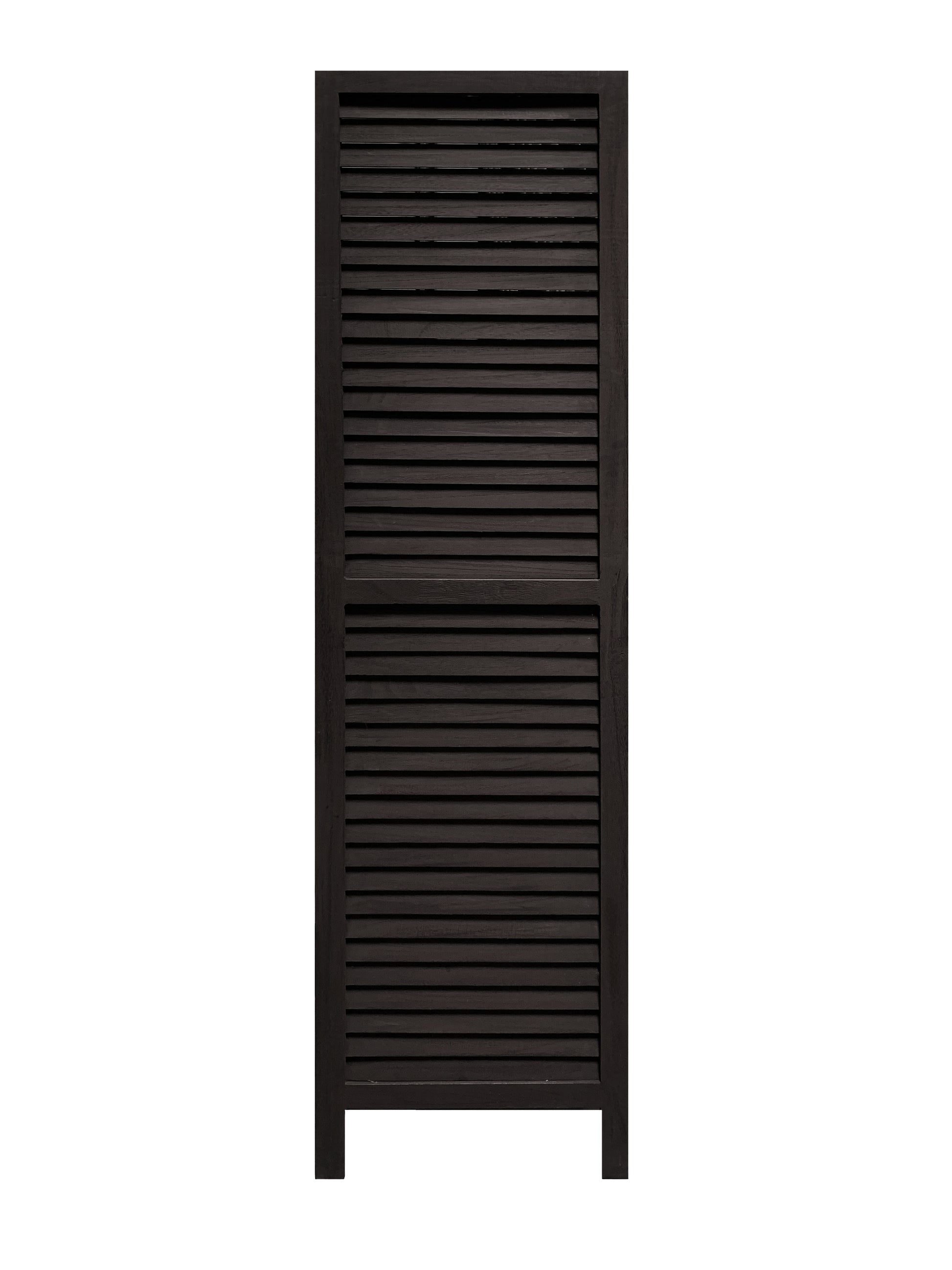 This is a 3 panel black shutter screen. The fitted slats allows gentle light filtering. This piece will give you style and design to any settings.