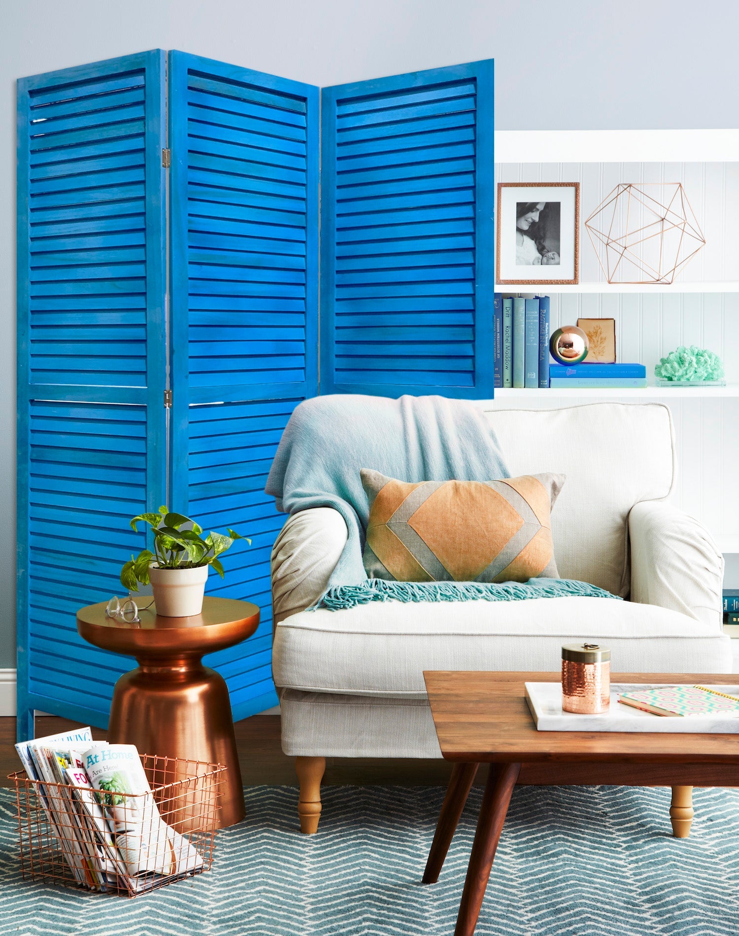 This is a 3 panel black shutter screen. The fitted slats allows gentle light filtering. This piece will give you style and design to any settings.