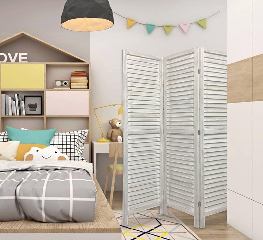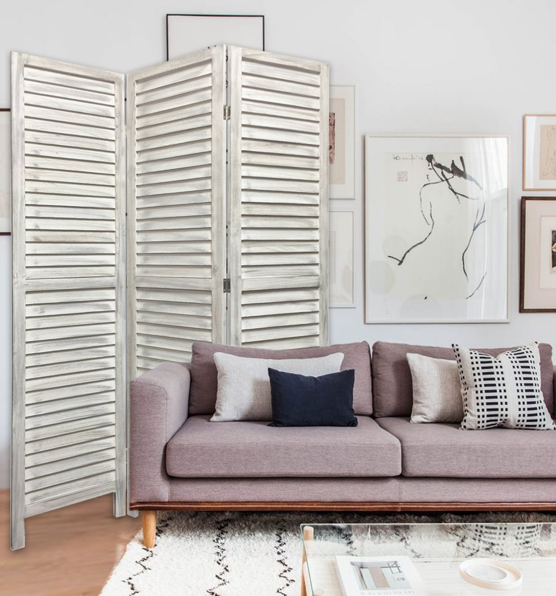 This is a 3 panel washed white shutter screen. The fitted slats allows gentle light filtering. This piece will give you style and design to any settings.