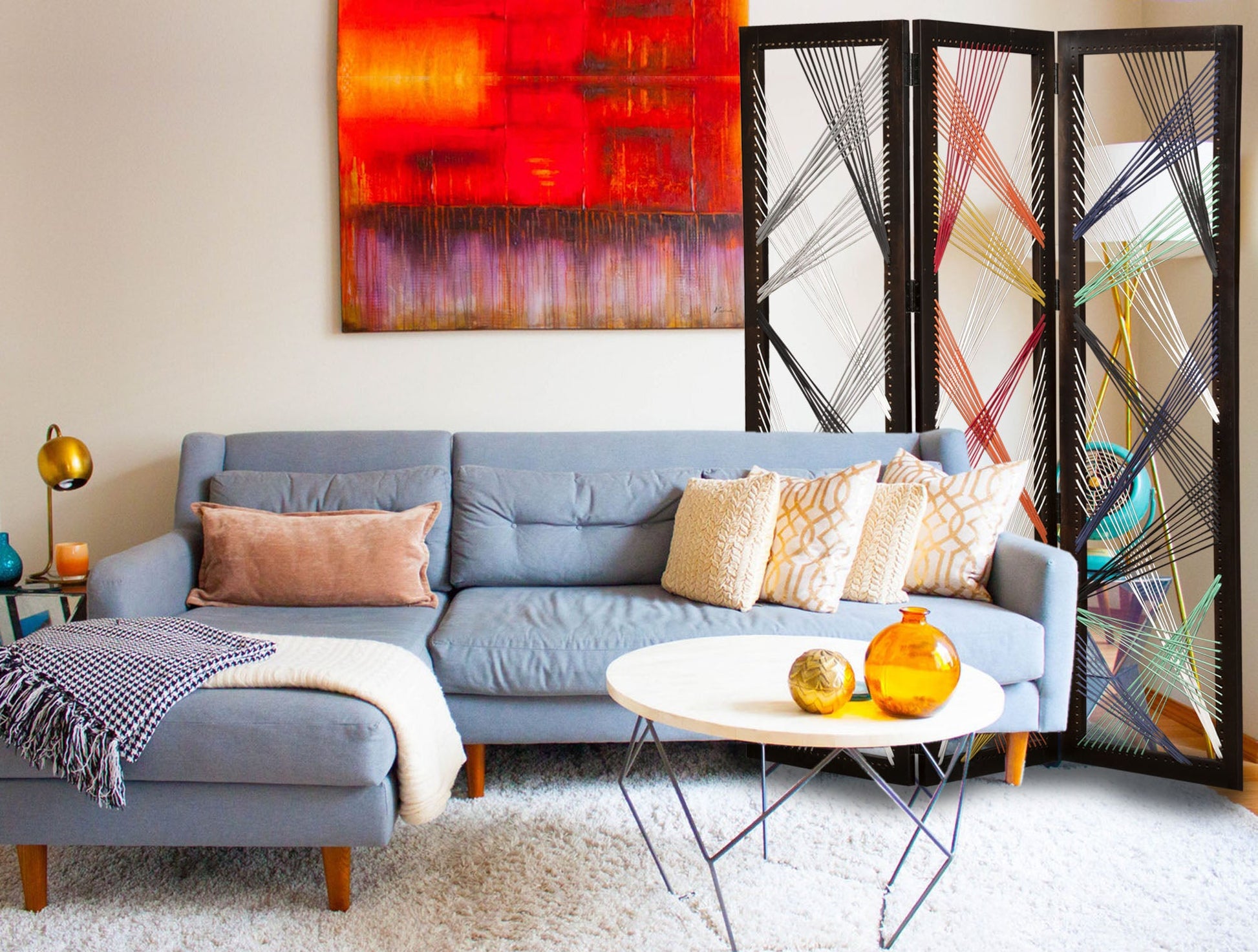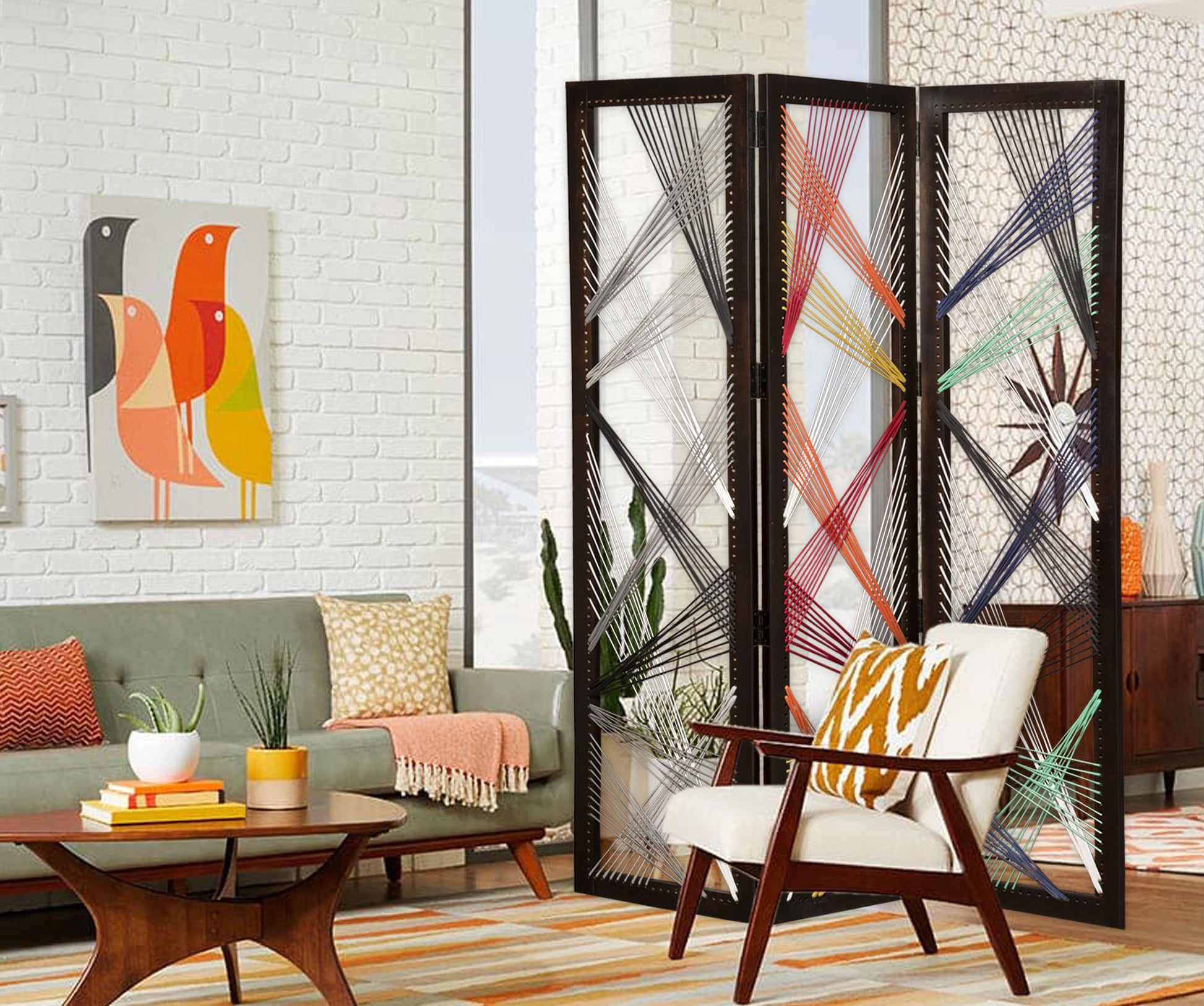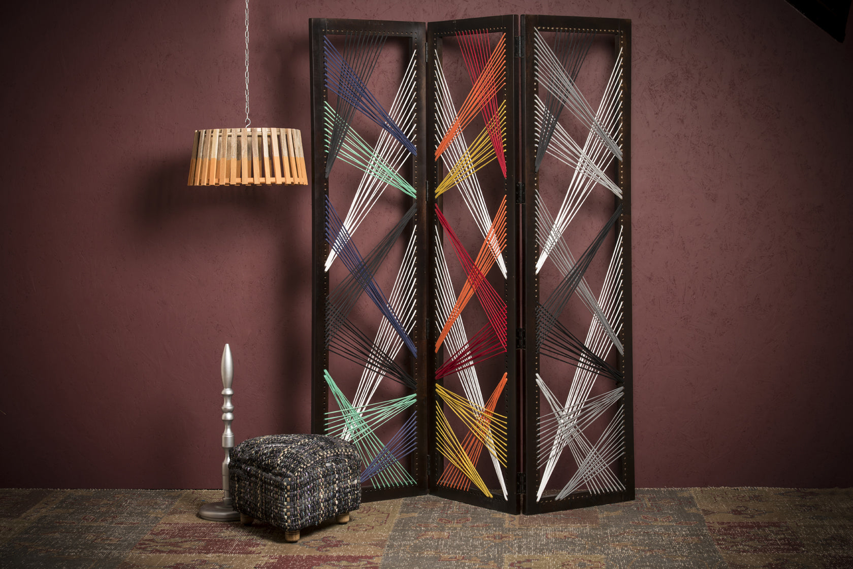Screen Gems Traverse Screen SG- 288, 61" x 72", The screen adds a lively, fun and creative modern flair to your home decor. Each panel is intricately woven with alternating colored reinforced string yarn elements resulting in an artistic screen. This screen is sure to be a point of interest and intrigue in your decor setting. The 3-panel screen frame is fabricated in sturdy mango wood with a smooth velvety black semi-gloss finish.