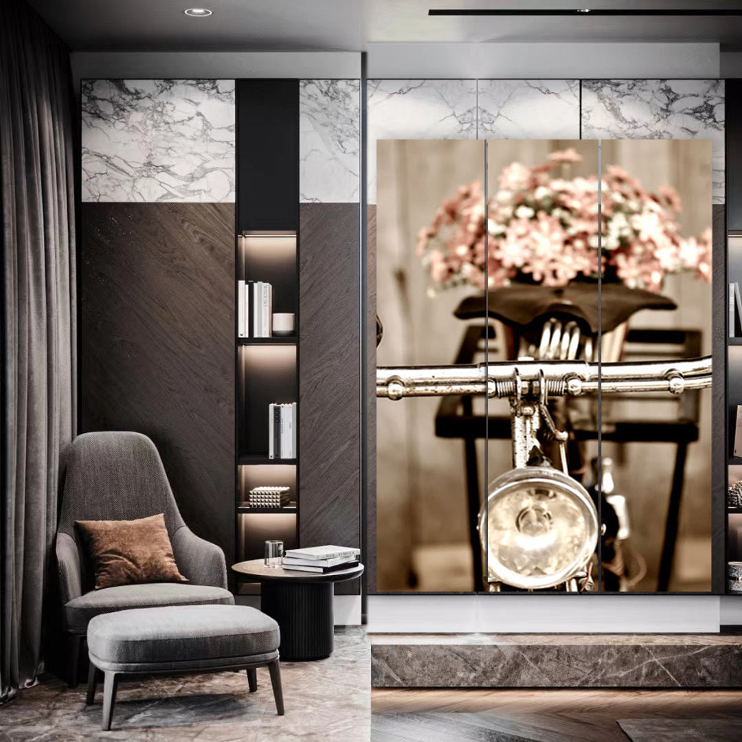 This is a 3 panel screen printed on canvas. The screen is two sided with different and complementary images on each side. It is light weight and very easy to move. The screen also has inspirational wall décor applications. This is a 3 panel screen printed on canvas. The screen is two sided with different and complementary images on each side. It is light weight and very easy to move. The screen also has inspirational wall décor applications.