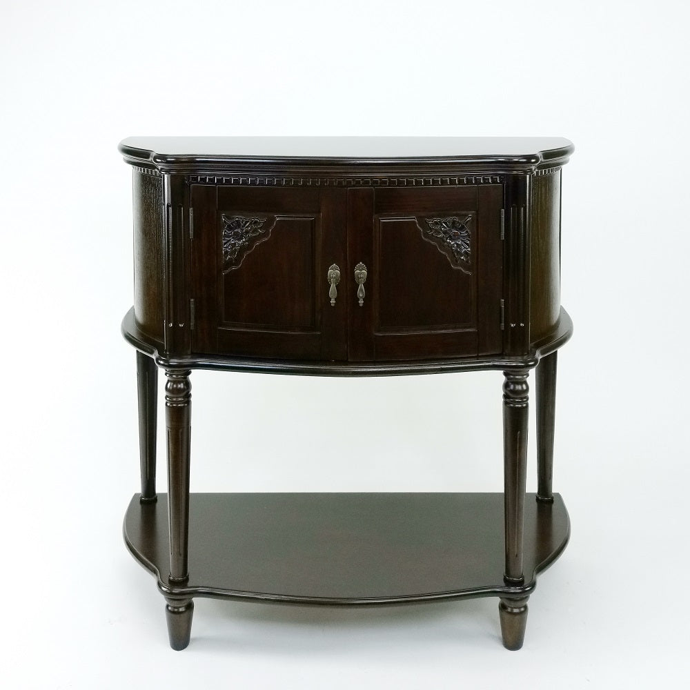 Enjoy this handsome classic versatile floral console in a variety of ways though out your home. This piece can be used in a dining room, as a companion behind a sofa or underneath a hanging television in a family room. The two doors open up to a spacious area that can house tableware for entertaining along with the open space shelf you'll have plenty of room to keep wine bottles or drinkware at hand on. In the family room, this piece can keep board games, game consoles, toys to keep out of sight or blankets to keep on hand for a binge night. This traditional looking console will soon become your next family heirloom favorite.