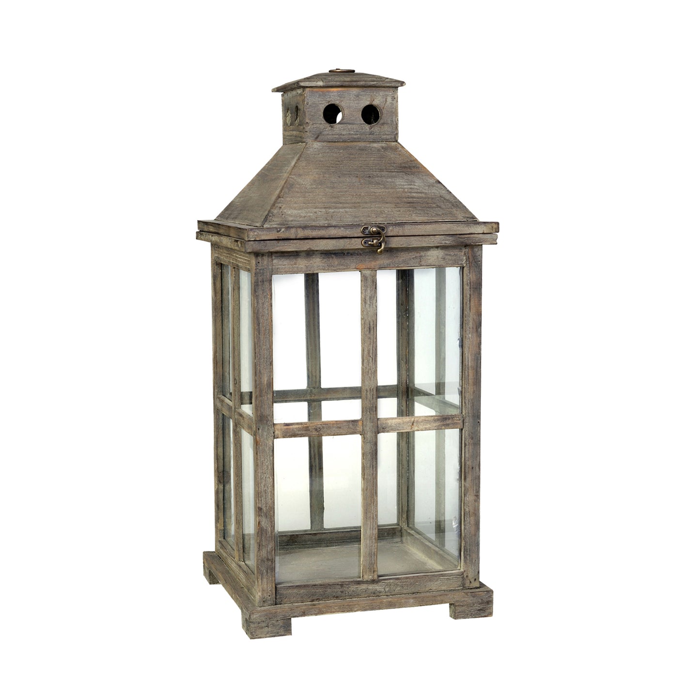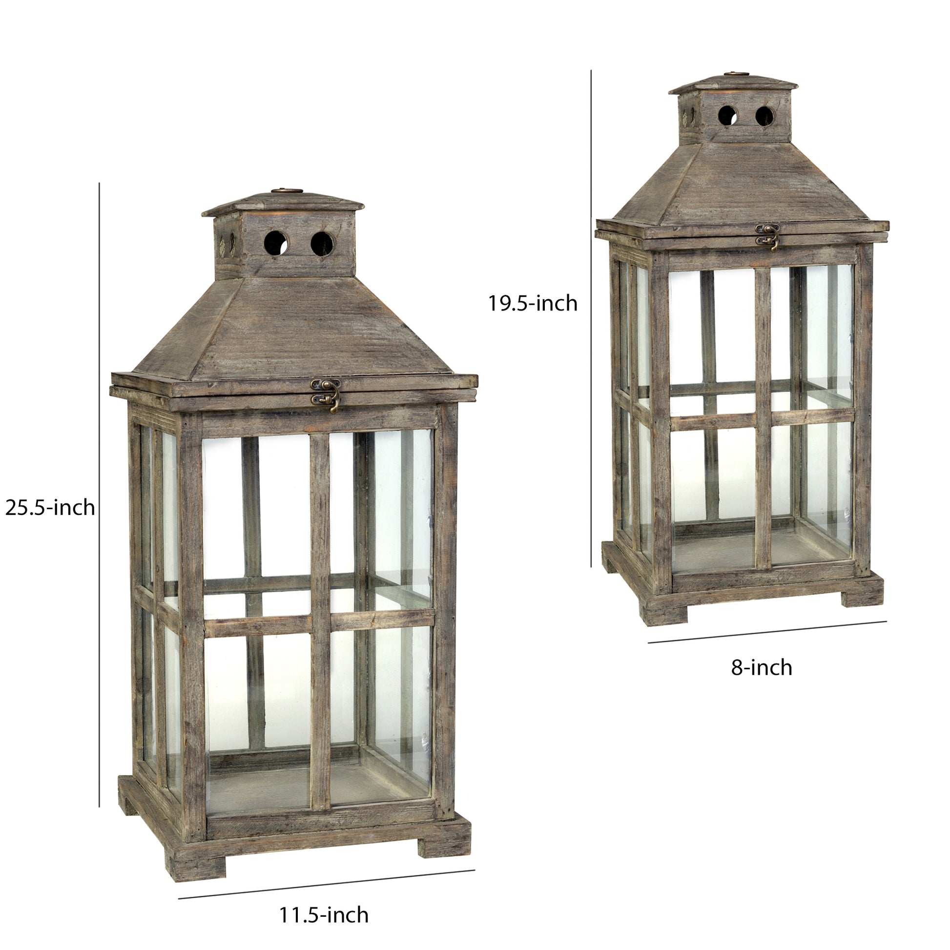 Light up your summer or winter nights with this Set of 2 traditional Lanterns that will bring a soft glow to your porch, patio, or poolside. The wood framing of these lanterns takes on the shape of a tall gazebo or airy temple and they are finished in a weathered texture to give the illusion of age. Just place you favorite candle inside these Lanterns and create an inviting atmosphere for your special indoor or outdoor area.