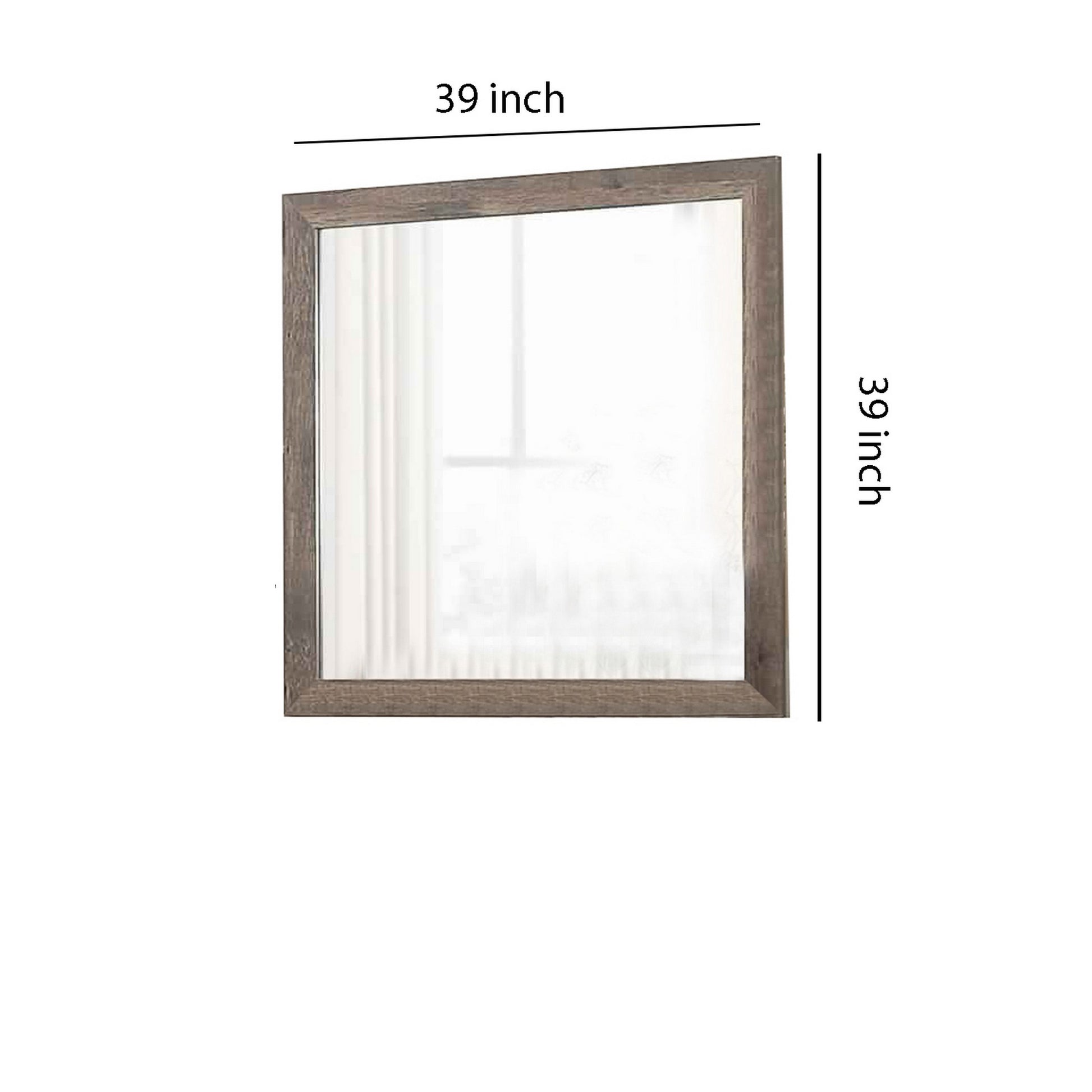Glorify your home decor with the addition of this rustic style Mirror, constructed sturdily from solid wood, faux veneer and engineered wood in rustic brown finish. It features a square frame with rough hewn saw texture that imparts an appealing character to it. The wall mounting hardware on the back offers effortless installation.