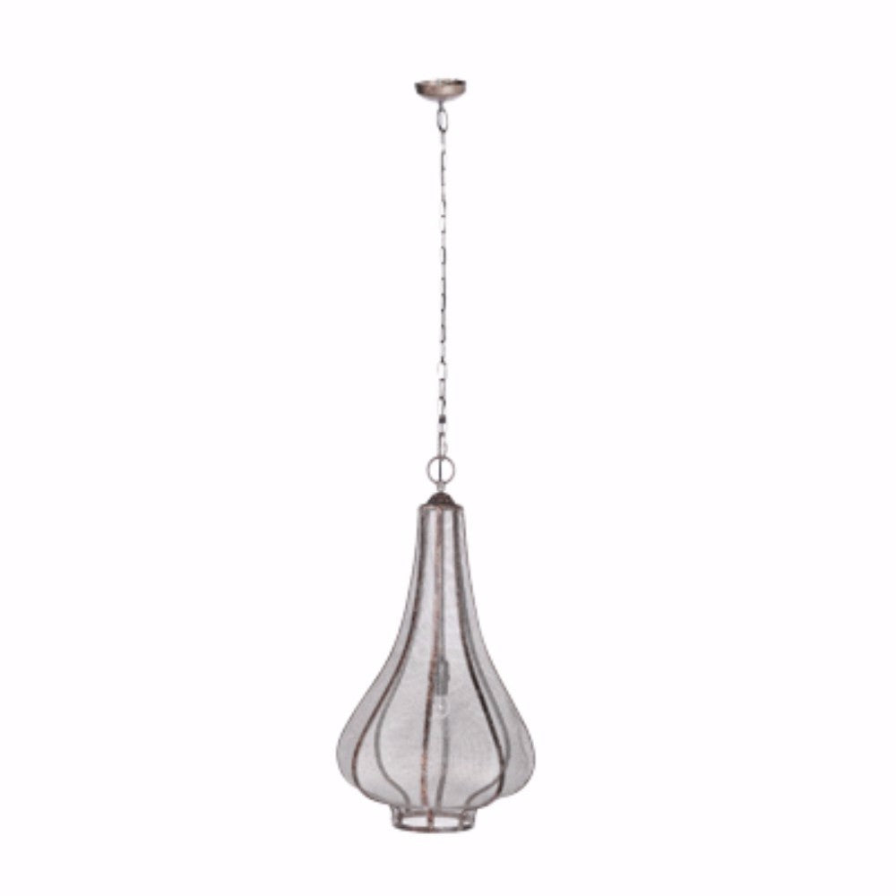 This gorgeous lantern shaped Iron Hanging Light Fixture looks wonderful and adds up the charm to any Decor setting. It has a beautiful thin net based design with a ring like a chain on top, providing the great fit to the ceiling. It features clear glass and one light bulb.