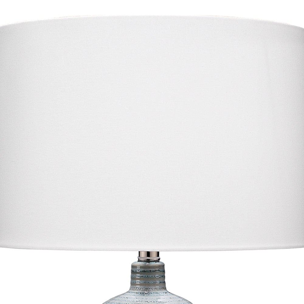 Illuminate your space in style with this table lamp, crafted from ceramic in glaze blue finish. It strikes an cylindrical silhouette with a white fabric drum shade that rounds out the design. It is functionalized by a 3 way intensity switch and accommodates an E26 bulb base, brings a touch of transitional appeal as it offers a boost of brightness.