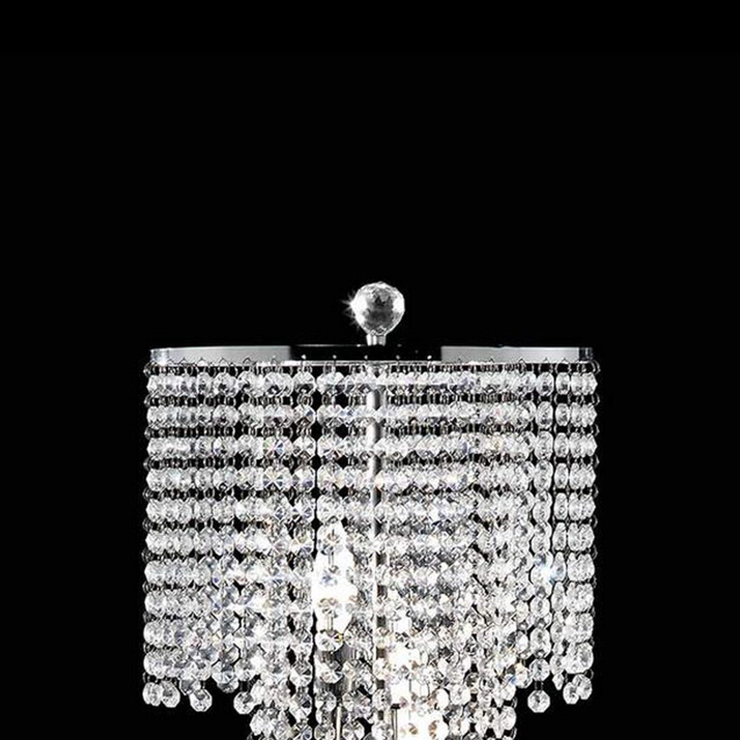 Dress up your entryway or living room with this classy table lamp. It features a round metal frame with tapered design drop crystal accents and beads on a sleek tubular support. With elegance and style, this ceiling lamp is the perfect addition to any modern home.