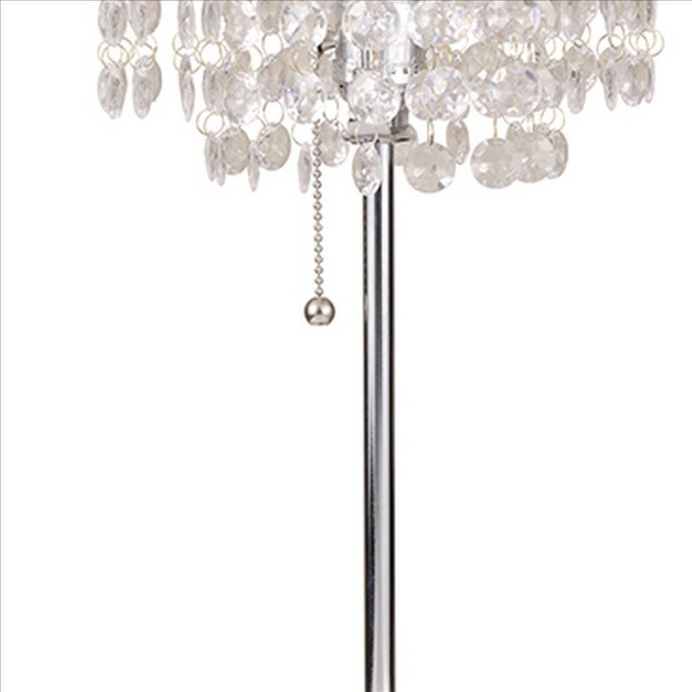 With a stalk design metal body, it has hanging crystal beads which grants it a glamorous appeal. The round shaped base lends stability and support. Pull chain switch adds to the functionality. It requires 40W type A bulb to function effectively.