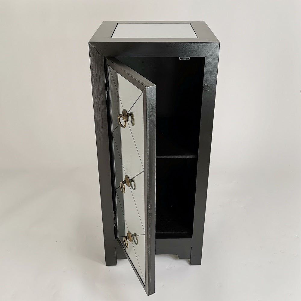 This is an elegant way to add extra space with this functional pedestal. With the one mirror door that opens up to a single sturdy shelf. The mirror is laid inside the lacquered wood and is wrapped around the whole pedestal.