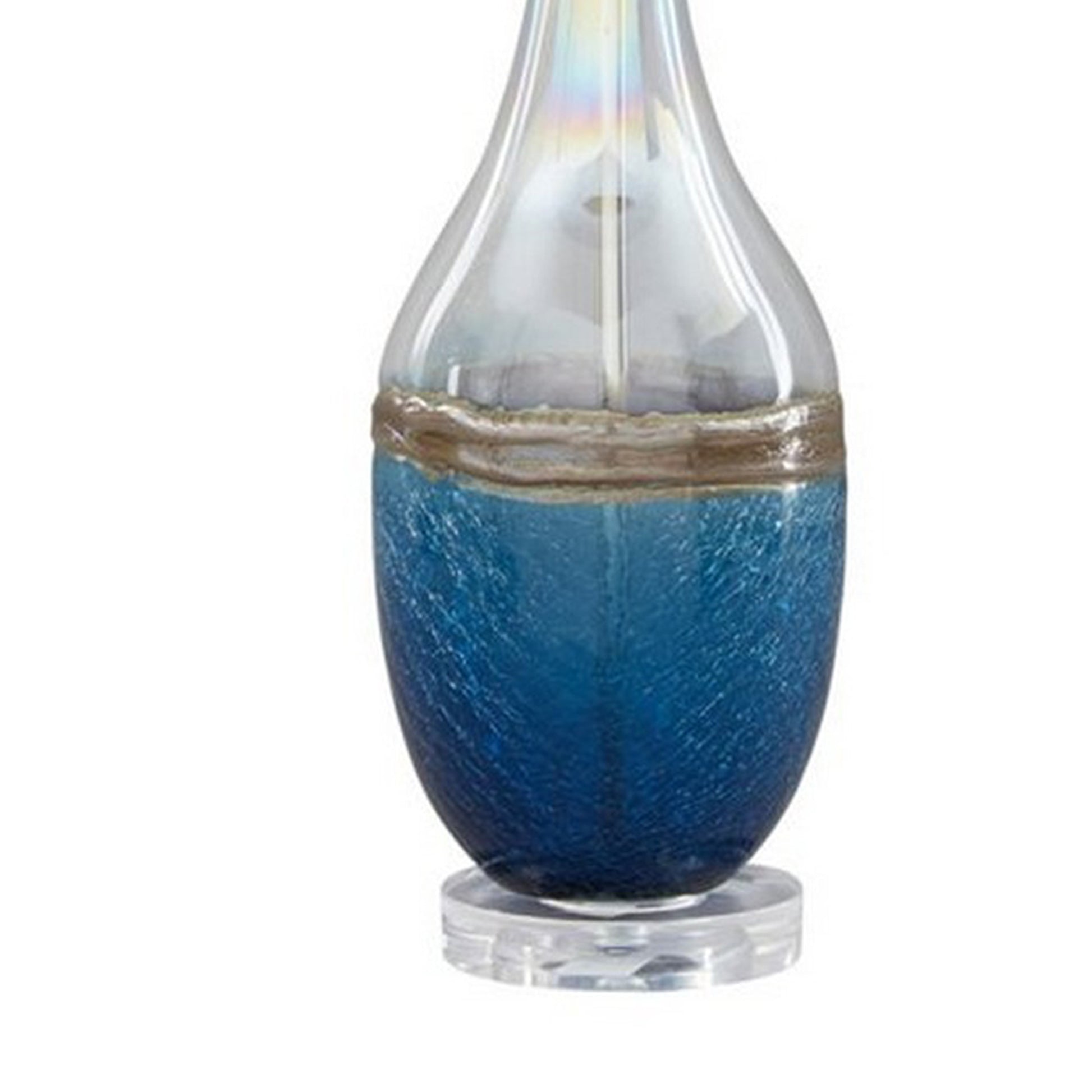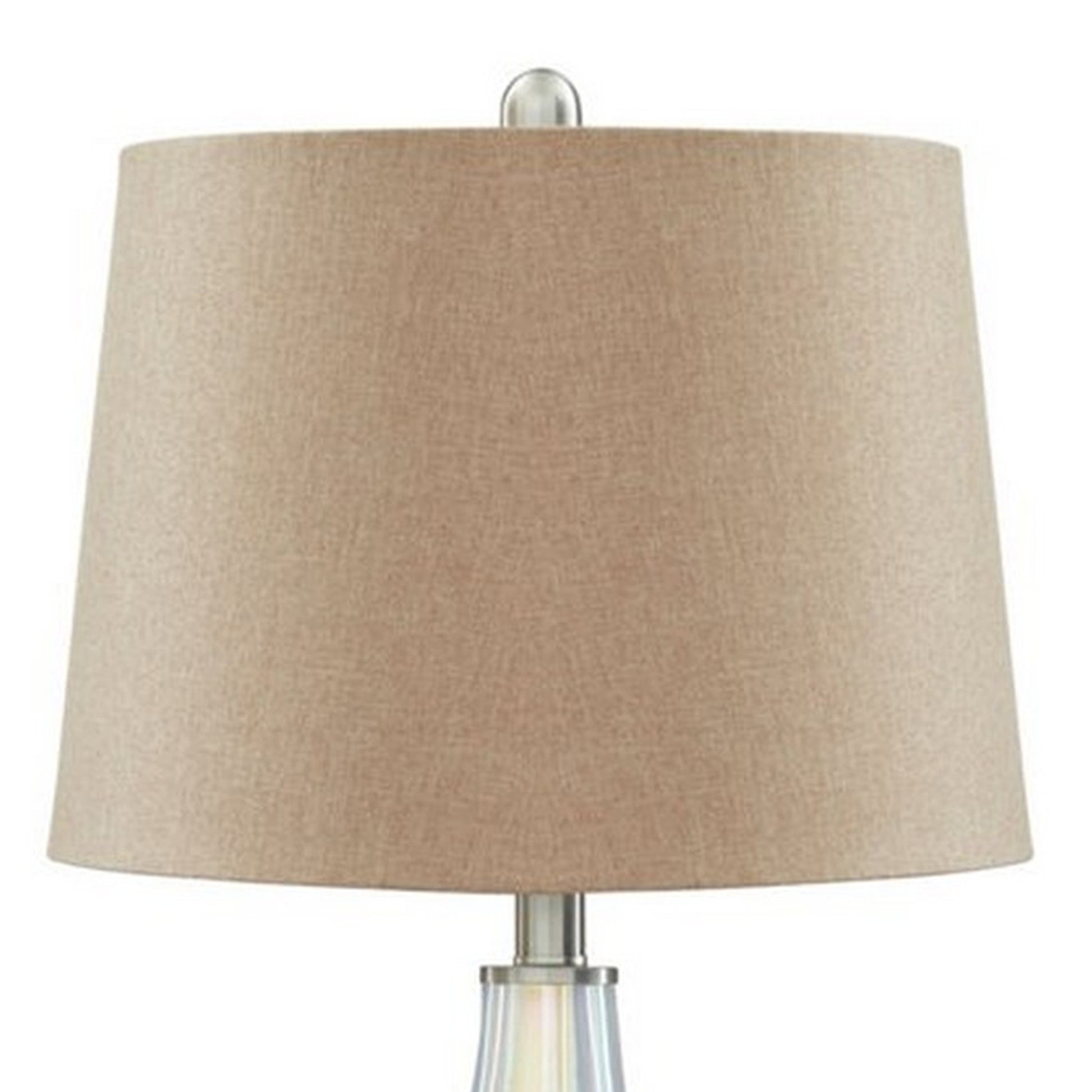 Emblaze your existing decor setting by bringing in this contemporary Table Lamp which comes with textural ocean blue accented glass frame with sandy brown band. Wrapped with beige color fabric, it will be a perfect addition to your place.