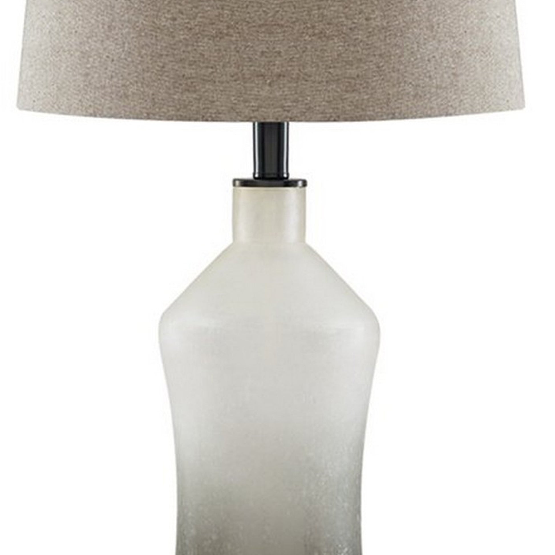 Emblaze your existing decor setting by bringing in this contemporary Table Lamp which comes with a drum shade and rests on a vase shape glass base which showcases ombre effect. Wrapped with gray color fabric, it will be a perfect addition to your place.